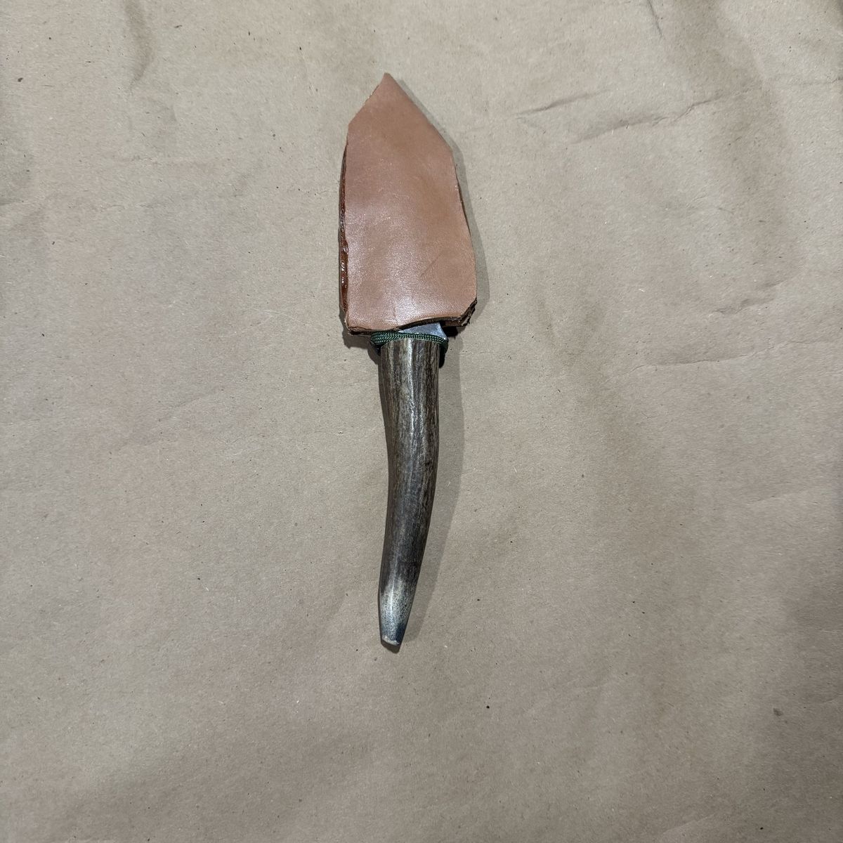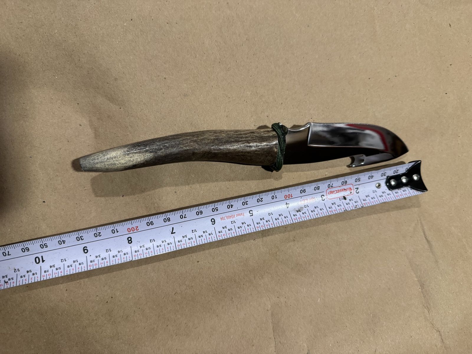 Custom hand made with antler handle. Has leather cover. Overall size is 8.5"in with 4"in hook blade.