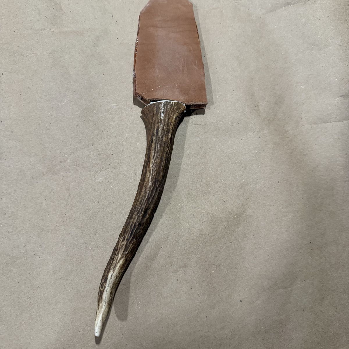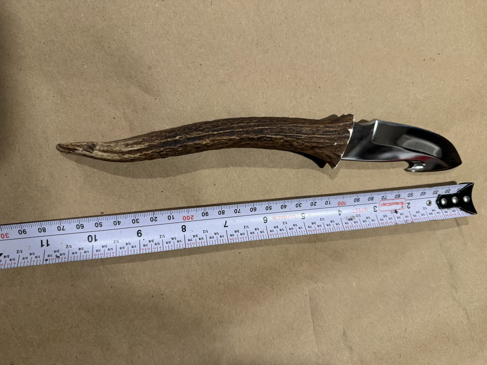 Custom hand made with antler hilt. Has leather cover. Overall length is 10.5"in with a 4"in hook blade.