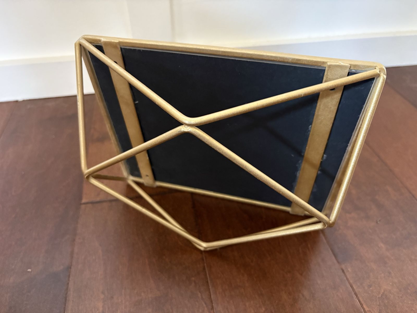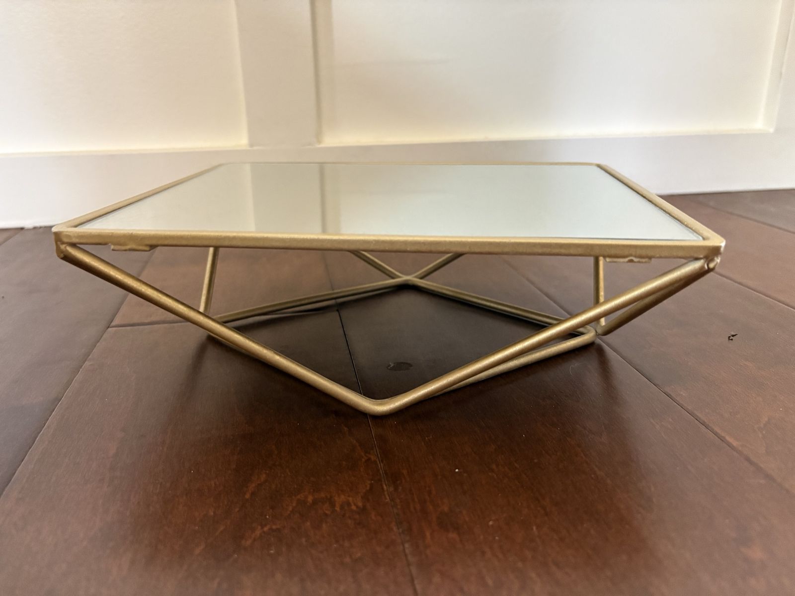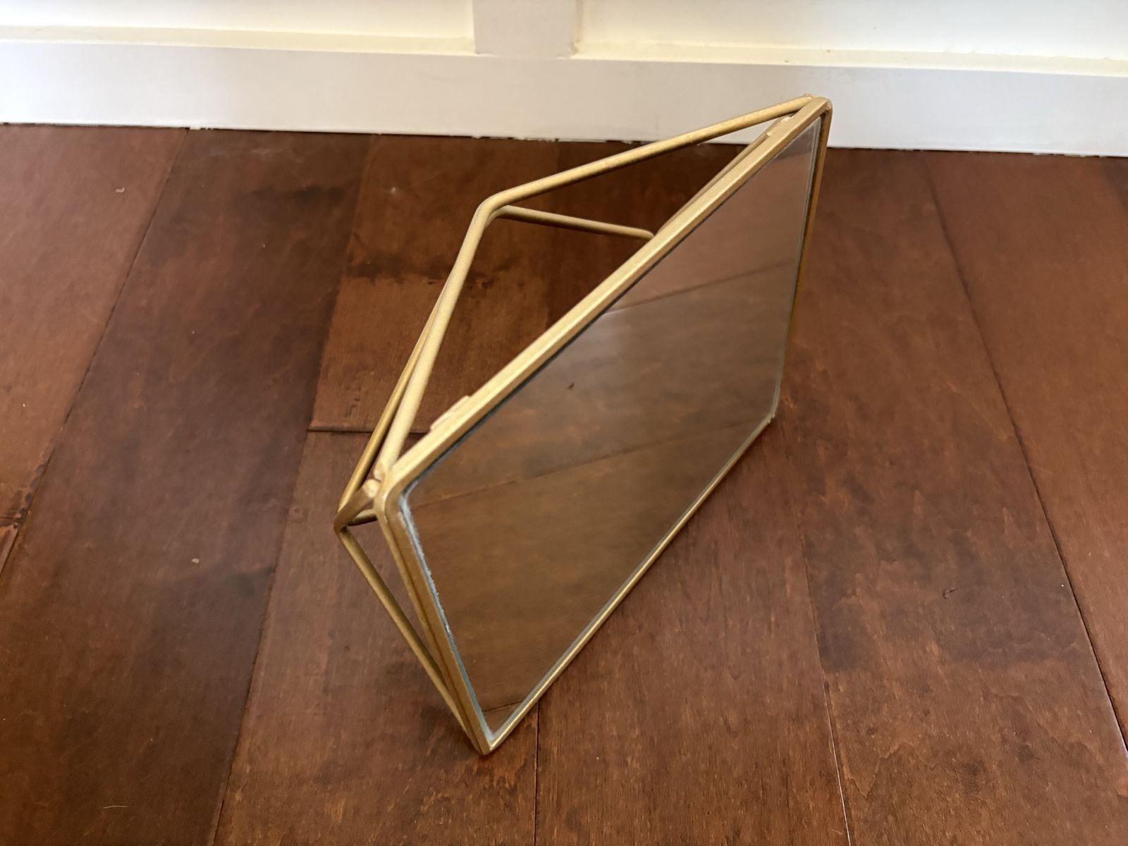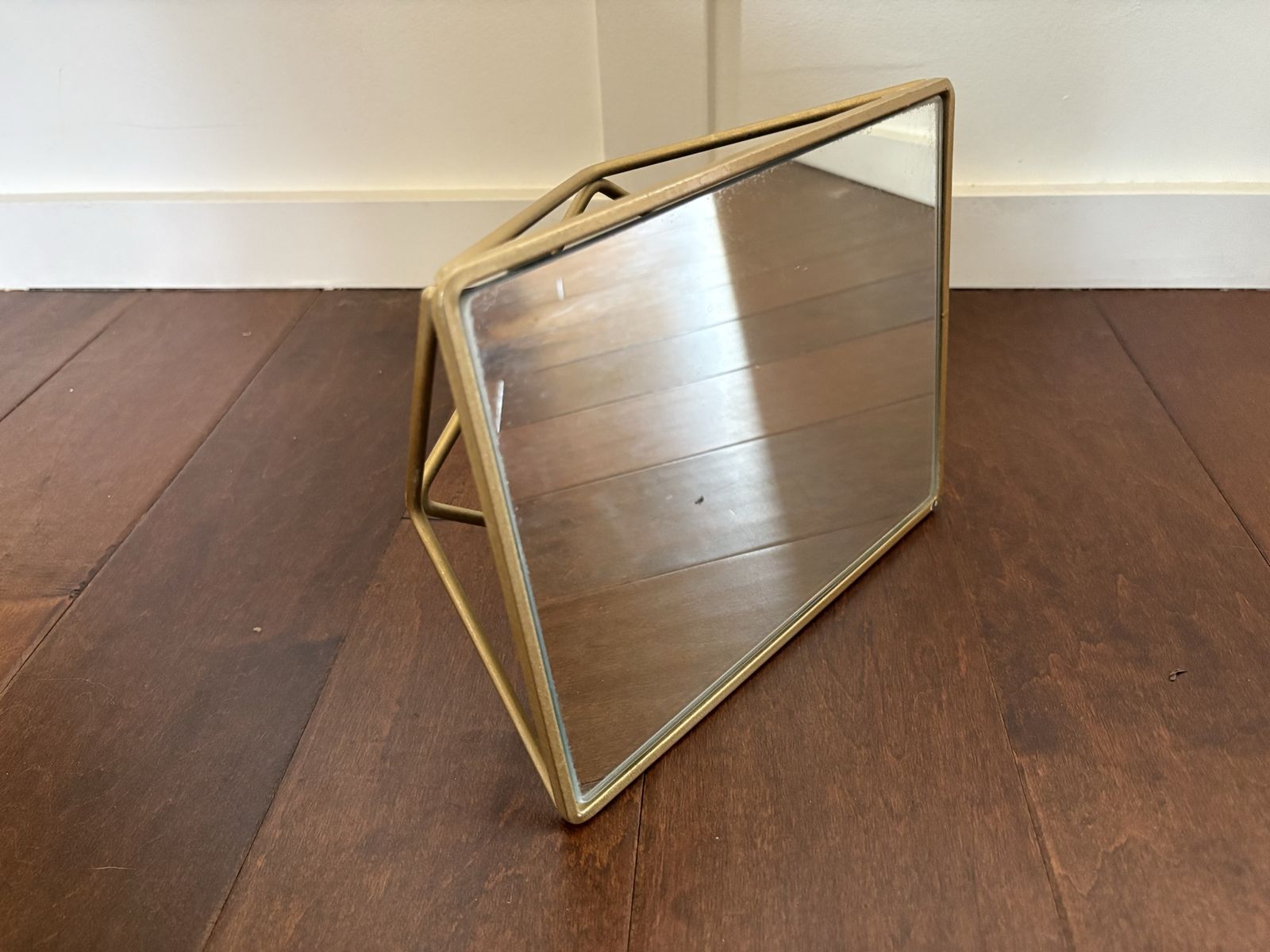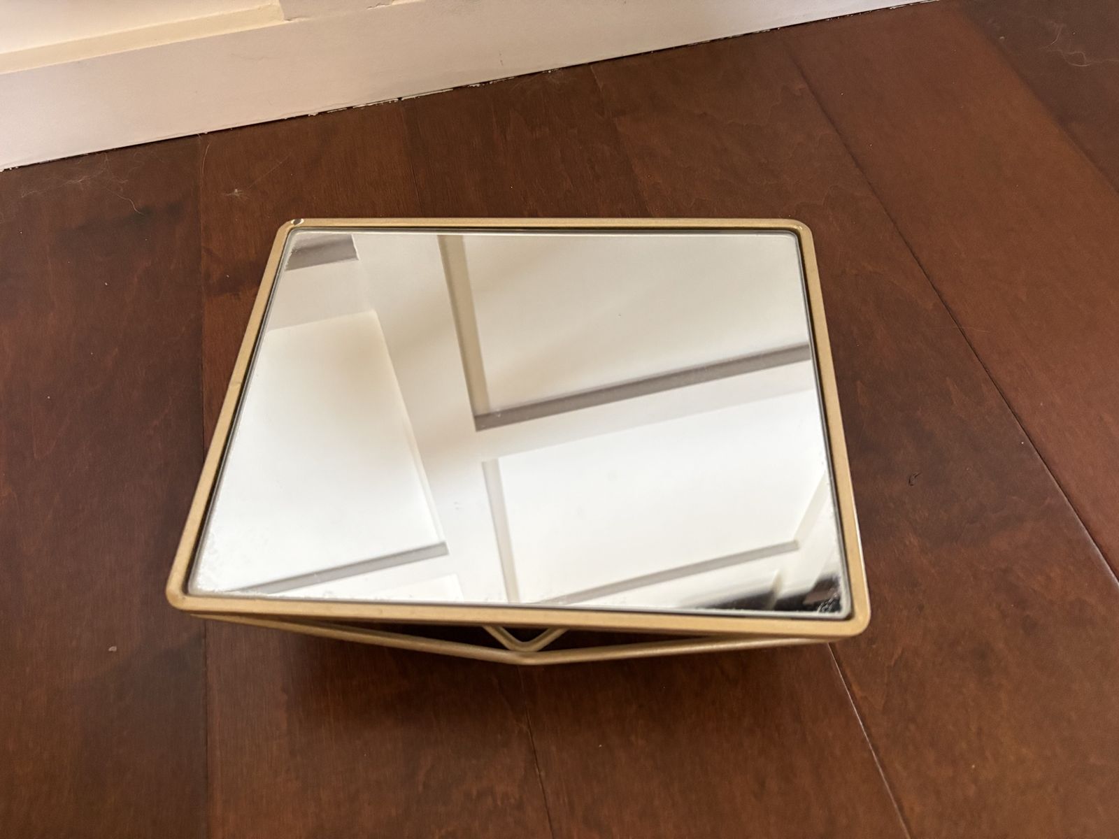 I have a small rectangle mirror with rounded edges. It sits on a geometric gold metal stand so that it can be a raised tray for perfume or things on a vanity or dresser. It is also shaped so that it can stand upright and looked into. It is 9 1/2 inches by 7 1/2 It is 3 inches tall when laid on its back like a tray. See my other ads for jewelry, artwork, home decor and more.