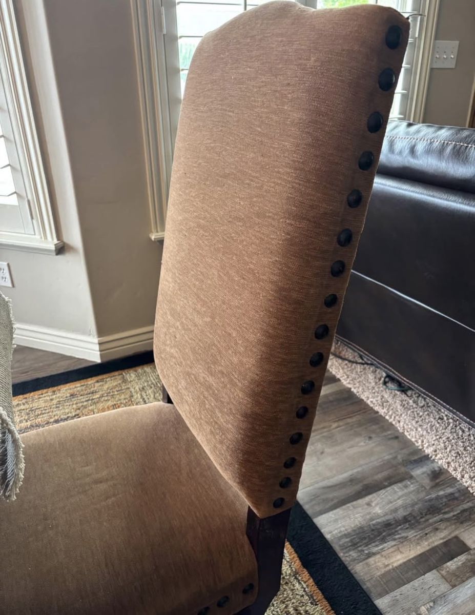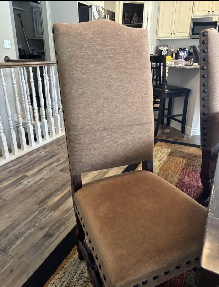 Black/Brown kitchen table with 6 high back fabric chairs