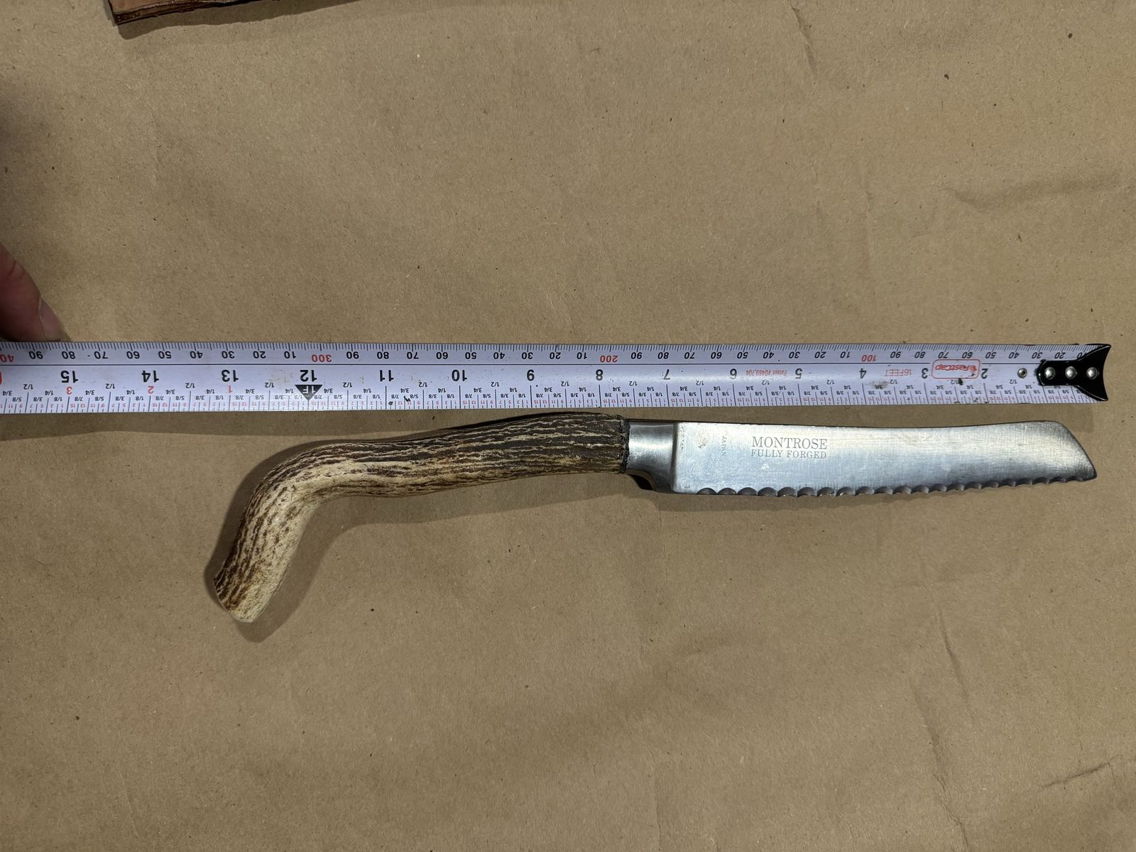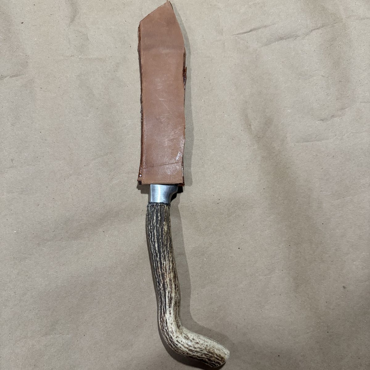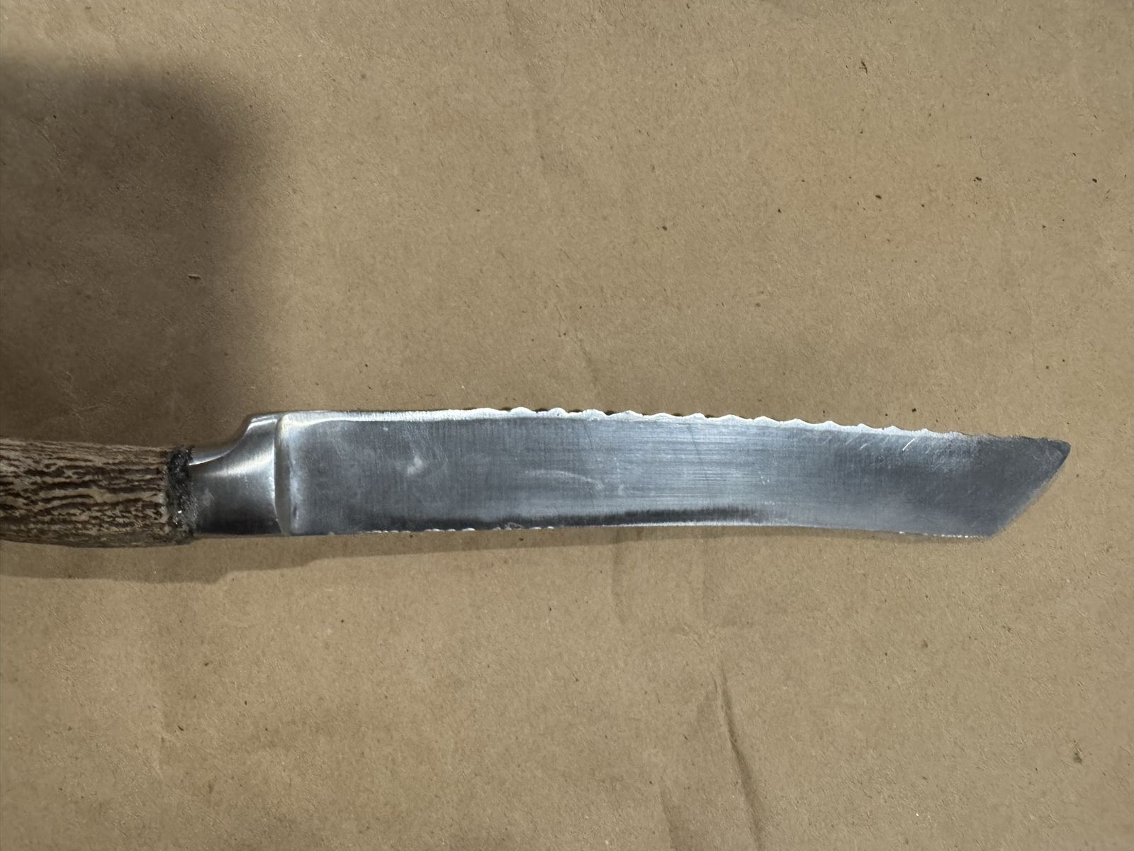 Custom hand made with antler handle. Must be washed by hand. It is just under 14" in overall length with a 7.25"in blade.
