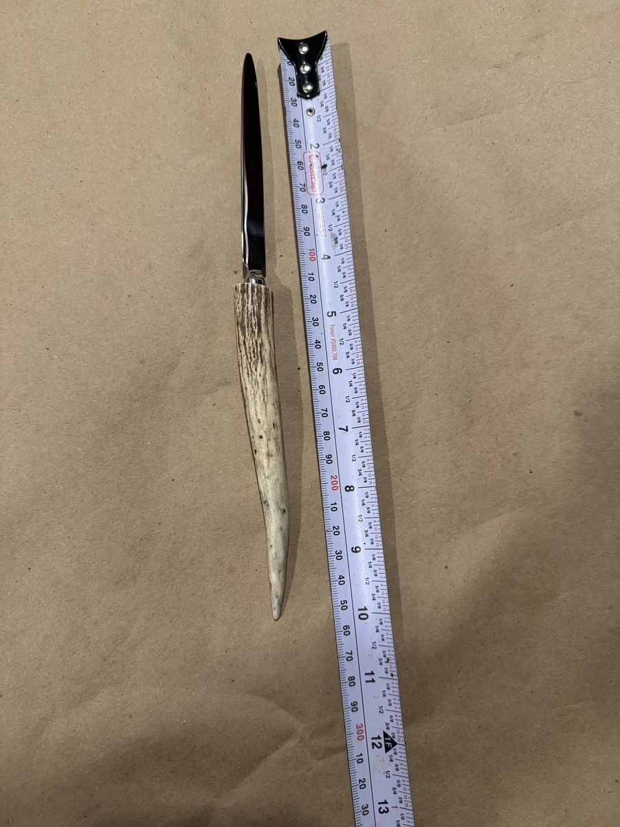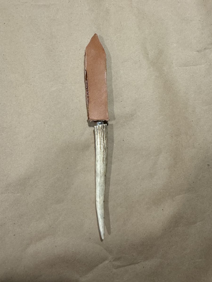 Custom hand made with antler hilt. Has leather cover. Overall length is 9.75"in with 4"in soft blade.