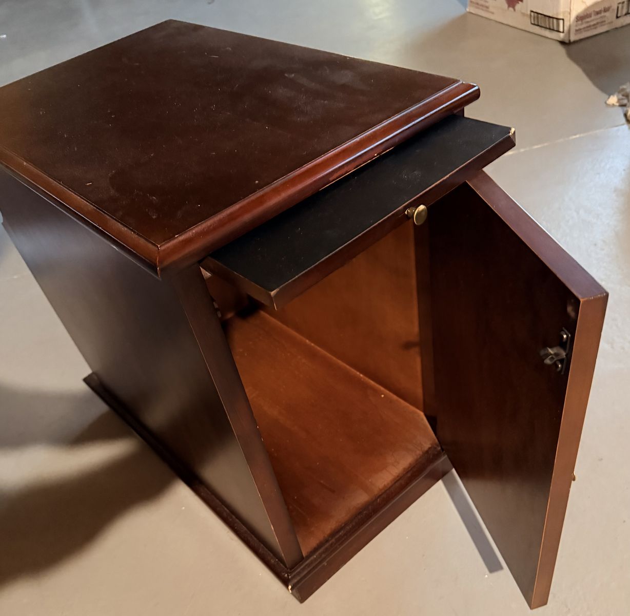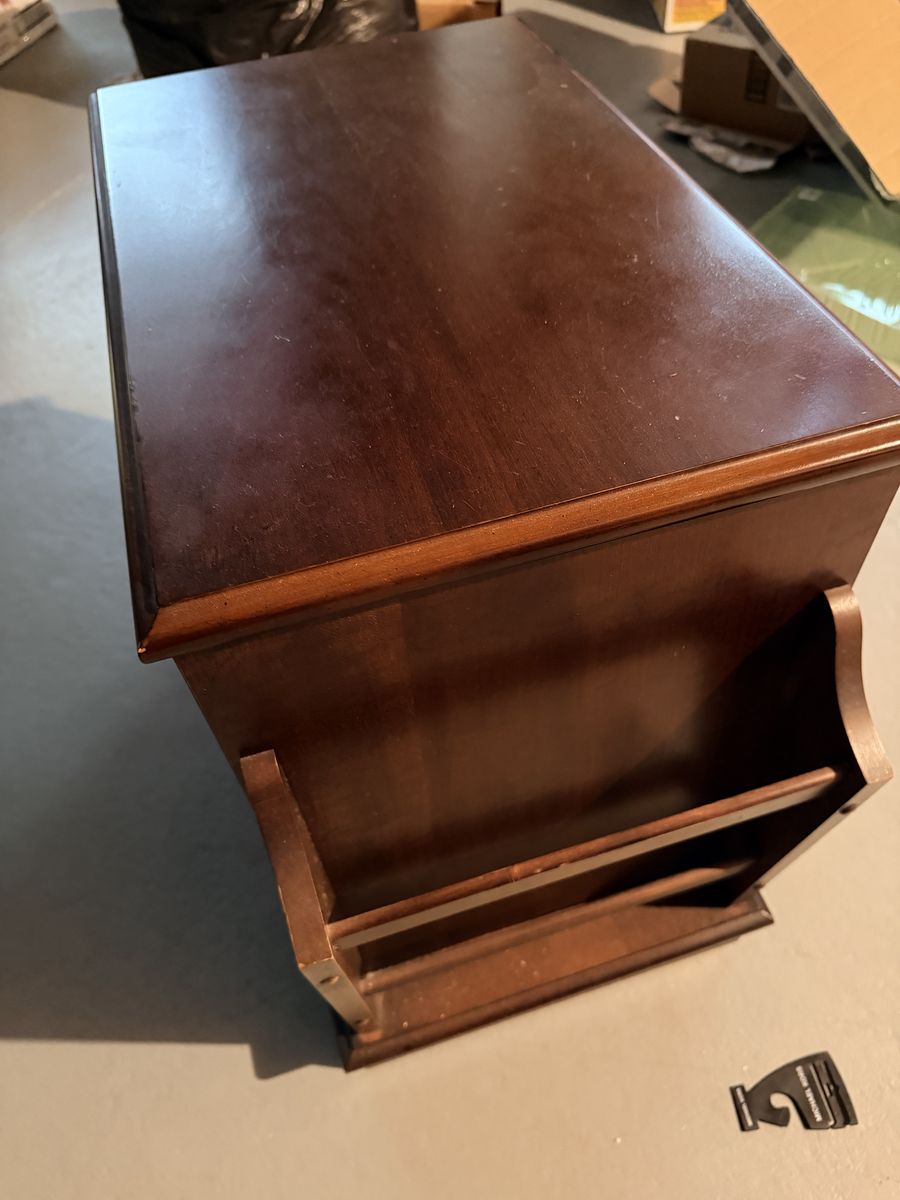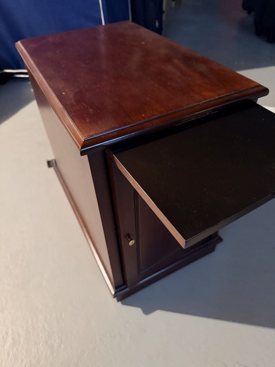 Vintage-Mid-20th Century cabinet/side table in a cherrywood finish. Magazine rack on the back, storage area with an arched door and an upper pull-out tray to hold the remote or a beverage & snack!