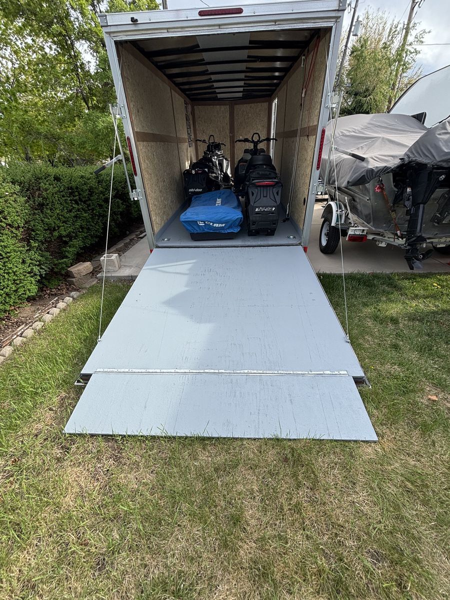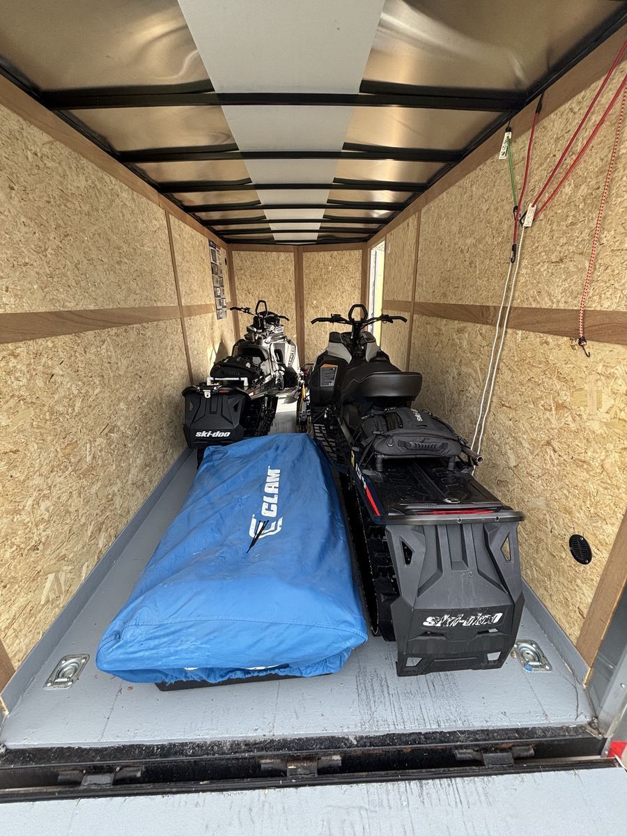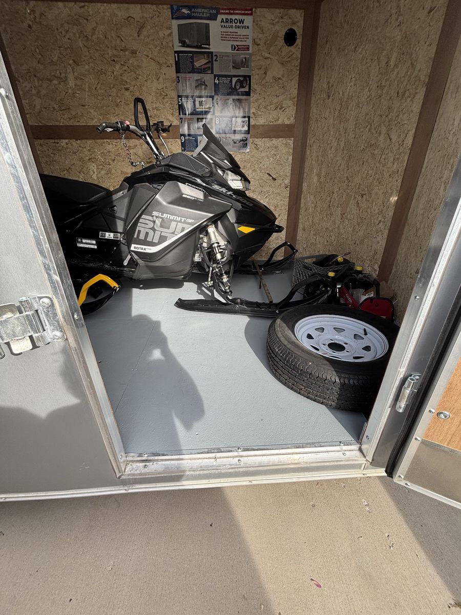 Like new, excellent condition. Textured exterior deck coating floor, electric jack, tires/spare excellent condition, four tie down locations. Used only one season to haul snowmobiles.