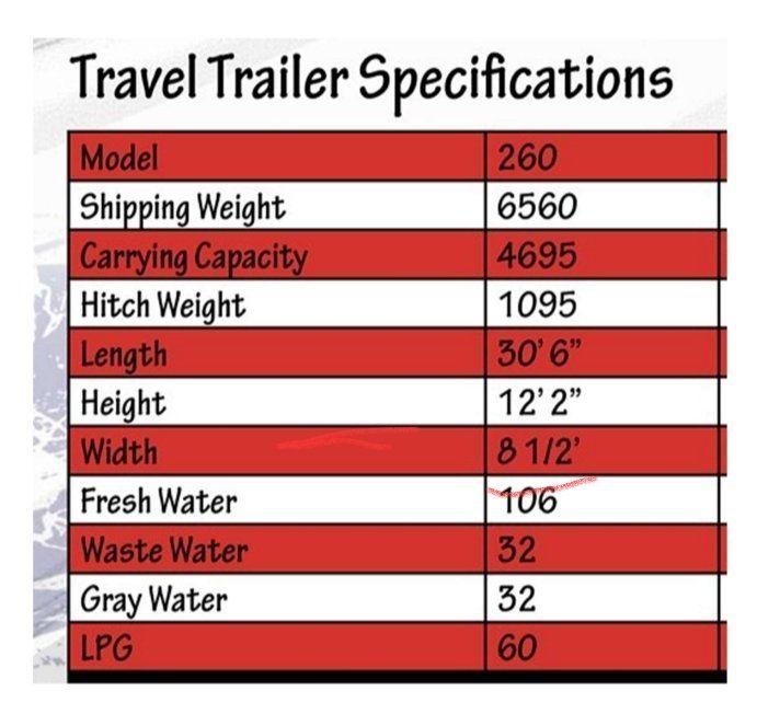 Length: 30’6” (26’ box) Height: 12’2” Width: 8.5’ Sleeps: Up to 8 No slides (lighter tow, less maintenance) Dry Weight: 6,560 lbs Cargo Capacity: 4,695 lbs Hitch Weight: 1,095 lbs