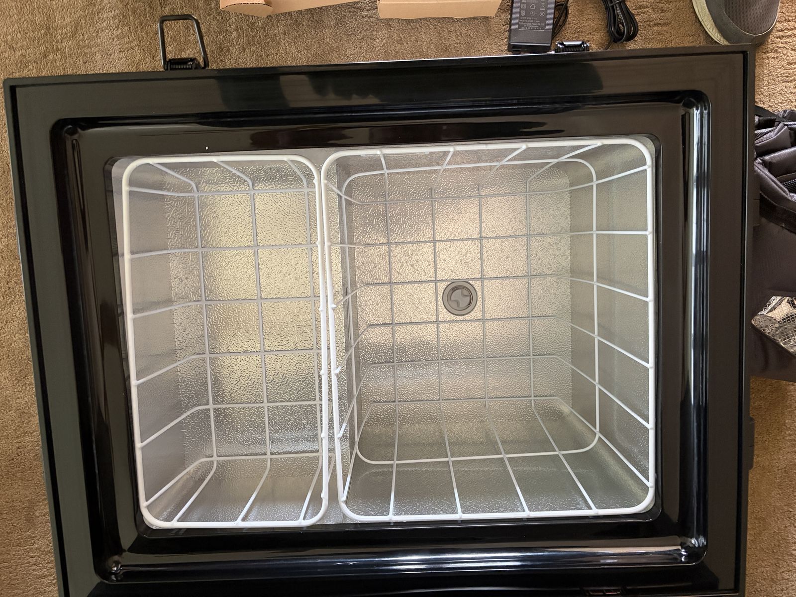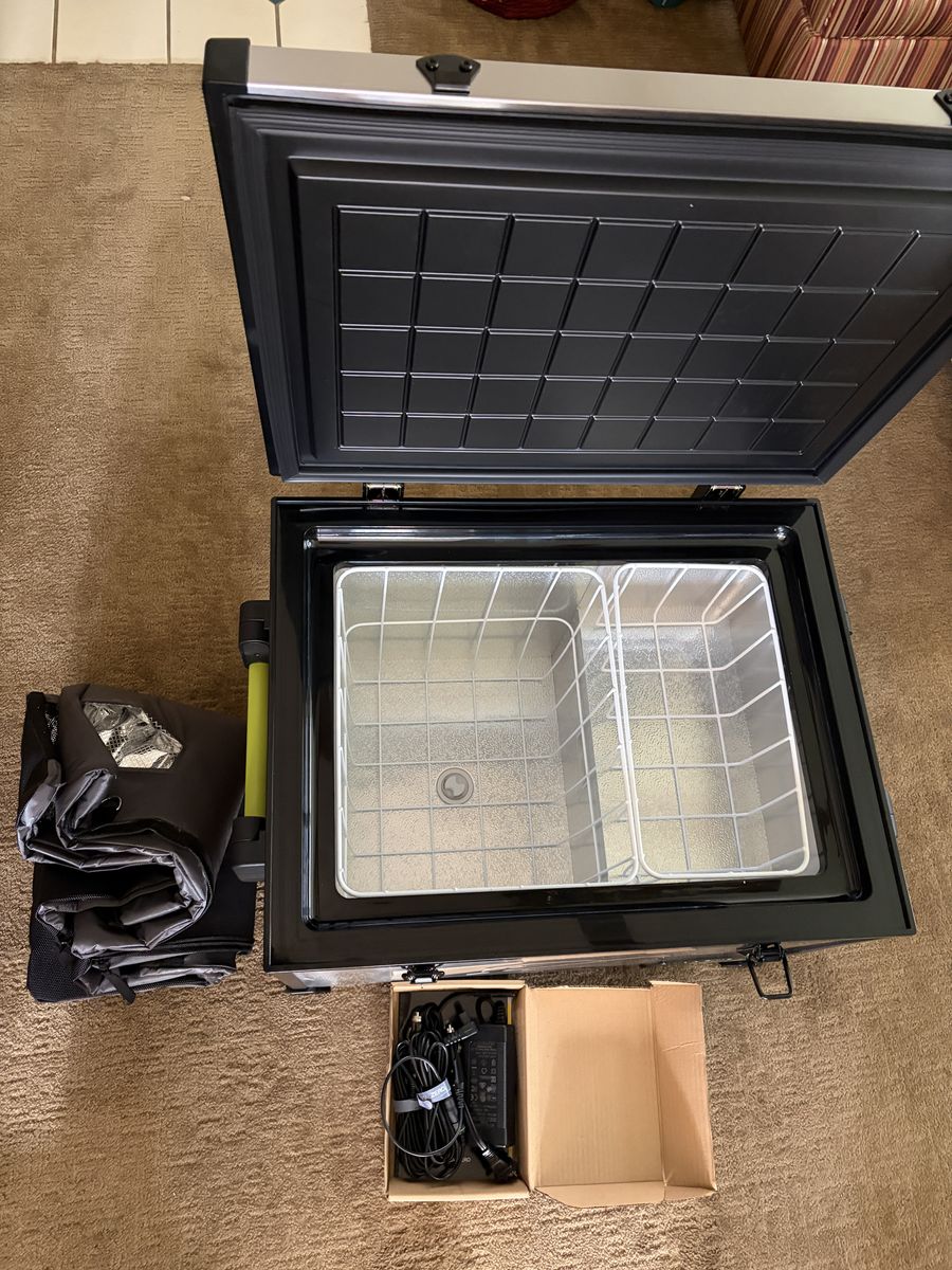 Goal Zero Alta 50 portable refrigerator/freezer. Brand new; only run once just to make sure it worked. Includes: cords for 12-volt and 120-volt AC operation; wire baskets for compartments; insulated cover; instruction manual. Bluetooth operation with app.