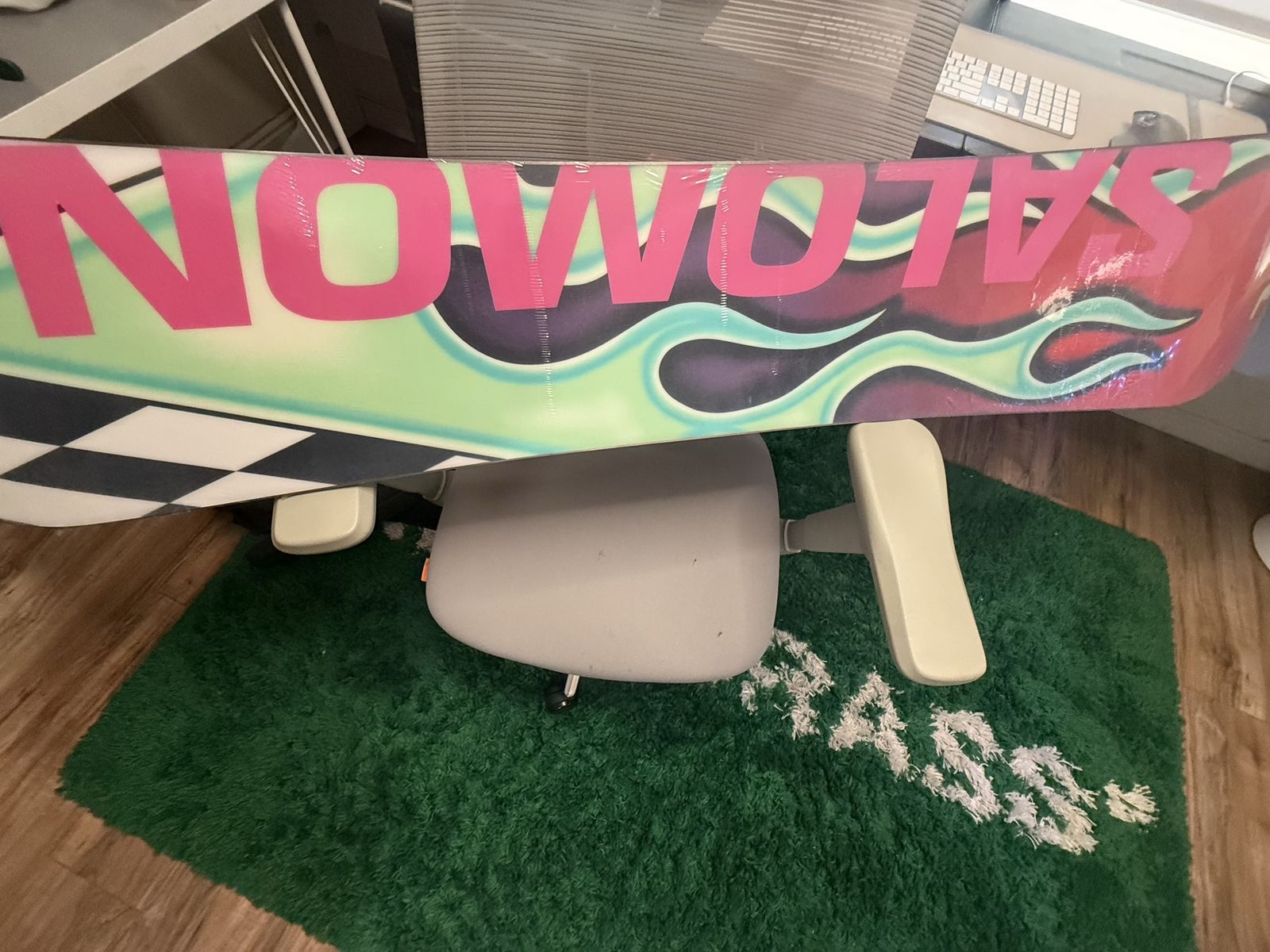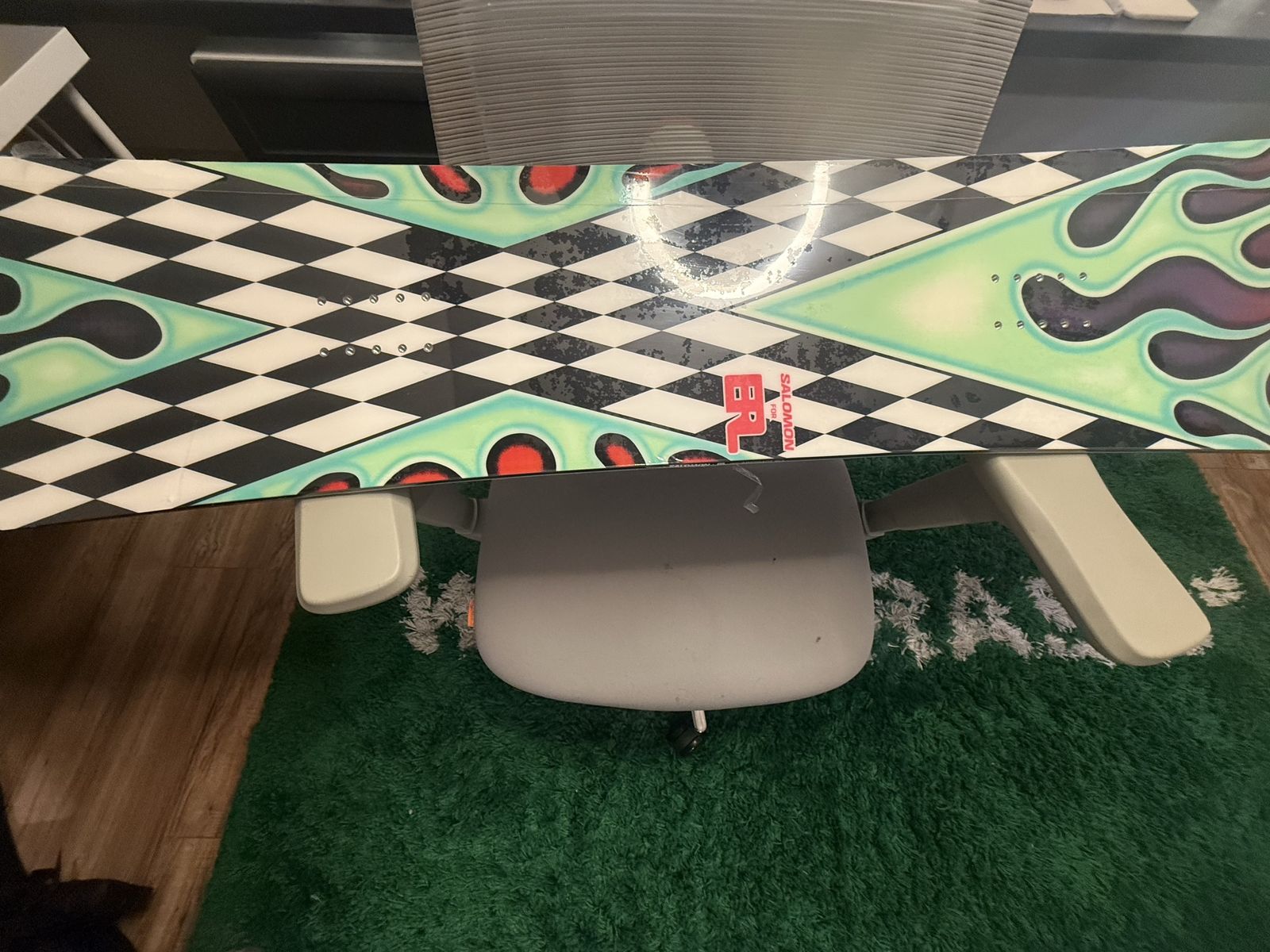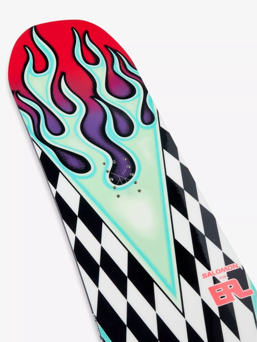 Limited Edition Collaboration ERL X Salomon flame-print snowboard primarily comes in a 153cm length, featuring a true twin shape, camber underfoot, and a medium flex, designed for riders weighing around 55-75 kg (120-165 lbs), with specific widths of 295mm (nose/tail) and 250mm (waist) for that size, fitting S/M bindings, though other models might vary. Key Specs for the 153cm Model: Length: 153cm Width: 295mm (Nose/Tail), 250mm (Waist) Profile: Camber underfoot, flat at waist, rocker at ends Flex: Medium Rider Weight: 55-75 kg (approx. 120-165 lbs) Binding Size: S/M
