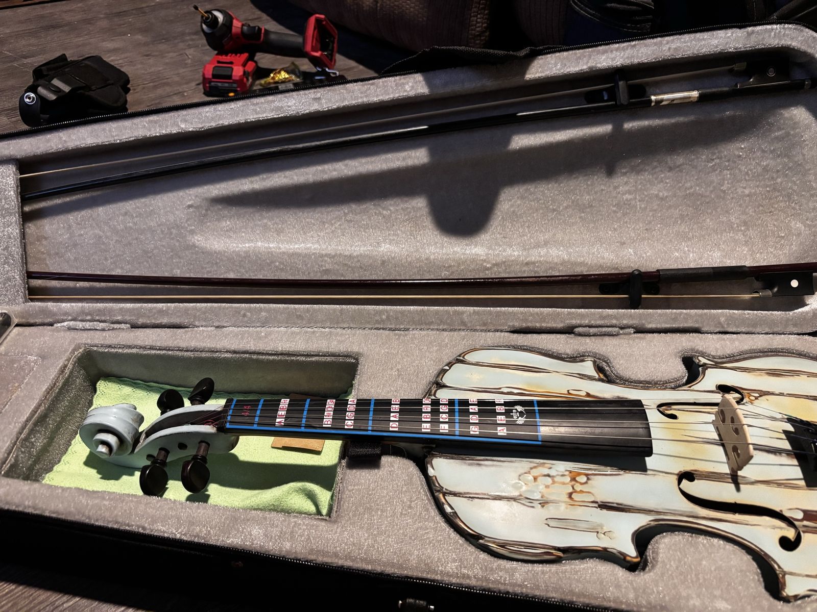 I have this violin I don’t have a use for, it comes with two bows, two things of rosin, a tuner, and a hard case.
