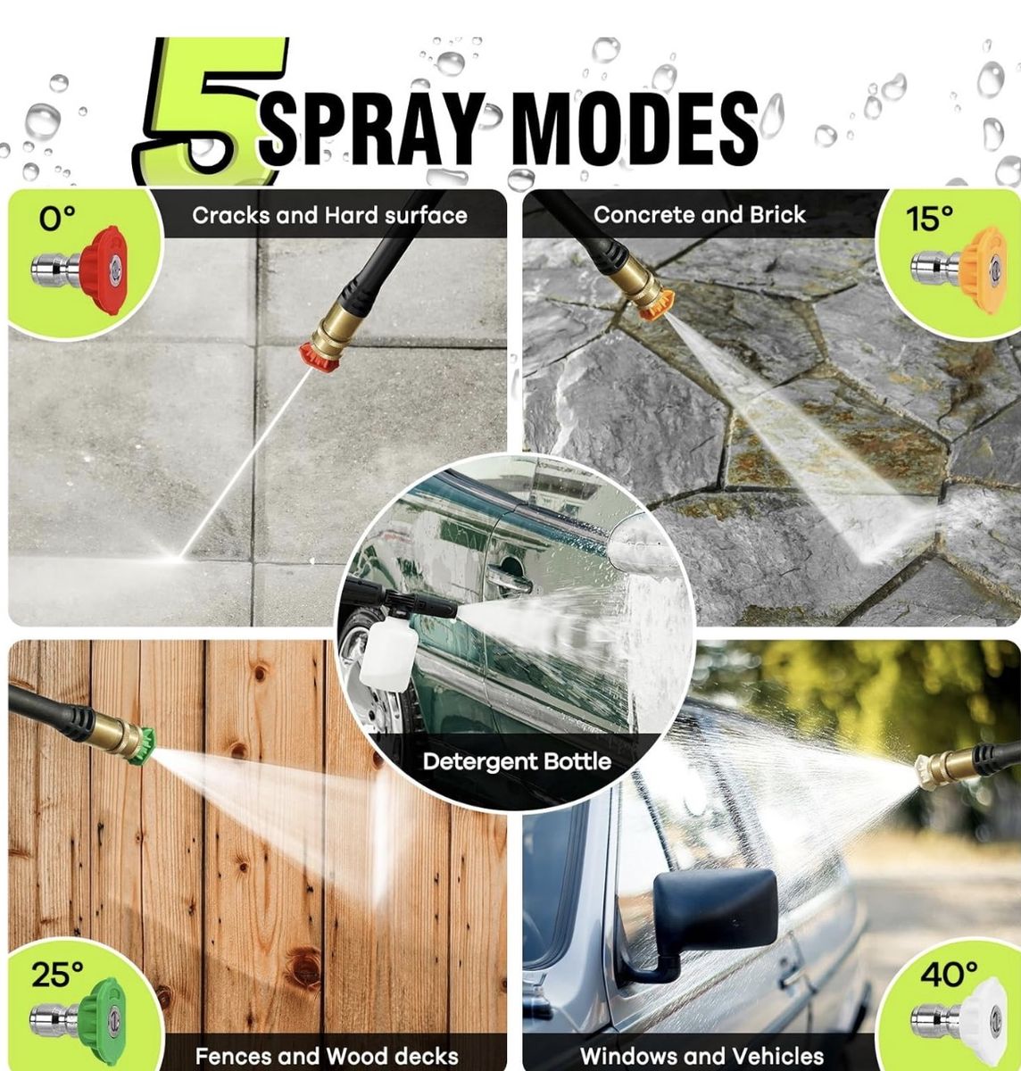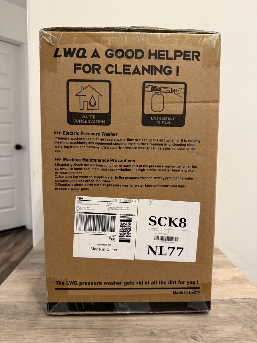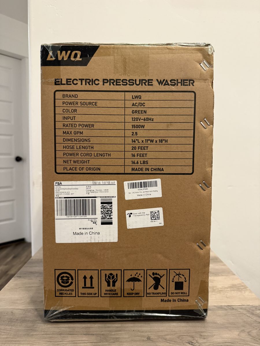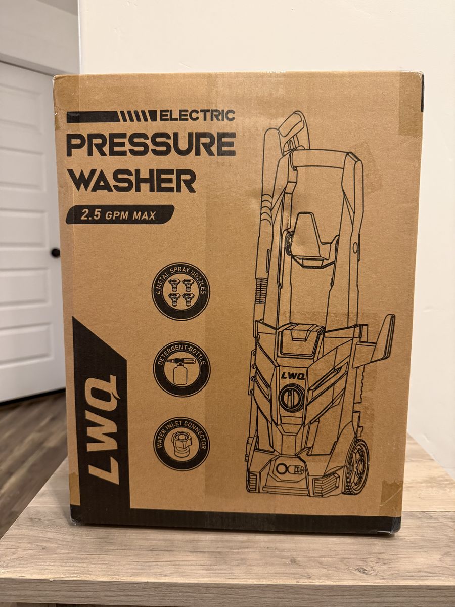 VenmoElectric high pressure washer. LWQ brand. 2.5 GPM with five spray modes. Handle has safety lock to prevent accidental spraying. Portable and compact for easy storage. Never been open or taken out of box.