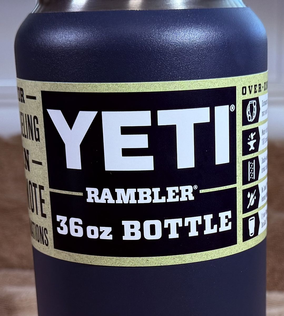 Zelle**Brand new yeti 36 ounce rambler bottle.**It's navy blue color. Dishwasher safe, made of stainless steel, double wall vacuum insulation keeps things cold, no sweat design keeps your hands dry. $45