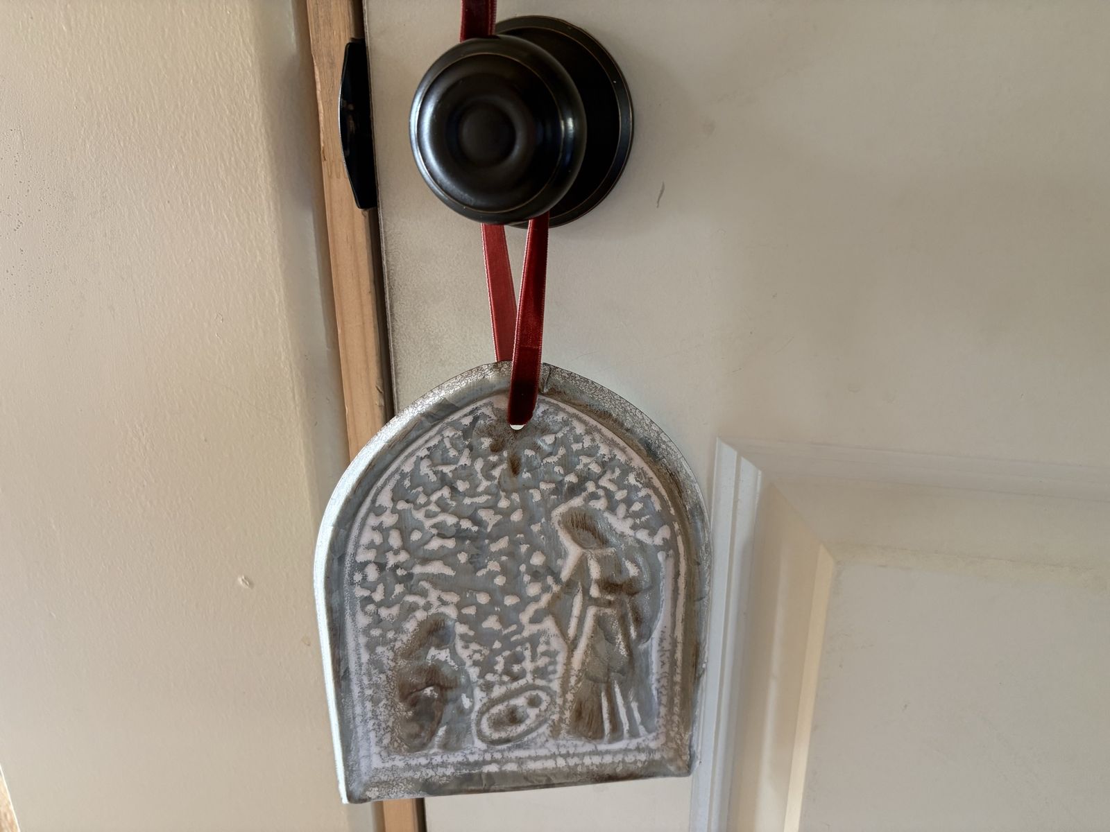 I have a large metal ornament with a raised nativity scene. It has a dark red velvet ribbon hanger. It is 7 1/2 inches tall and 6 inches wide. It has a 3 1/2 inch hanger. See my other ads for jewelry, artwork, home decor and more.