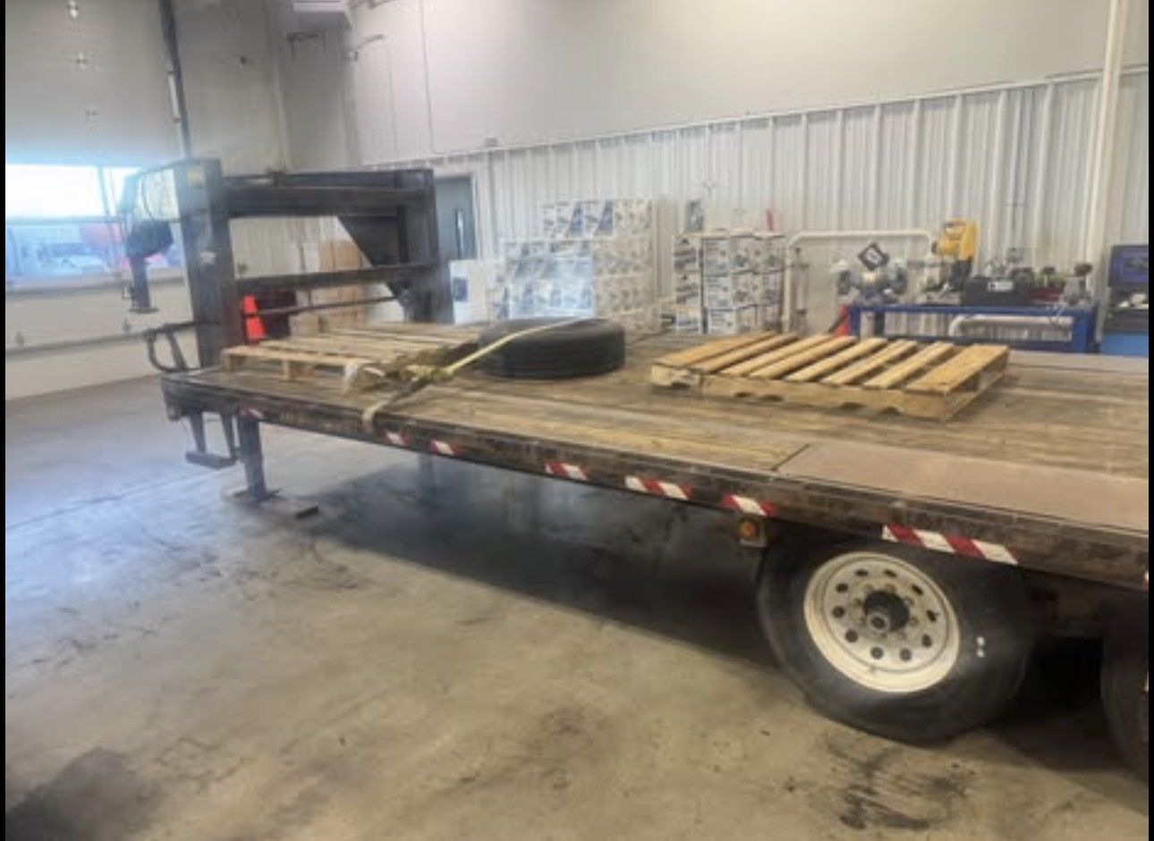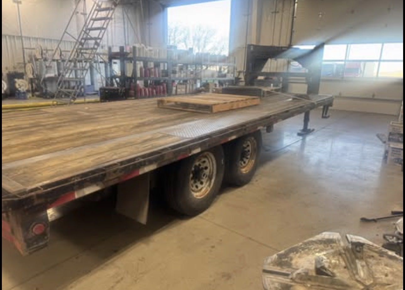 Big Tex gooseneck flatbed trailer for sale. Solid work trailer. 25’ • Tandem dual axle setup (heavy-duty) • Wood deck in good usable condition • Straight frame, no bends or structural damage • Lights and wiring working • Good tires overall / have 4 new ready to be installed • Gooseneck hookup • Clean title in hand