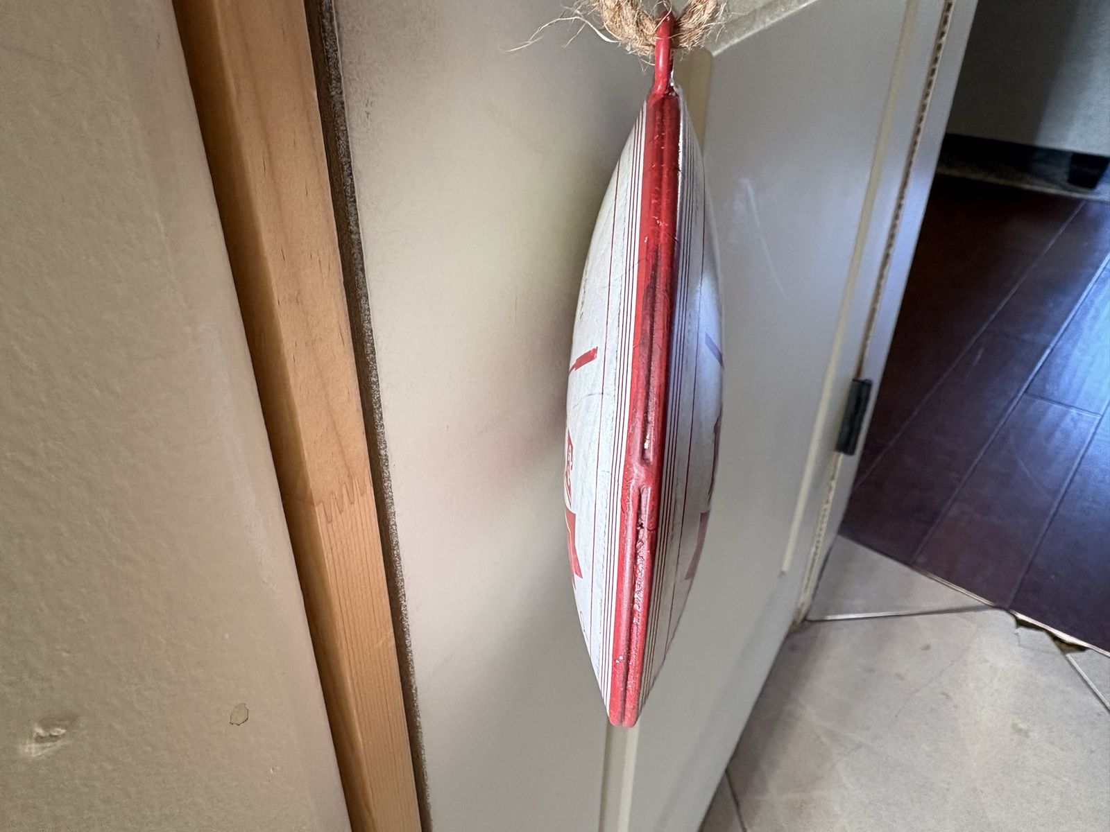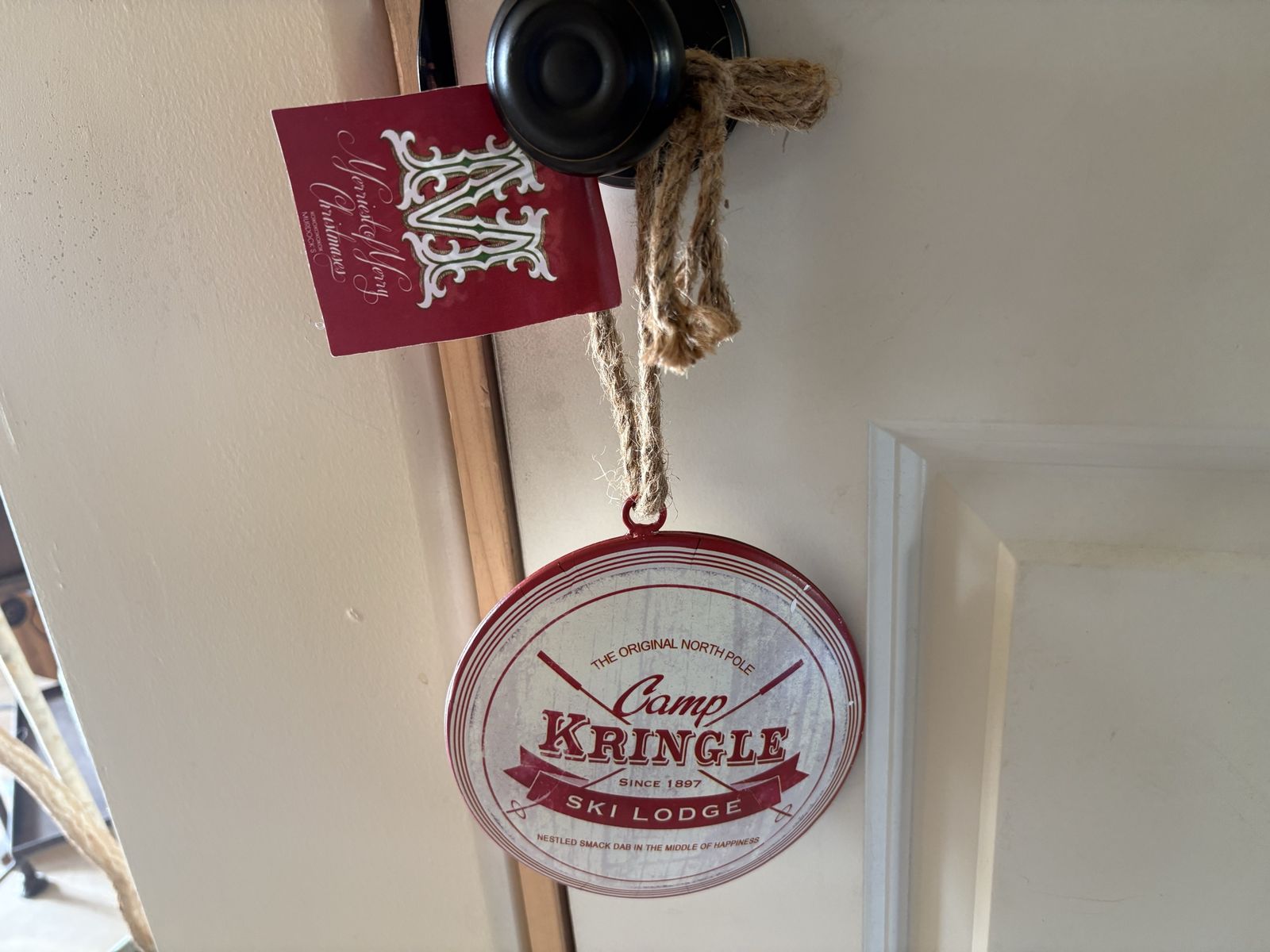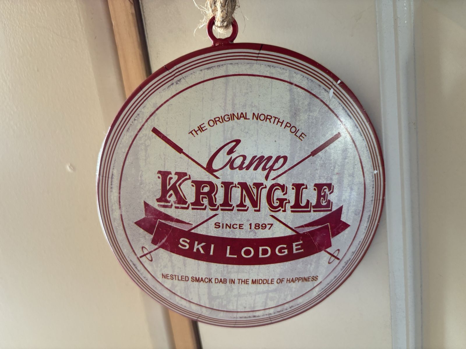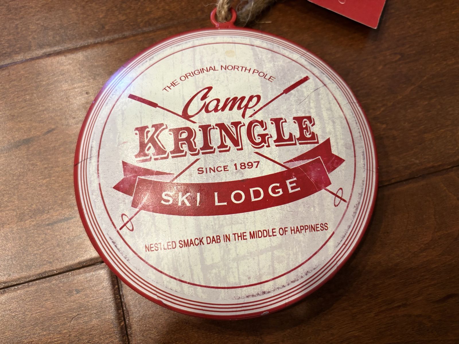 I have a large metal Christmas ornament that says Camp Kringle Ski Lodge. It has a rustic rope hanger. It’s 6 inches across. The hanger is another 7 1/2 inches long. It’s thick, not flat (see the last picture). See my other ads for jewelry, artwork, home decor and more.