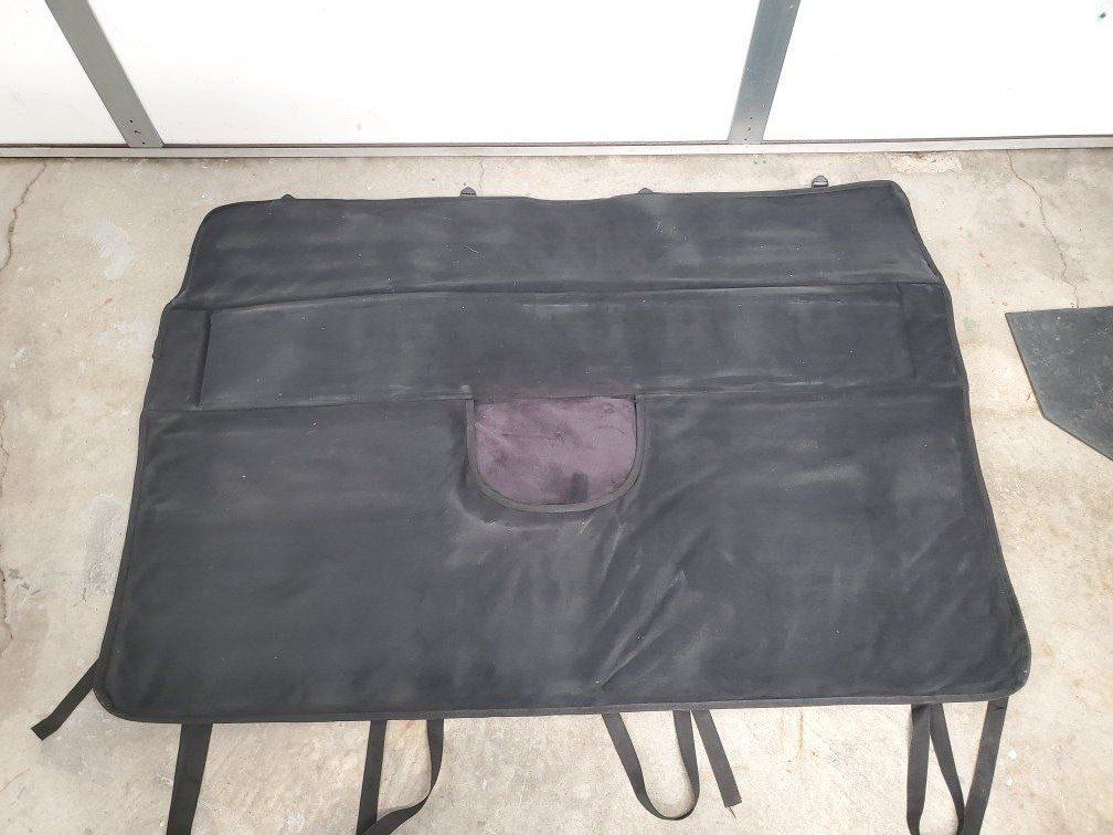 VenmoUnknown brand, but it's in great shape. It can accommodate 5 biked. Has 2 pockets on the truck bed side. 53" x 37" open, 53" x 18.5" folded.