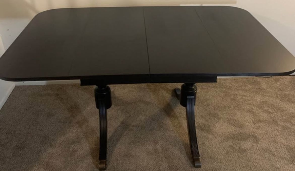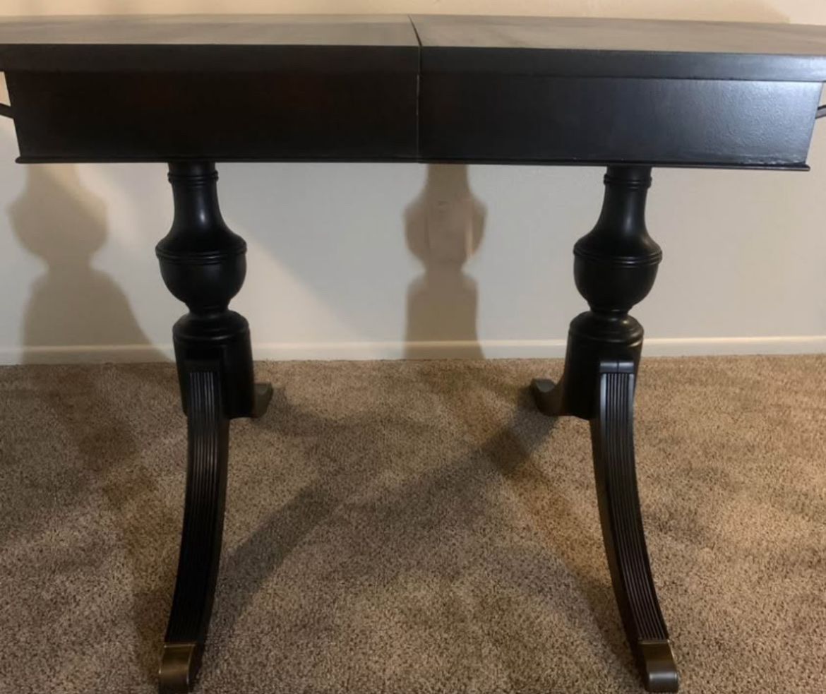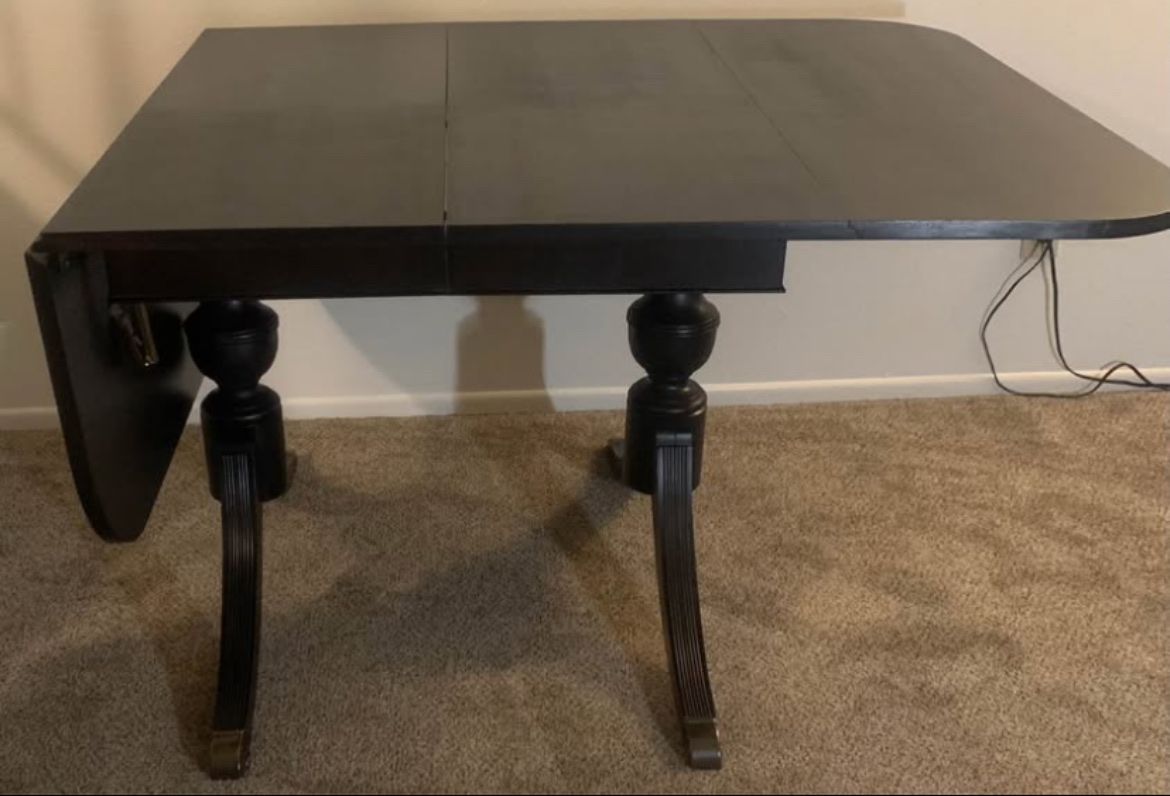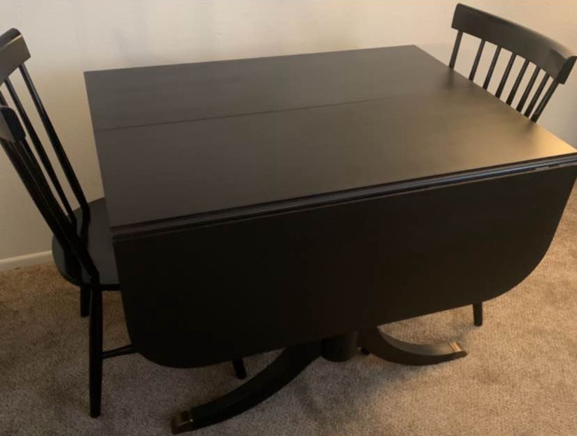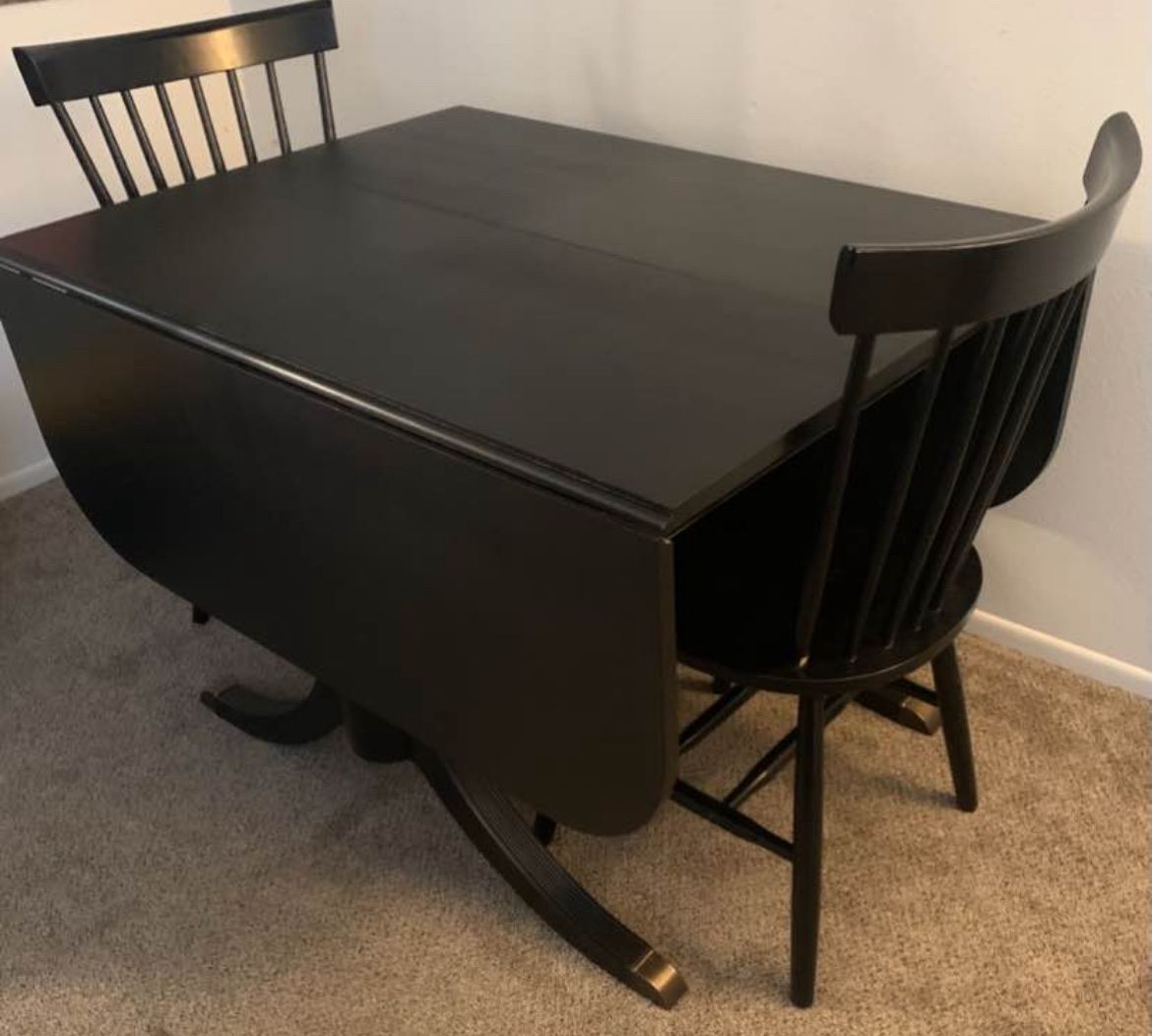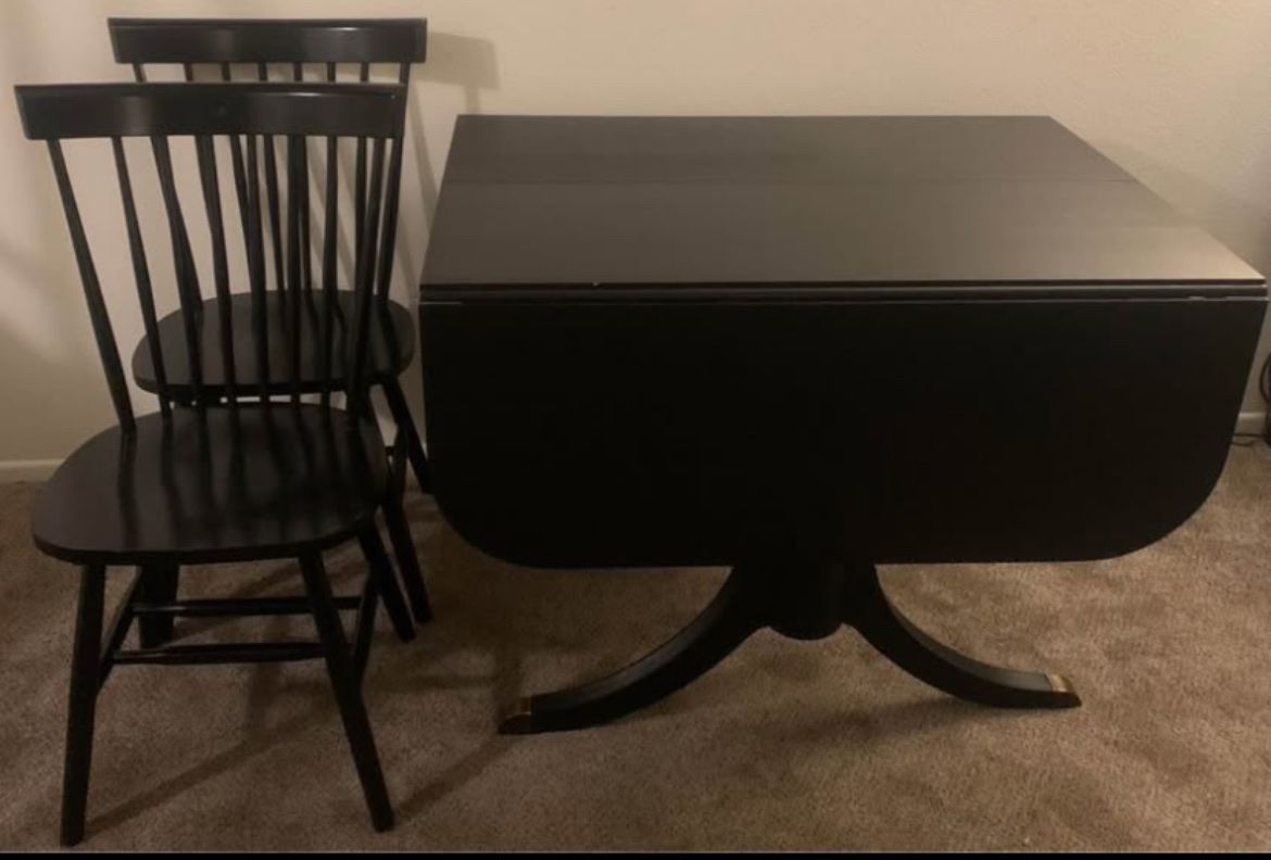 Stunning vintage drop leaf table Excellent condition Classy set that can conveniently fold down or extend easily 42 in long 32 in wide with sides down With sides up 63 in long 30 in tall Great for small spaces Comes with 2 Windsor dining chairs