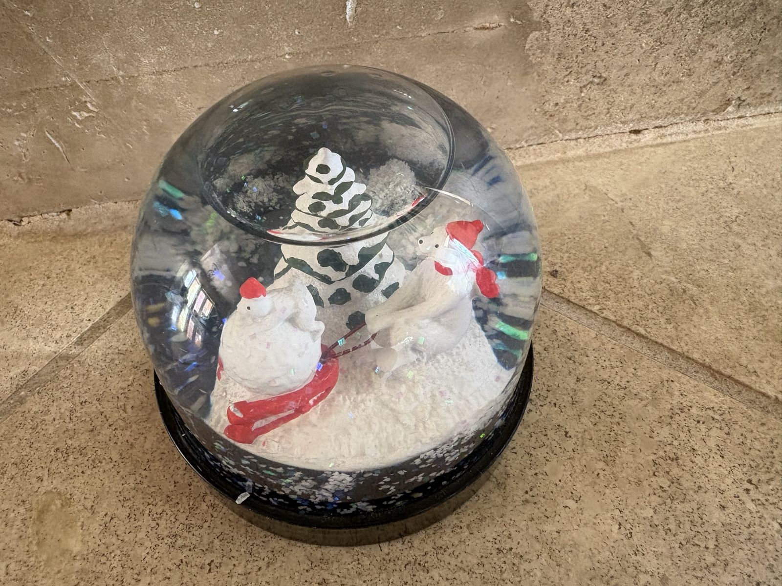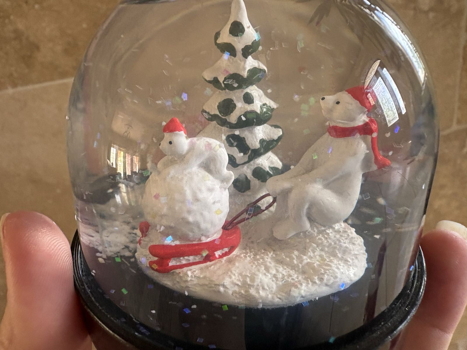 I have an Ikea Vinter snow globe with polar bears in it. It is 3 inches tall and 3 3/8 inches across. It is plastic. It has an air bubble in it. See my other ads for jewelry, artwork, home decor and more.