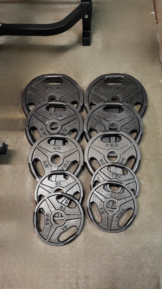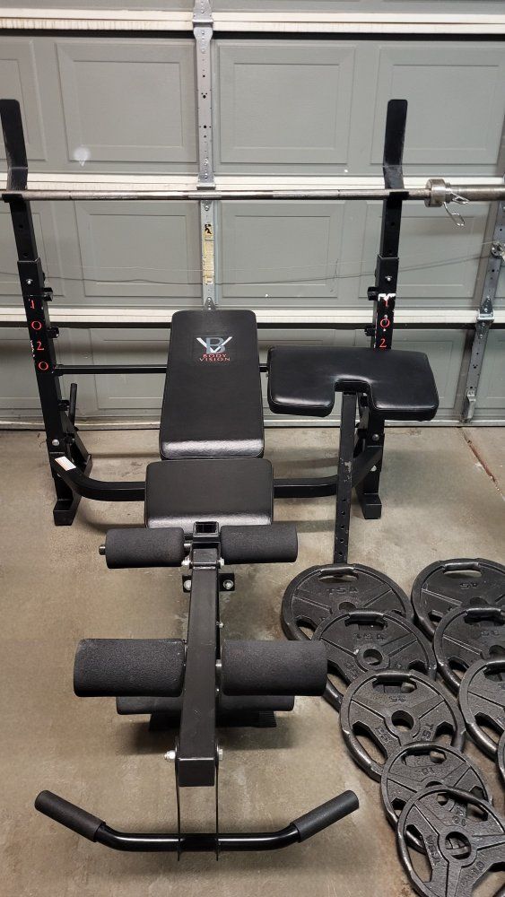 Adjustable bench with leg extension and preacher curl attachment, the bench is missing the pin to lock the preacher curl pad, 7 ft 45 pound barbell and 250 pounds of Olympic weights, selling together for $290 cash thanks for looking