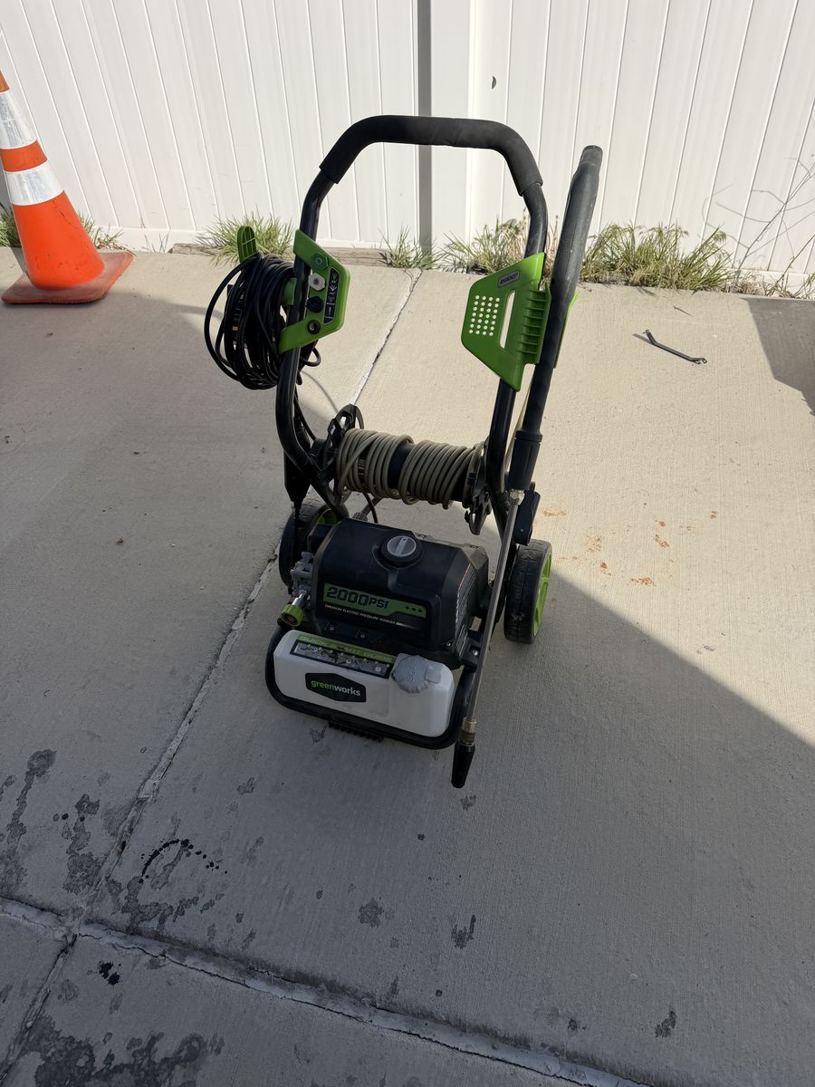 GooglePayAll Greenworks pressure washers are PWMA Certified-PWMA the Pressure Washer Manufactures Association was developed in 1997 to set standards for testing for pressure washers made for household, consumer, commercial or farm use. PWMA Pressure Washers have guaranteed trusted performance. • 2,000-PSI and 1.2-GMP electric pressure washer is ideal for medium-duty applications like cleaning fences, decks and driveways • 13-amp induction motor is water-resistant for longer life and consistent power • Axial cam pump is great for homeowner use • 4 interchangeable, quick-connect nozzles (Turbo, 25°, ,40° and soap) allow you to clean a variety of surfaces • Interchangeable wand for your convenience • Onboard storage holds power cord and accessories, and the built-in protected hose reel keeps 25-ft hose safe • Rugged metal frame design with 8-in wheels for easy portability ntly