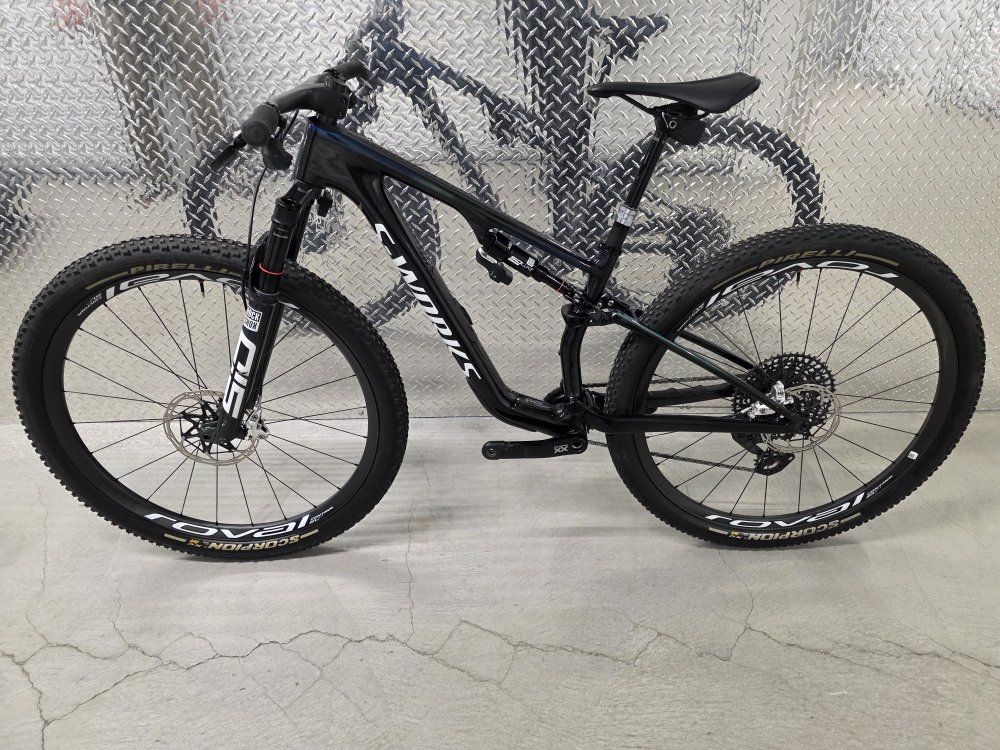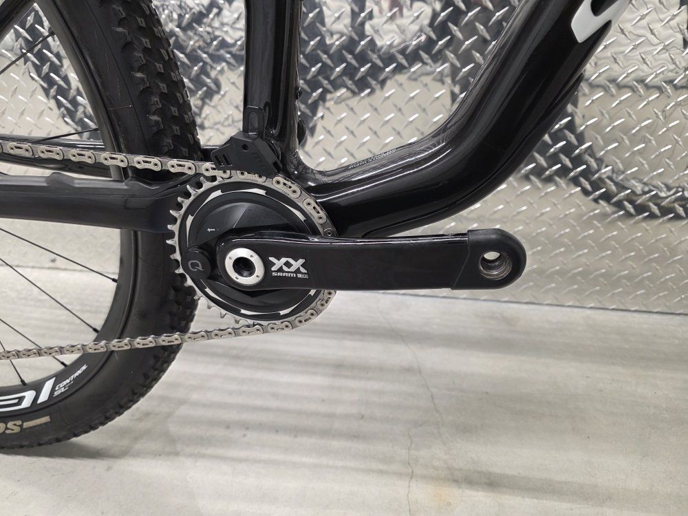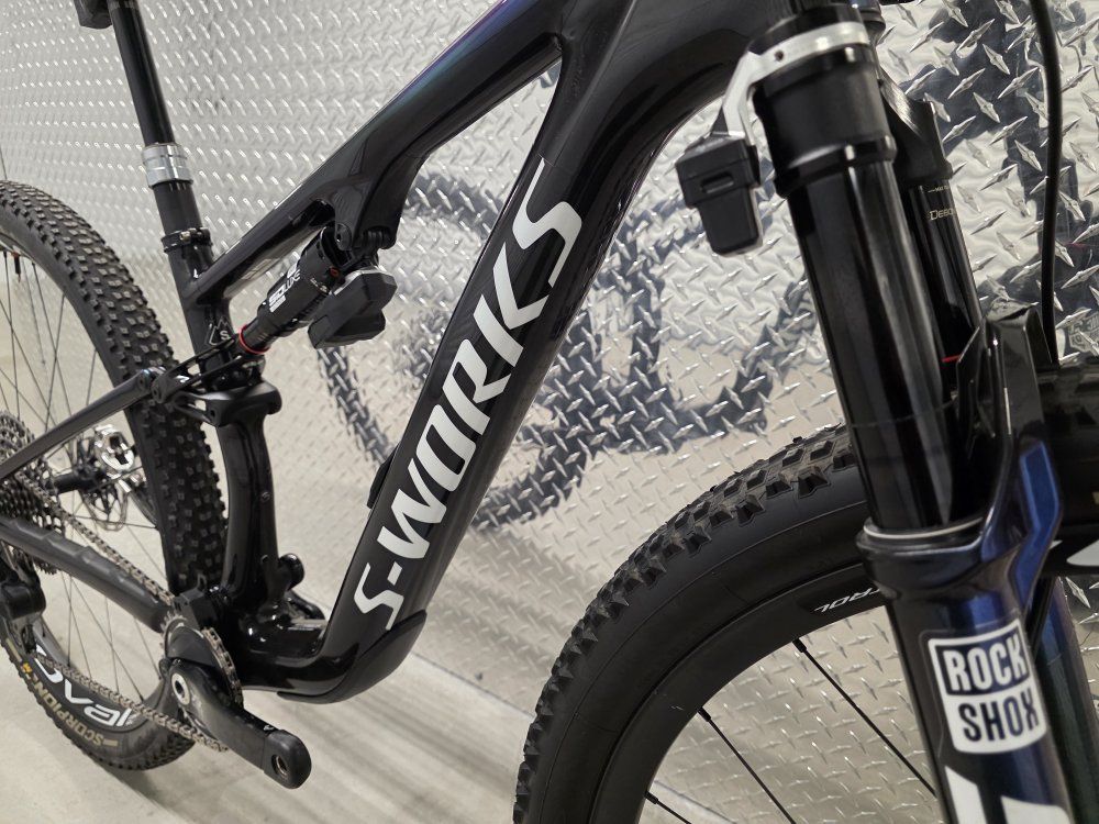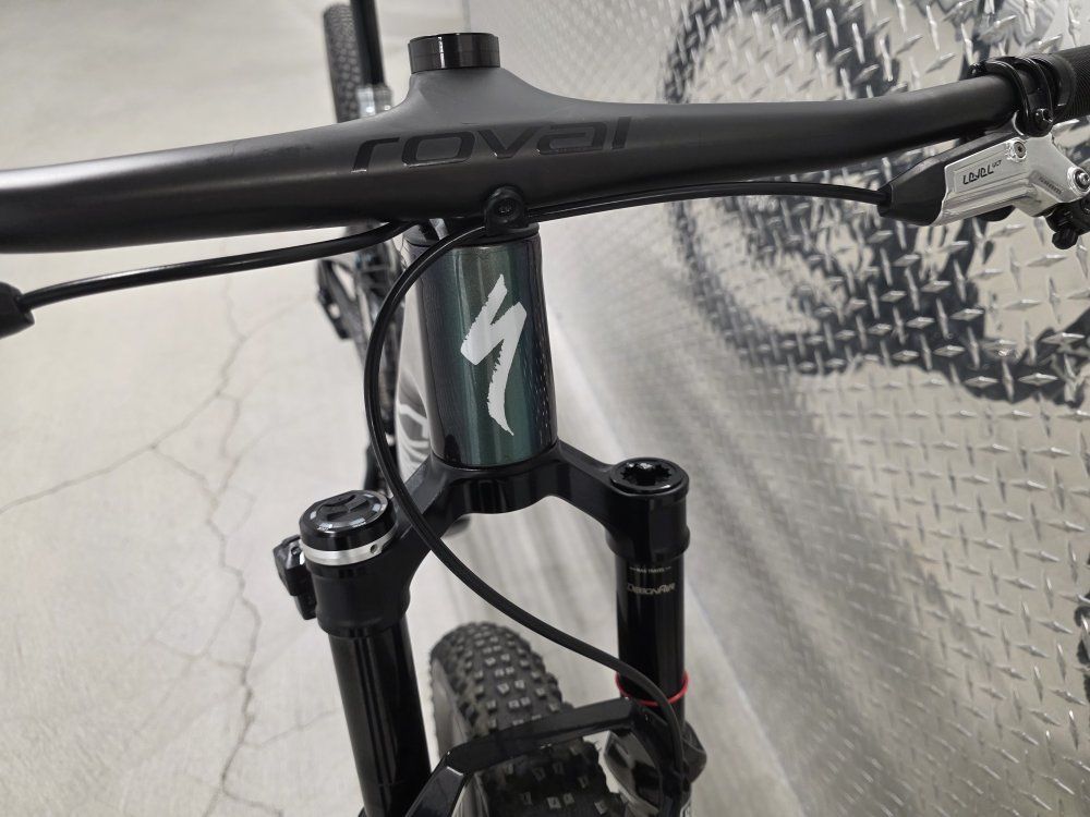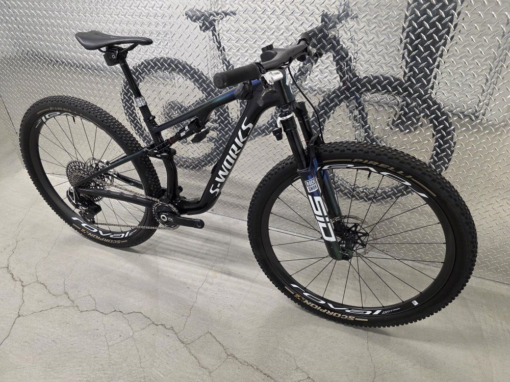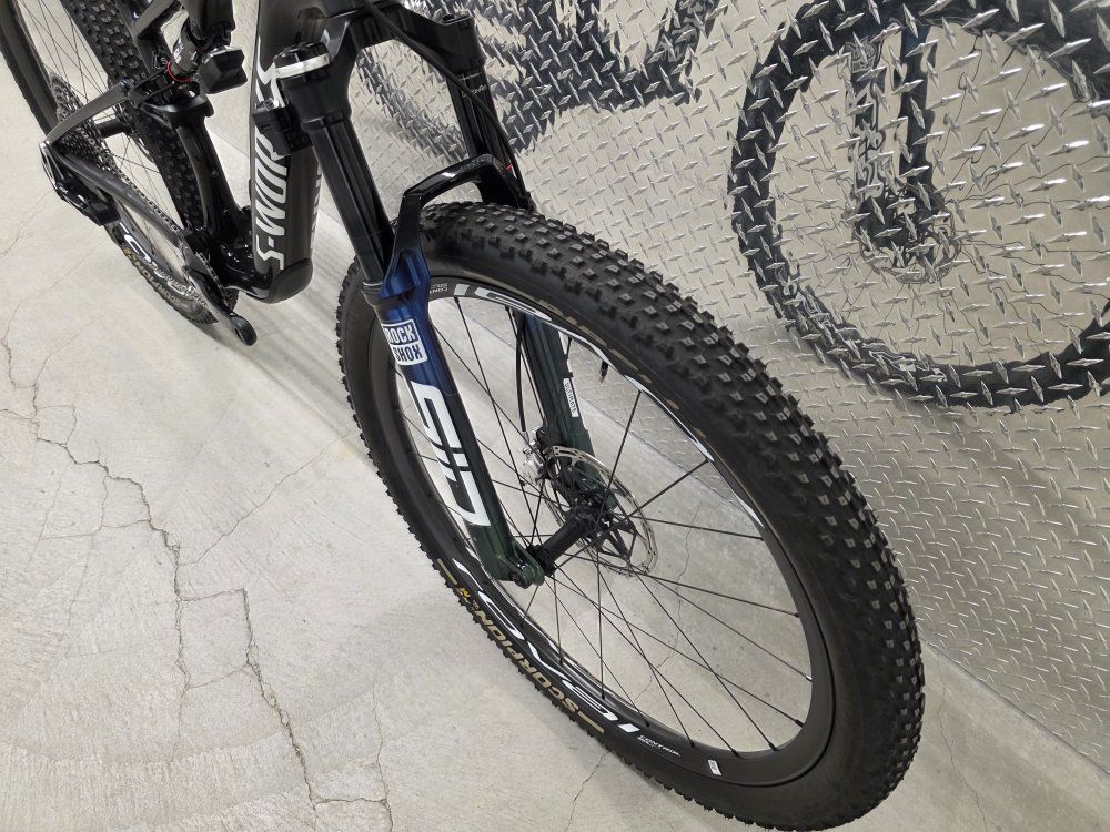 Rockshox Sid Ult Flight Attendant 120mm fork Rockshox SidLuxe Flight Attendant 120mm shock Rockshox Reverb axs dropper post Sram XX SL powermeter Sram XXSL Transmission drivetrain Sram Level Ult brakes Roval Control SL carbon wheels Dt Swiss 180 hubs w/ ceramic bearings Roval Control carbon cockpit