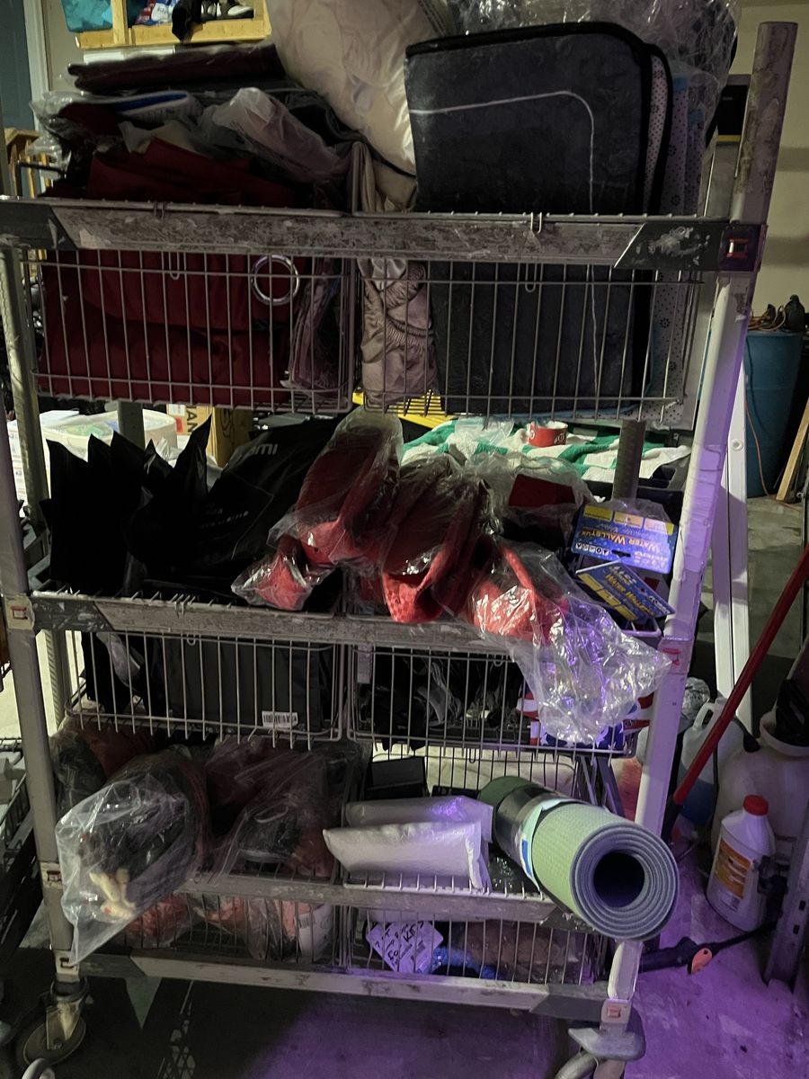 Car parts, tools, glasses, a crib, jewelry, and knickknacks, speakers, toys, tools, bedding, so much stuff