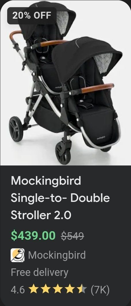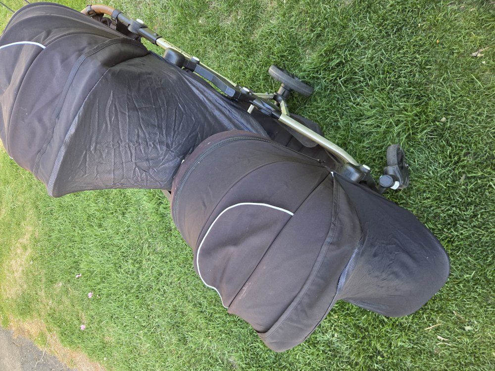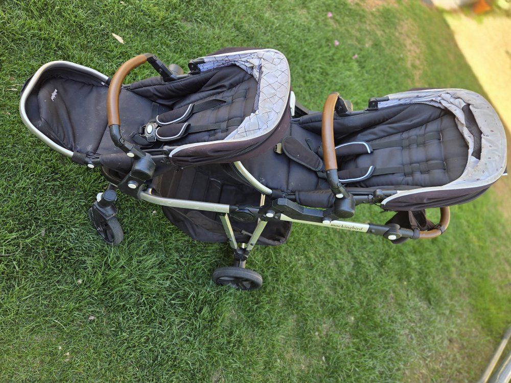 Venmomockingbird double stroller. we loved this stroller, held both kids and a huge basket on the bottom for tons of stuff. Narrow enough for doors and hallways unlike the side by side strollers. Comes apart and collapses down to fit in time car. Retractable shades over both seats, magnet full cover sunshades are awesome (they did get some threads snagged on some velcro in the wash) they still function as they should. I dont think there was anything we didnt like about this stroller.