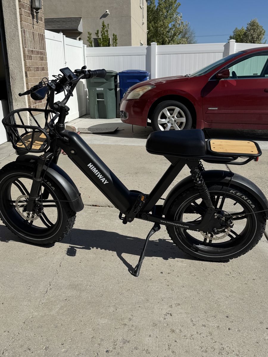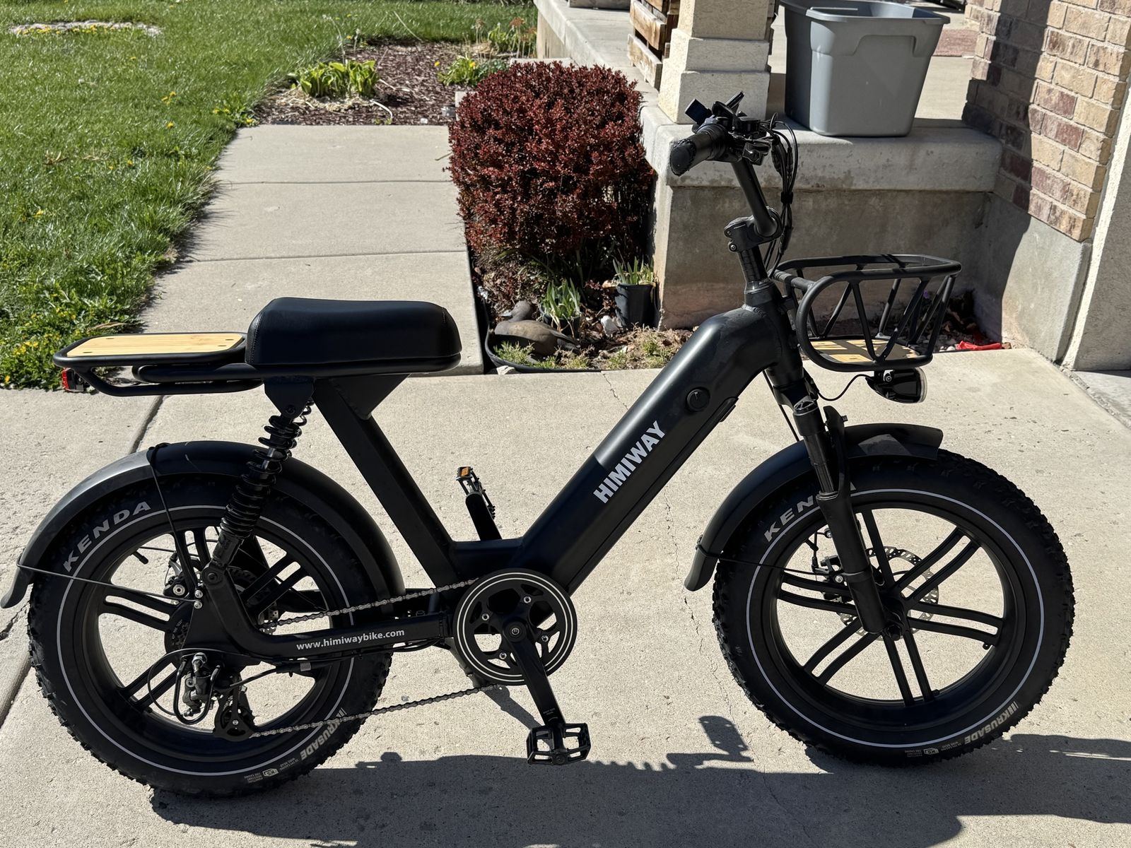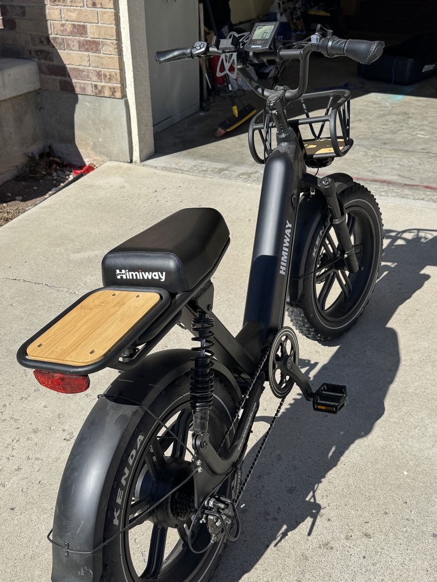 VenmoSelling my Himiway Escape Pro electric bike. This is a powerful, moped-style e-bike that is perfect for commuting, deliveries, or just cruising around town. It’s incredibly comfortable thanks to the dual suspension and thick moped-style seat. Key Features & Specs: • Motor: 750W Geared Hub Motor (plenty of power for hills). • Battery: 48V 17.5Ah Samsung/LG battery (Great range). • Tires: 20" x 4" Kenda fat tires for all-terrain stability. • Suspension: Dual suspension (front fork and rear dual shocks) for a smooth ride. • Accessories Included: Heavy-duty front basket with wood inlay, rear rack, fenders, and integrated front/rear lights. • Display: Multifunction LCD showing speed, battery level, and mileage. Condition: The bike is in excellent condition and has been well-maintained. Brakes are sharp, the battery holds a full charge, and the frame is clean. Price & Terms • Price: $1,200 • Pickup: Local pickup only. Cash or Venmo preferred.