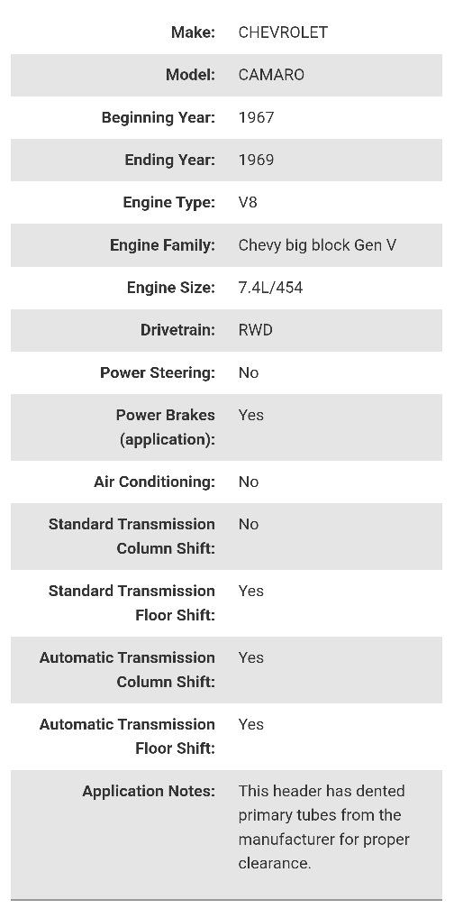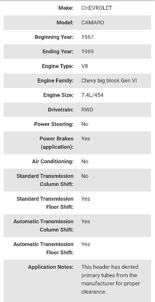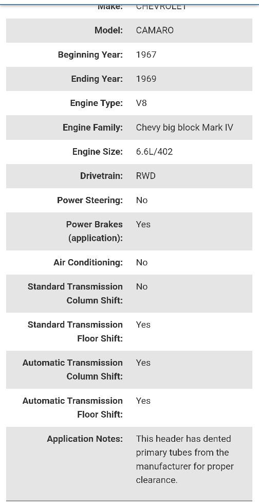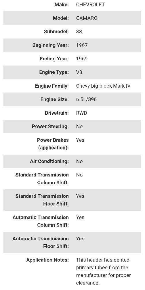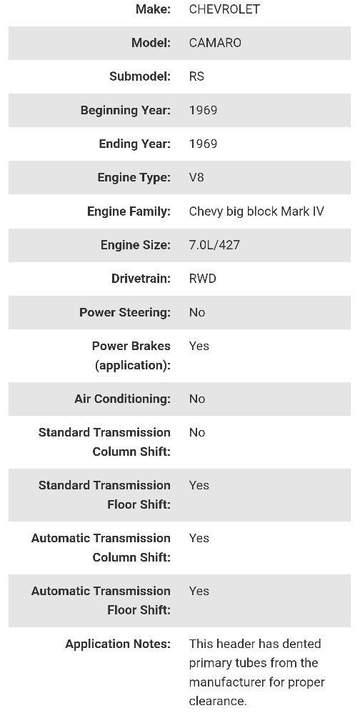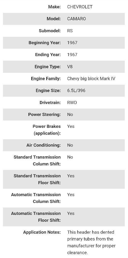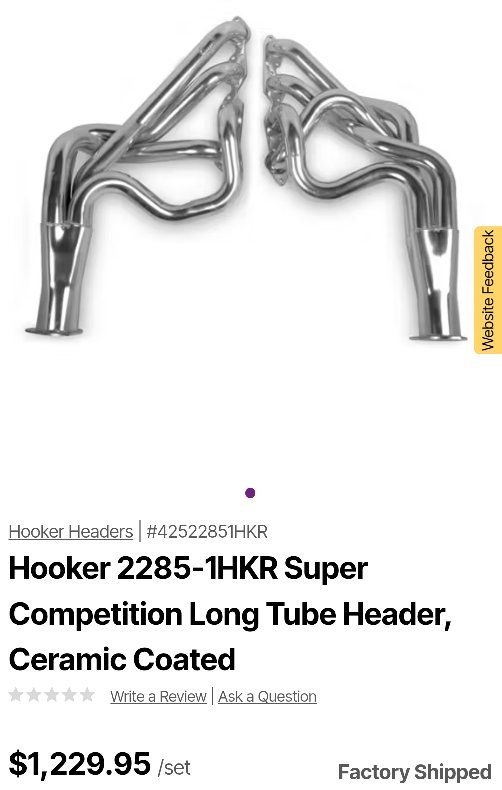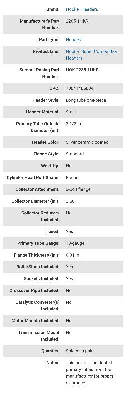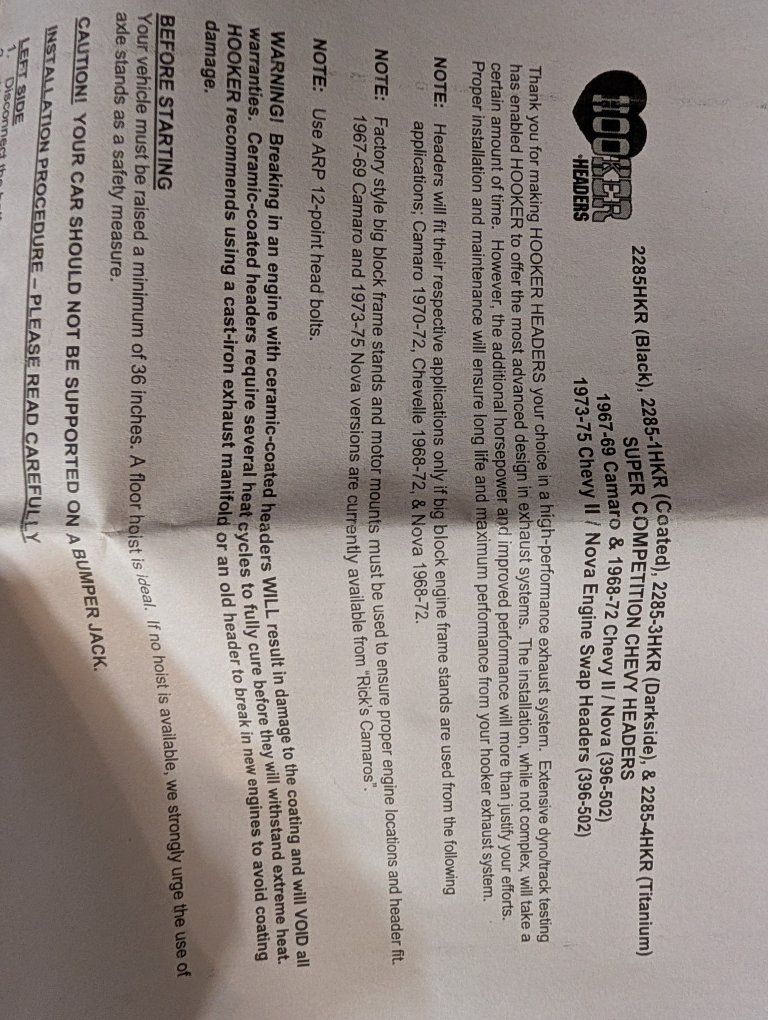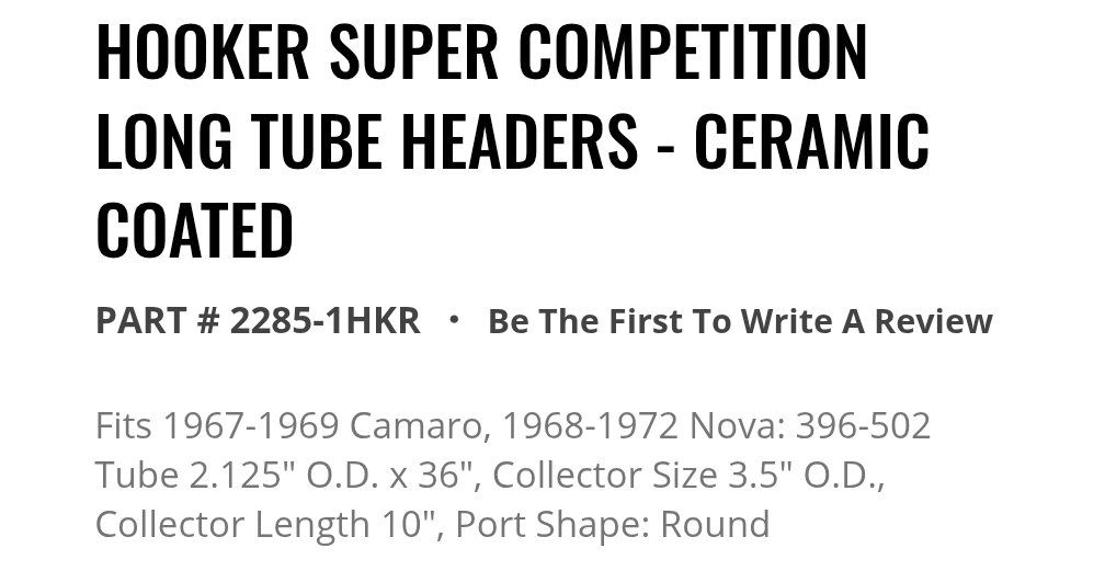 VenmoBrand New Hooker Super Competition long tube steel ceramic coated race headers Part #2285-1HKR. Includes gaskets and mounting bolts. For 1967-1969 Chevy Camaro, 1968-1972 Chevy II / Nova. Details are in the pictures. Retails for $1300 online. I'm only asking $955. Please note that these have dented primary tubes from the manufacturer to allow for proper clearance. They are not damaged. Text if interested or if you have any other questions 801-903-8337.