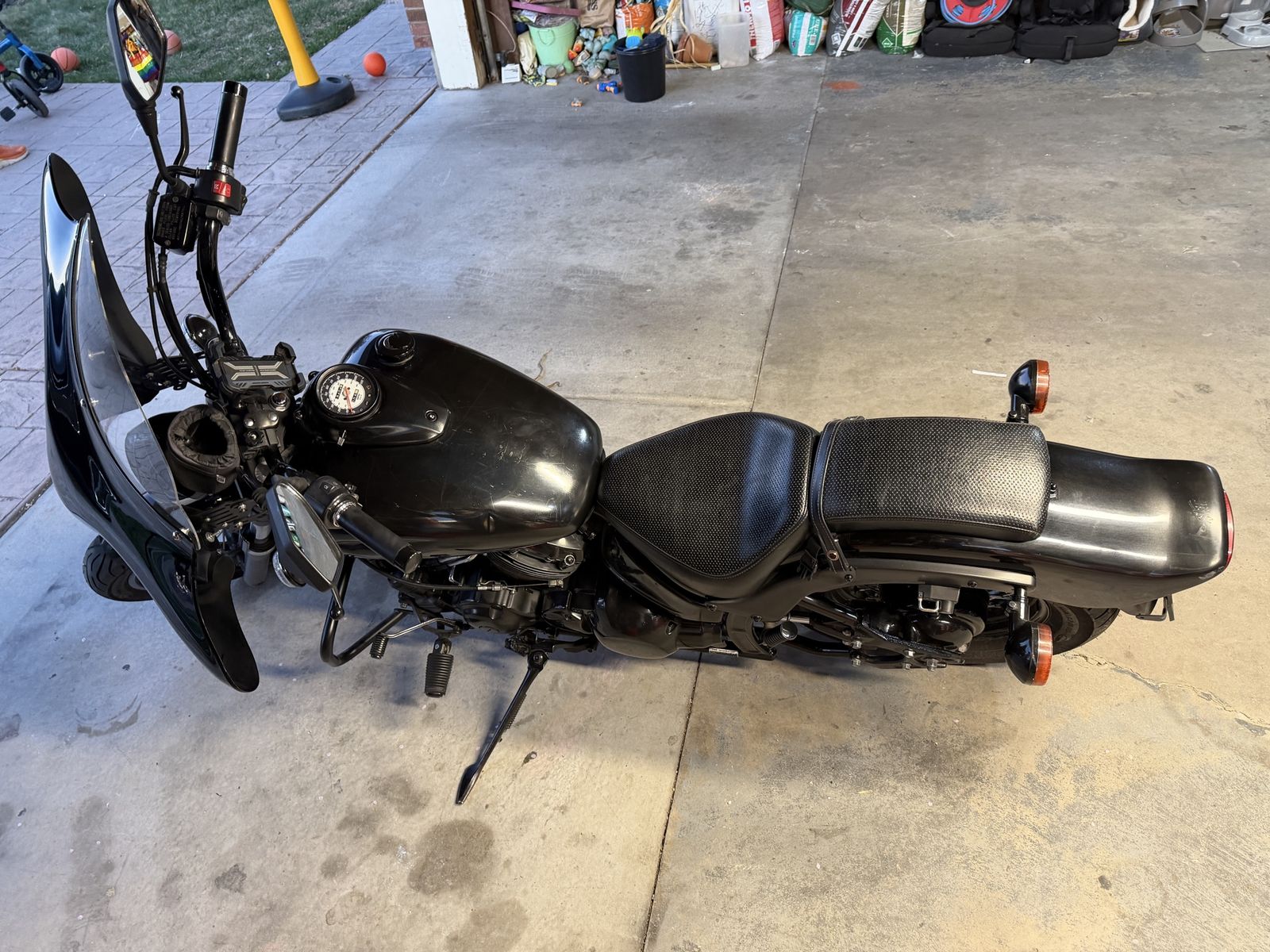 No issues, new brake pads, new tires only have a couple hundred miles on them, recent oil change, recent brake flush, dent on the gas tank, some spare parts, has an aftermarket muffler, have the original as well. Well taken care of.