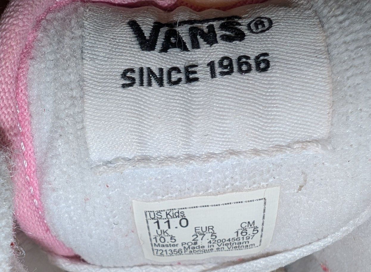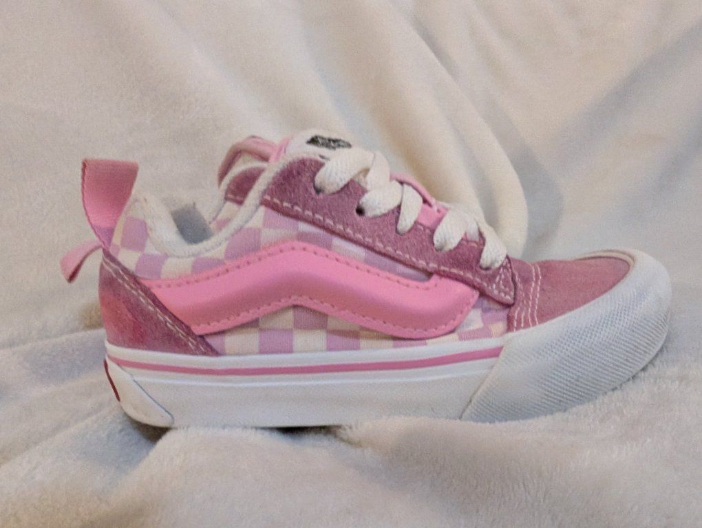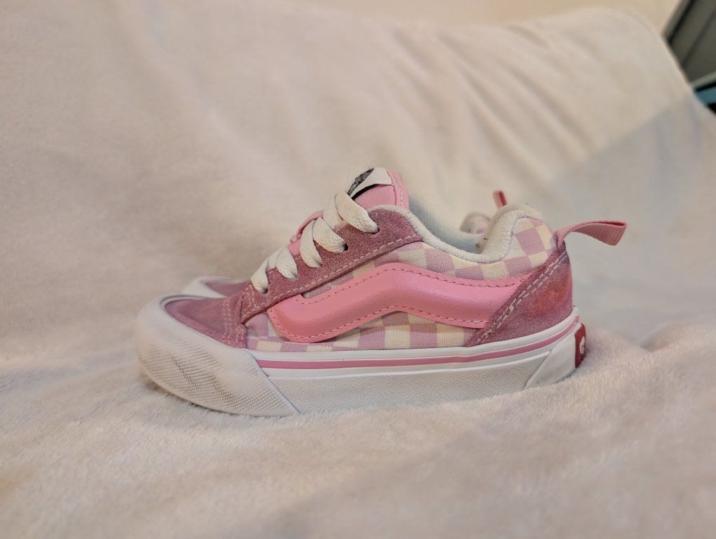 Pink and white checkered Vans skate shoes. They are child size 11. Well loved and worn by a rambunctious child. A couple of scuffs, and some slight discoloring after I tried to wash them 🥹 Very cute, super sturdy and perfect for running and playing outside. Venmo or cash preferred. I'm available after 5 p.m. Thank you