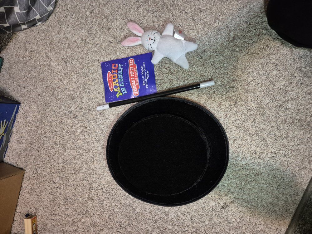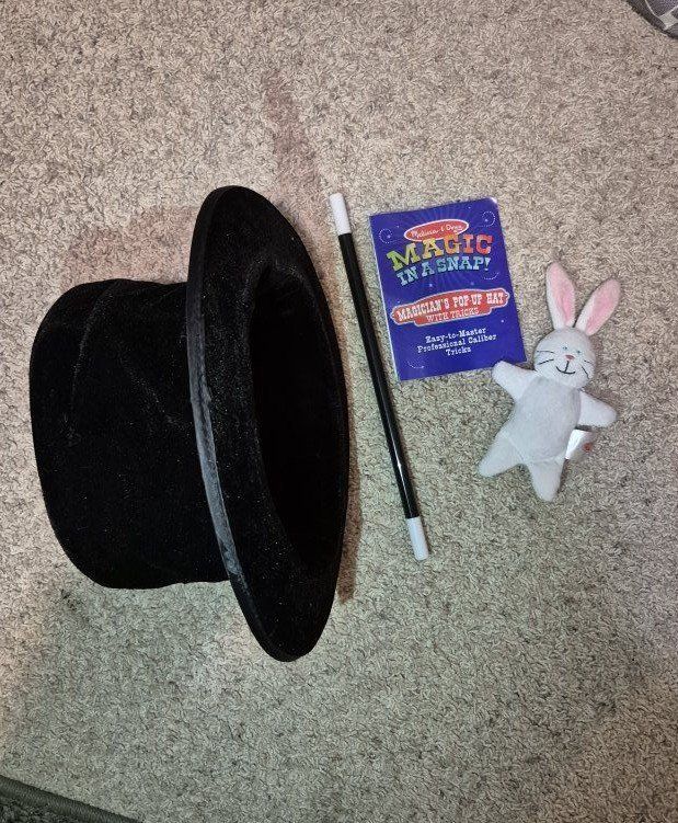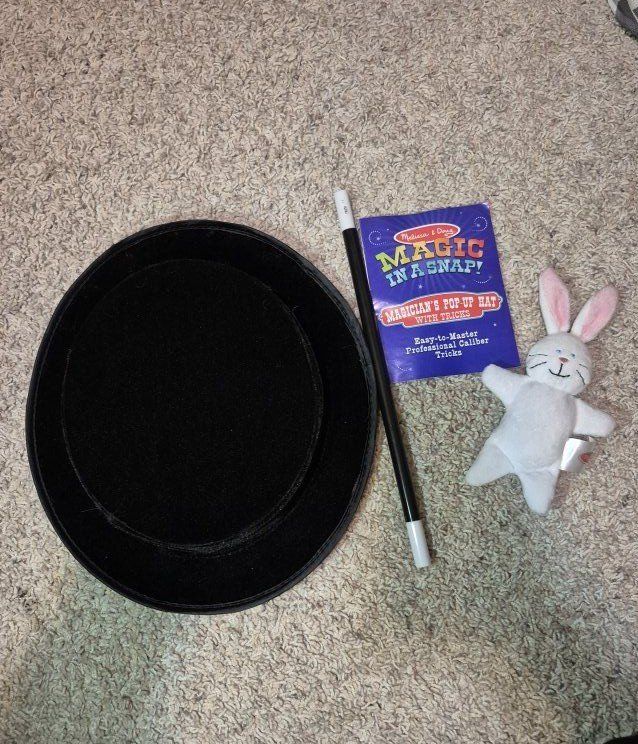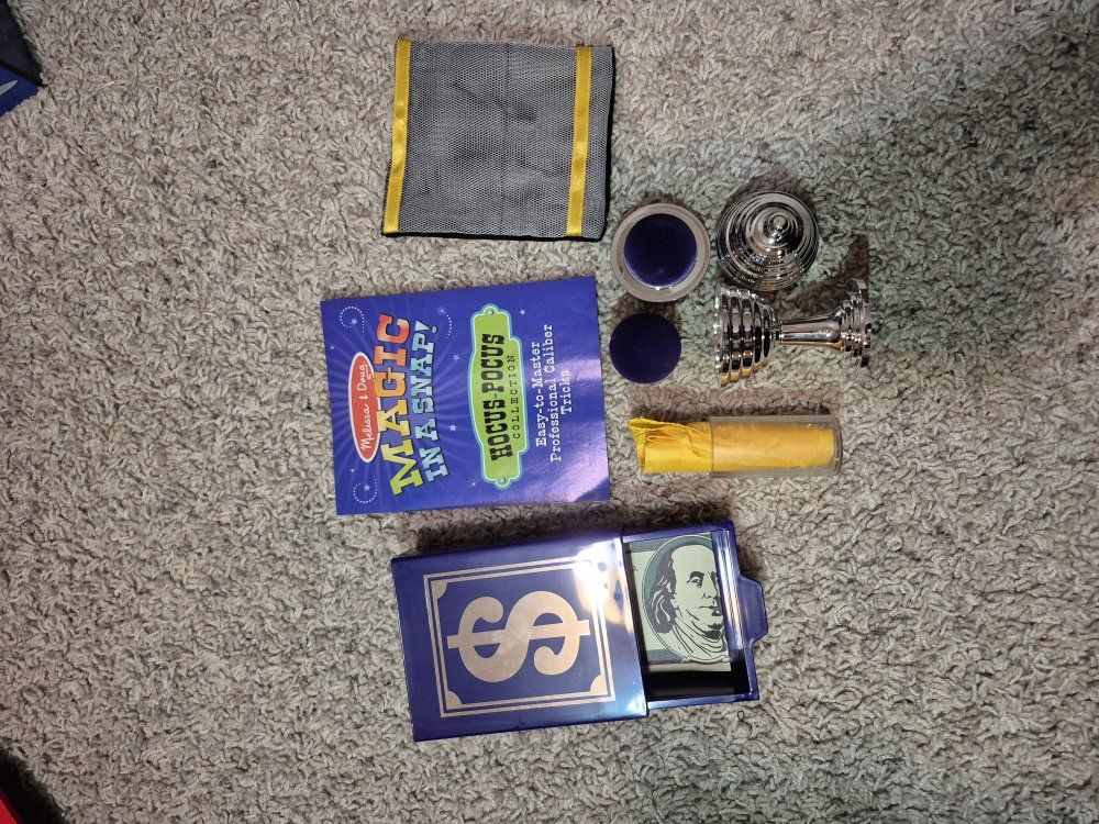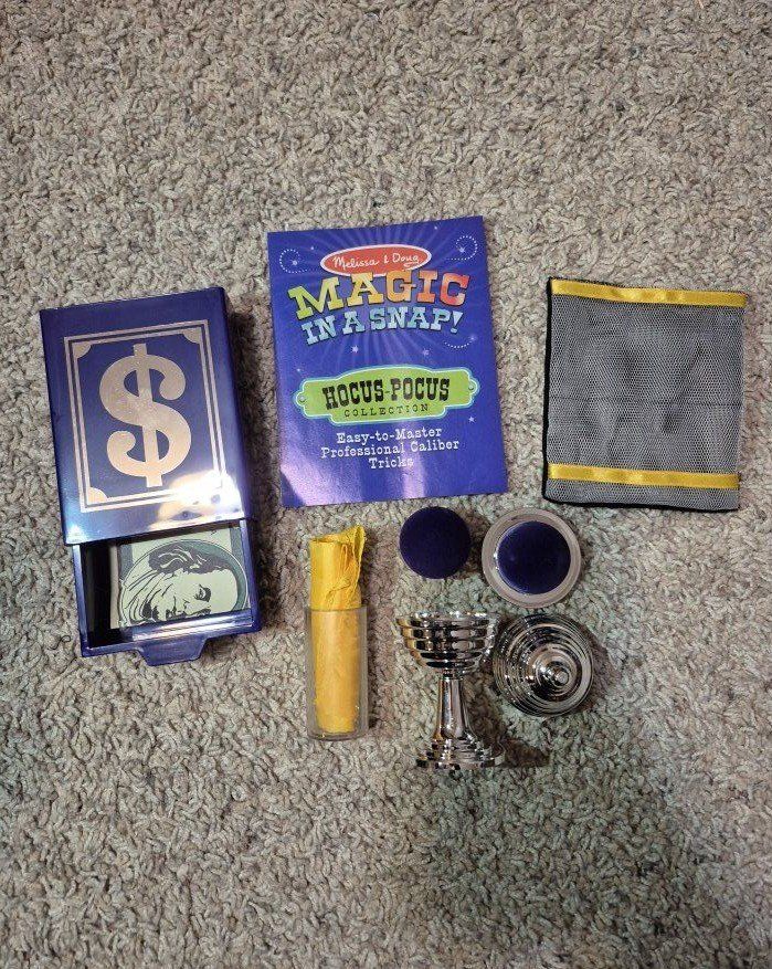 *M&D Deluxe Wooden Magic Set (10 tricks), complete set *M&D Magician's Pop-up Hat Set (4 tricks) just missing the coin, can replace with a quarter or other plastic coin *M&D Magic in a Snap--Hocus Pocus Collection (4 tricks) just missing foil square *M&D Magic in a Snap--Abracadabra Collection (6 tricks) complete set
