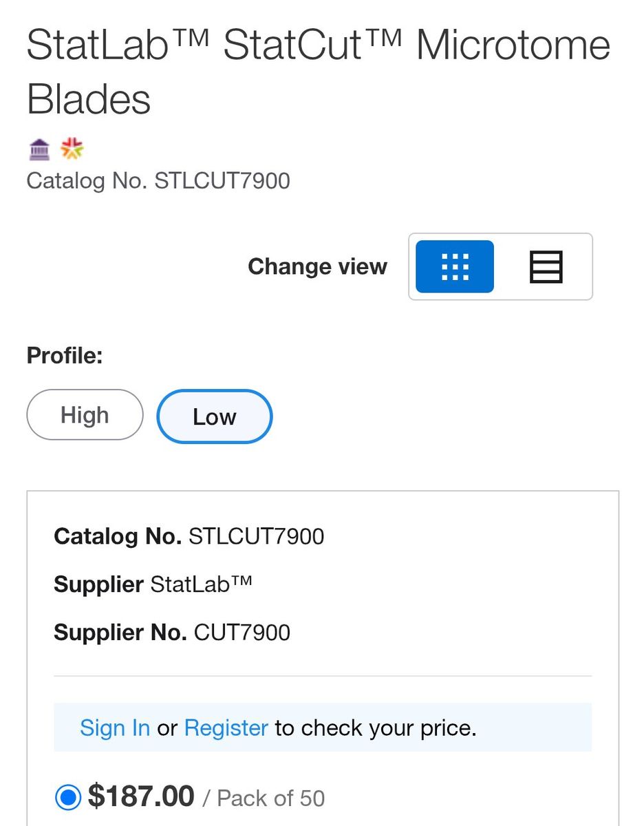 VenmoBrand New StatLab StatCut Low Profile Microtome Blades. Each carton contains 50 blades. Suitable for both soft and hard tissue, StatCut blades are well balanced in durability and sharpness. Blades are coated for non-stick sections and effortless ribboning. I have a few boxes left. Asking $70 per box or $50 if you buy more than one.