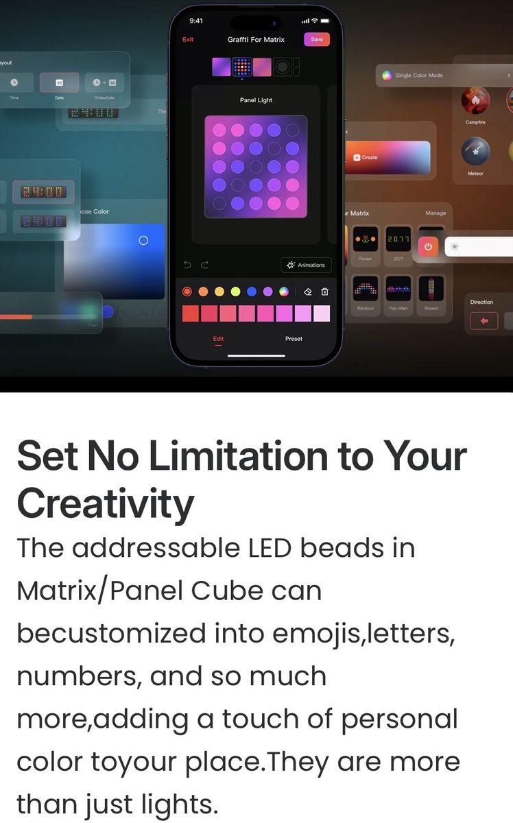 Ready-to-Use Clock, Text, Emoji Modes & 20+ Lighting Effects programmed.