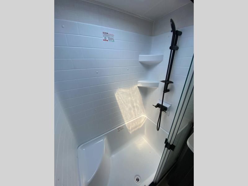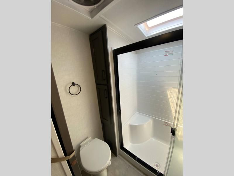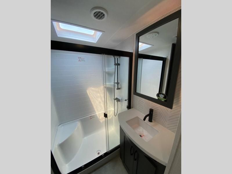 Bathroom: Residential-sized shower with a glass door and skylight, porcelain foot-flush toilet, and Maxxair® ventilation fan