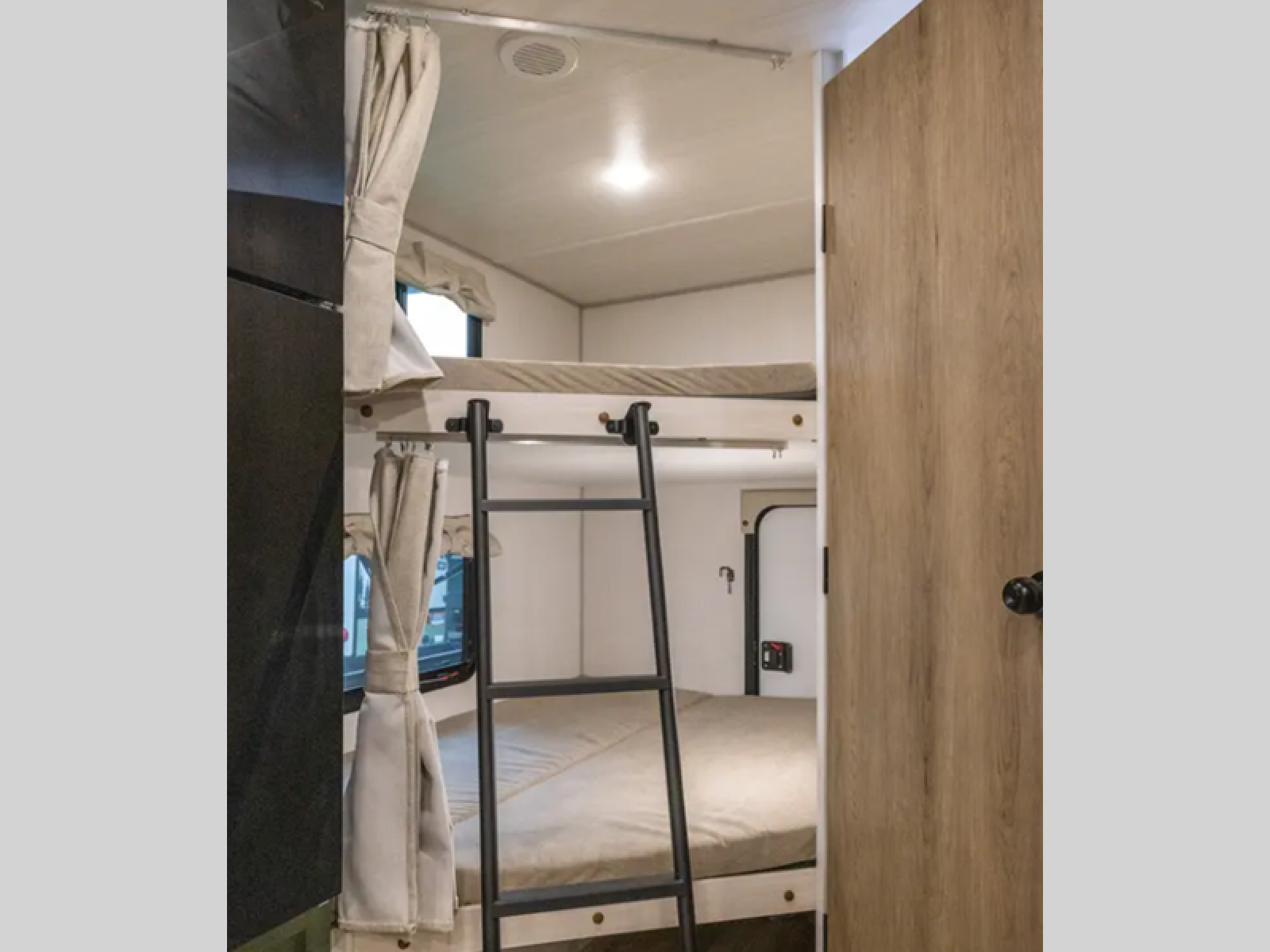 Pack up this very versatile Murphy bed travel trailer and head out to explore! You will love the space saving aspect that a Murphy bed gives you by not increasing the tow length in order to give you a separate bedroom and living space, and you don't even have to make the bed, just fold it up into the wall in the morning! Double-size bunks in the rear corner are perfect for accommodating both children and adults. The kitchen offers everything a cook would need to feed the whole gang and there is even a counter bar area with two stools which will be perfect for breakfast time. There is a booth dinette slide for more dining space, or a place to enjoy a board game or card game when you are inside. When the optional Beast Mode Package on this model is chosen, you'll enjoy a 400-watt solar package, a fresh water filter, a Maxxair roof vent cover, plus a Beast Mode independent suspension for better handling.