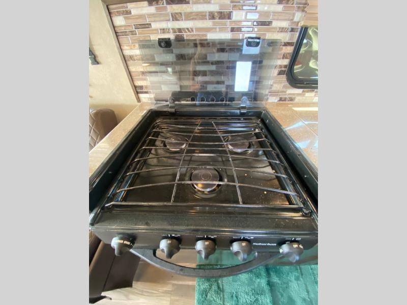 Full kitchen with 3-burner cooktop, oven, and microwave