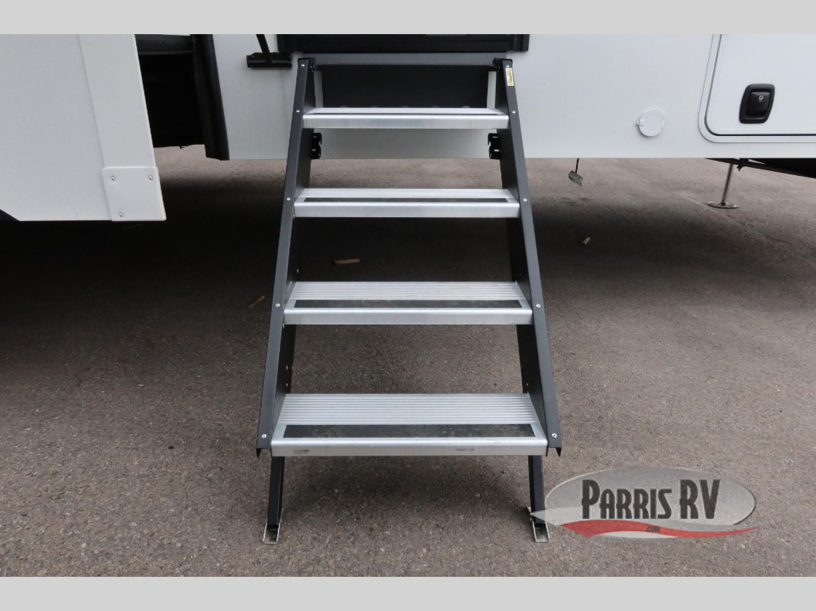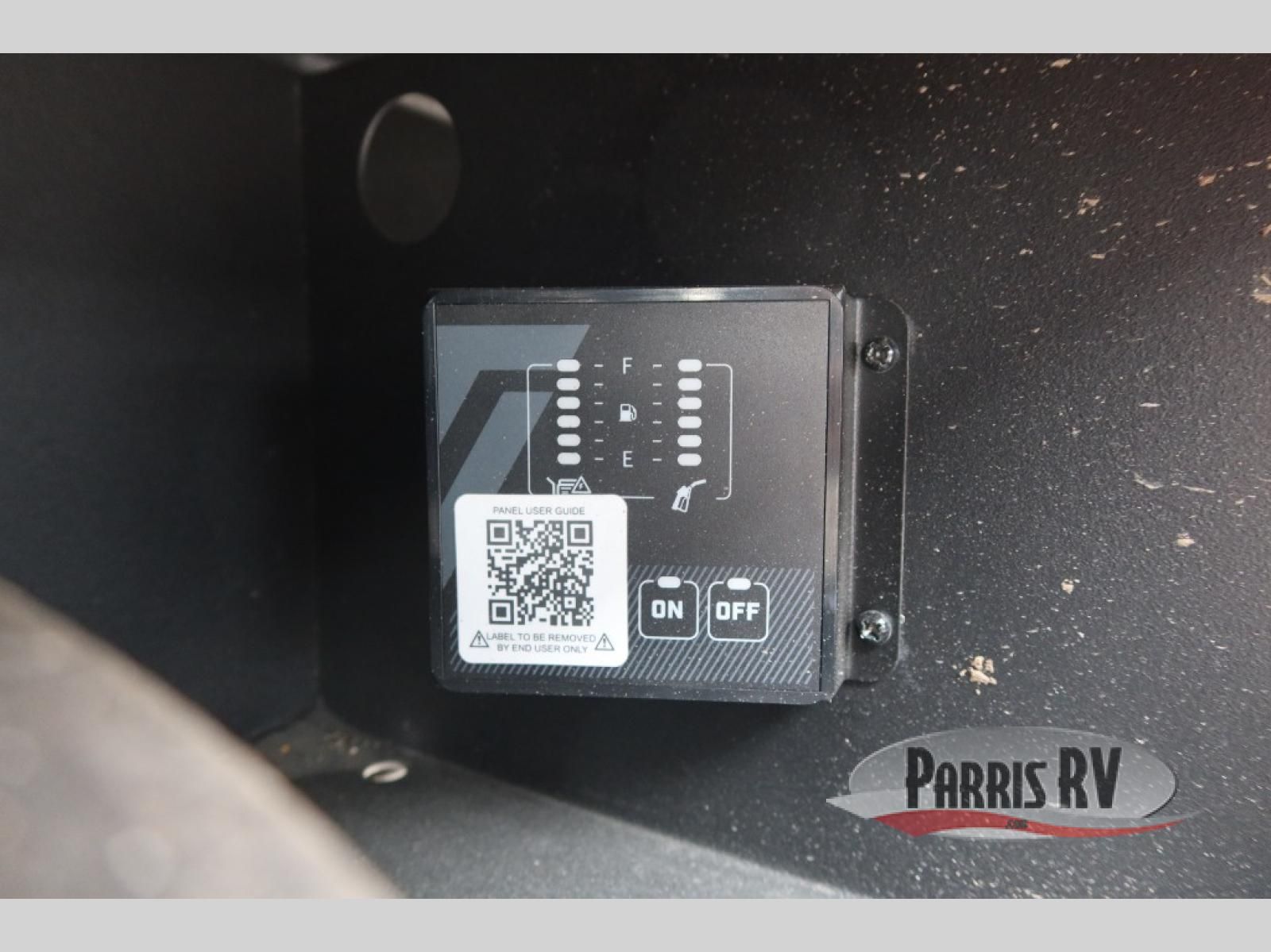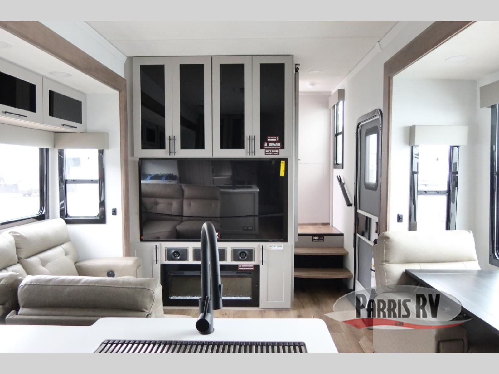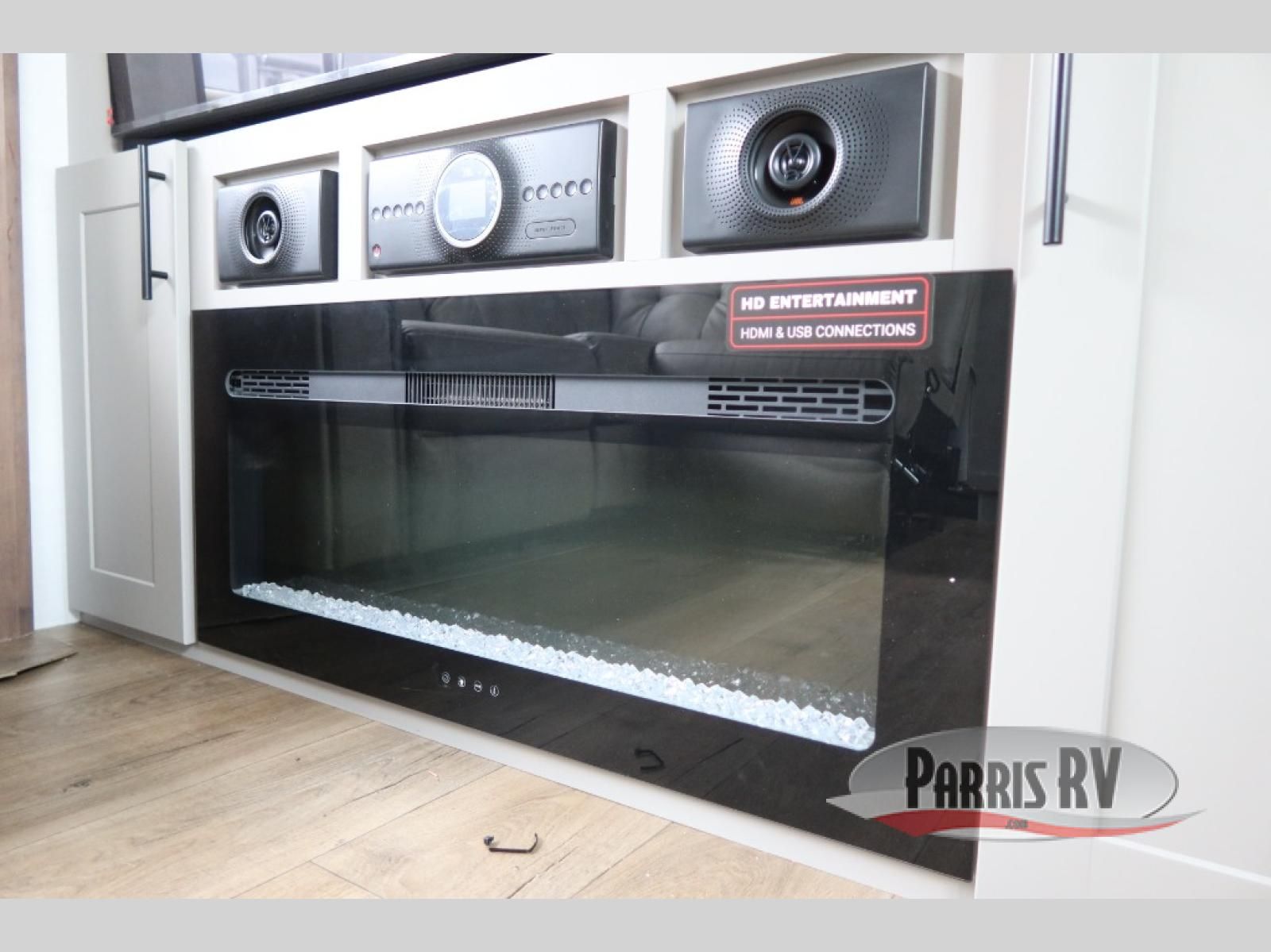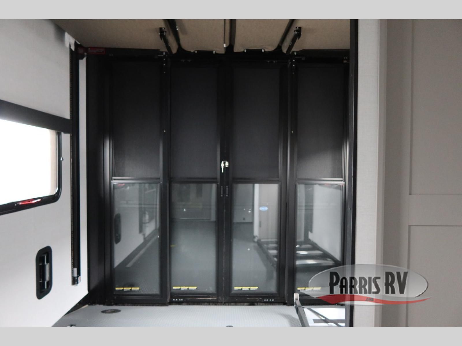 This spacious toy hauler will be perfect for weekend trips to the lake or woods! Once you've unloaded your toys from the 11' separate garage, you can relax on the 60" dual opposing sofas or set up the HappiJac bed for guests if it's getting late. There is also a 30" x 72" bunk/loft bed above the garage, a 40" garage TV, and a half bath for added convenience. As you head into the kitchen area, you'll find ample counter space to prep meals, along with a buffet, a spacious pantry and a 12V refrigerator for perishables. You can dine together at the dinette with chairs, then head to the L-shaped sofa across from the fireplace and 65" TV for movie night. The full bath includes an entrance from the hallway and into the front master bedroom. Here, you'll enjoy a king bed slide out, a flip-up dresser with a 32" TV, plus a front wardrobe with washer and dryer prep if you plan to go full-time!