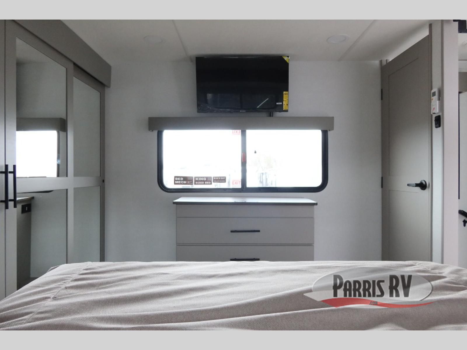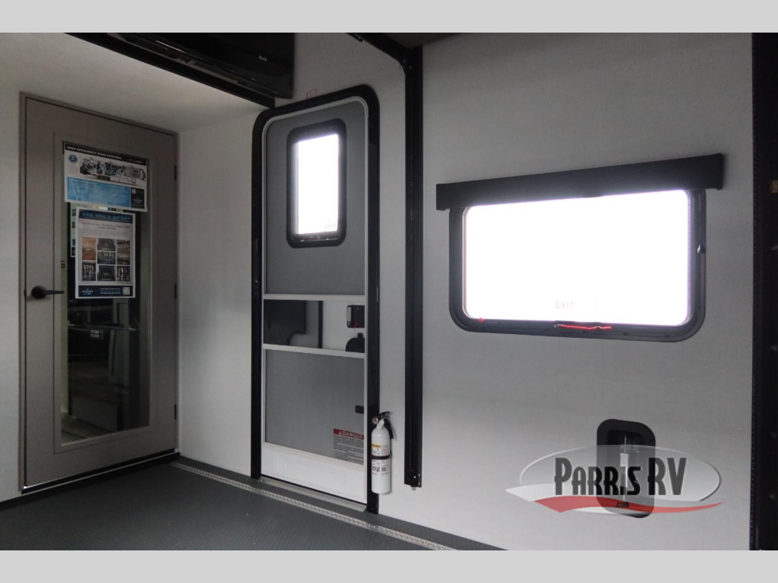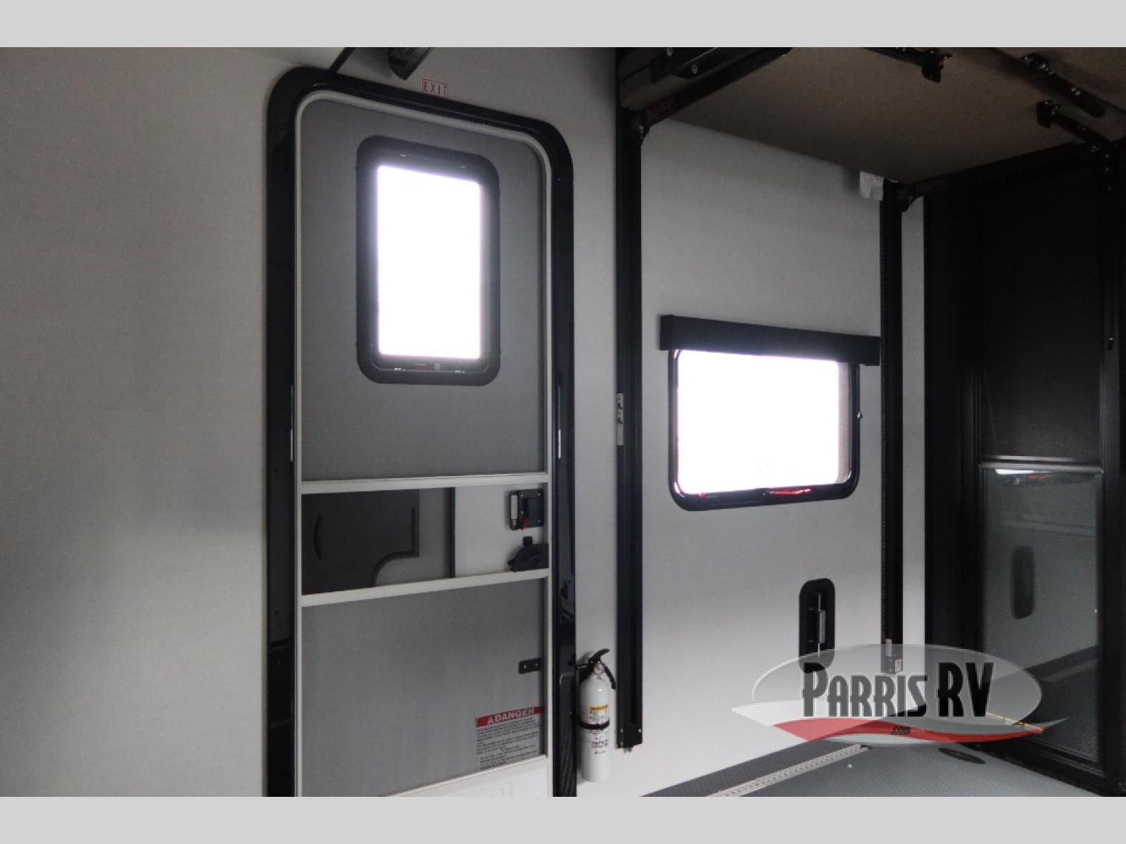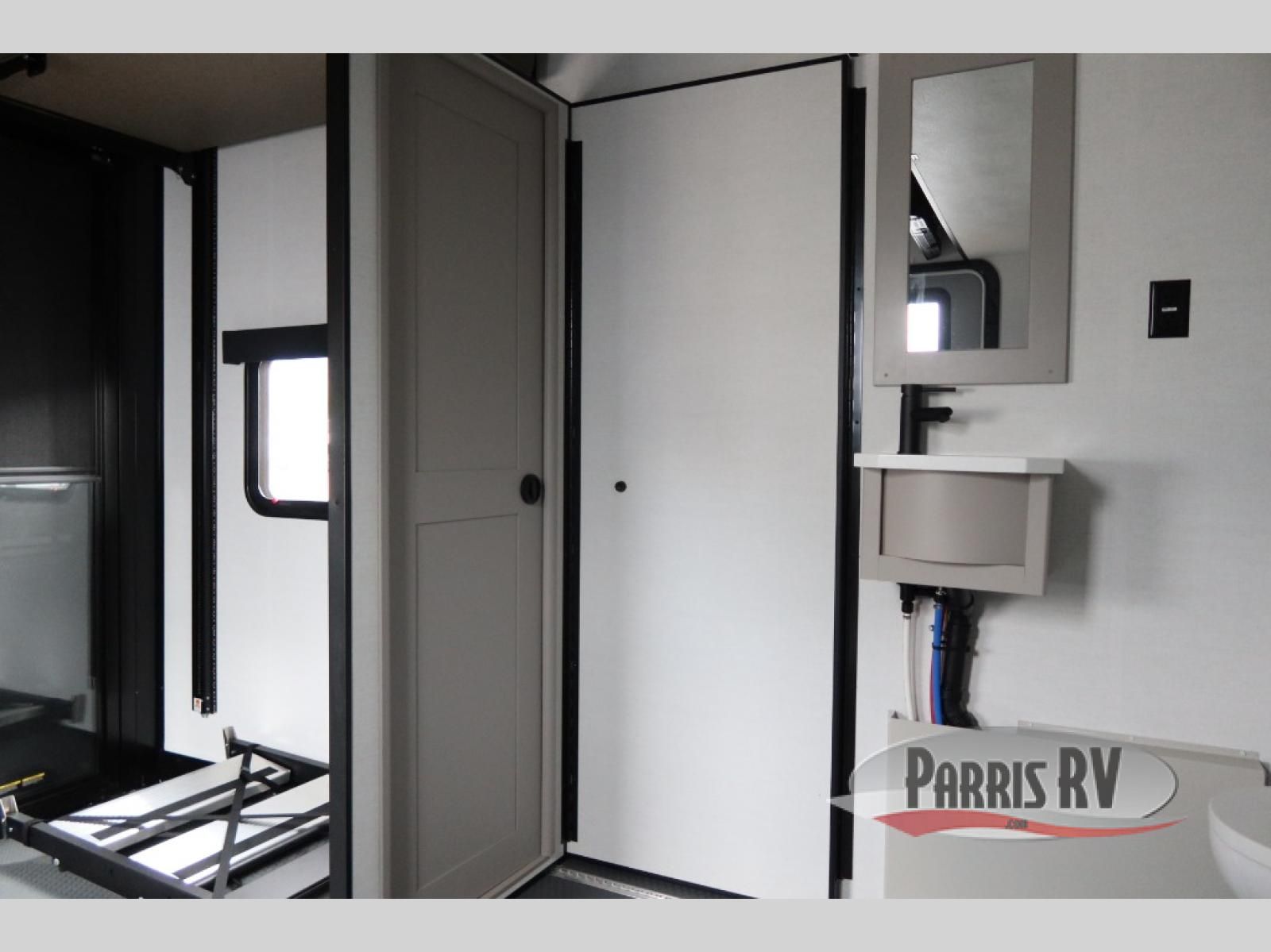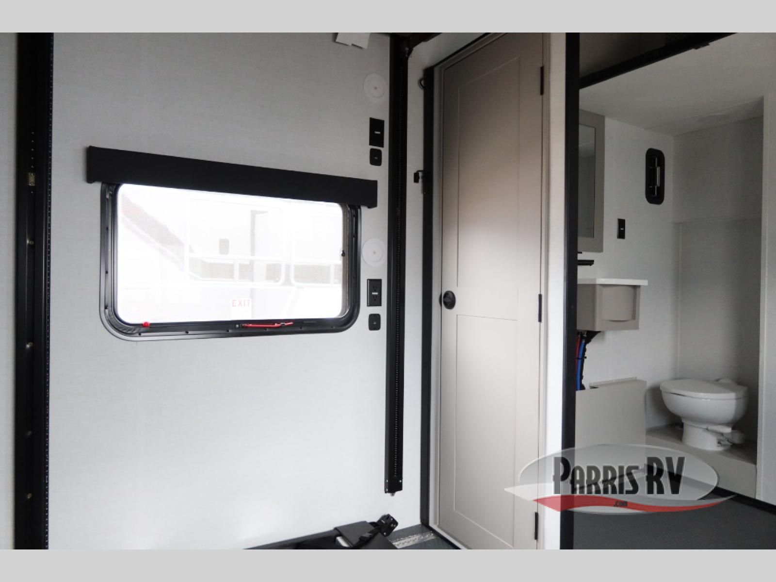 This spacious toy hauler will be perfect for weekend trips to the lake or woods! Once you've unloaded your toys from the 11' separate garage, you can relax on the 60" dual opposing sofas or set up the HappiJac bed for guests if it's getting late. There is also a 30" x 72" bunk/loft bed above the garage, a 40" garage TV, and a half bath for added convenience. As you head into the kitchen area, you'll find ample counter space to prep meals, along with a buffet, a spacious pantry and a 12V refrigerator for perishables. You can dine together at the dinette with chairs, then head to the L-shaped sofa across from the fireplace and 65" TV for movie night. The full bath includes an entrance from the hallway and into the front master bedroom. Here, you'll enjoy a king bed slide out, a flip-up dresser with a 32" TV, plus a front wardrobe with washer and dryer prep if you plan to go full-time!