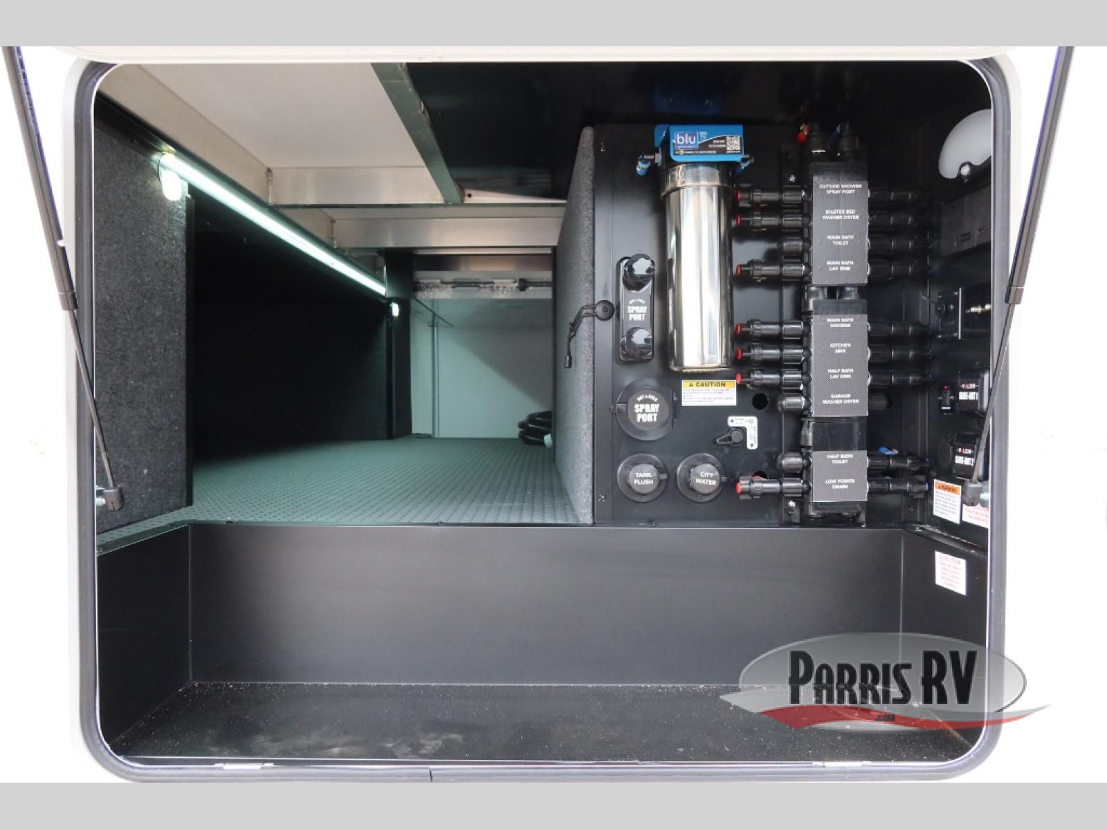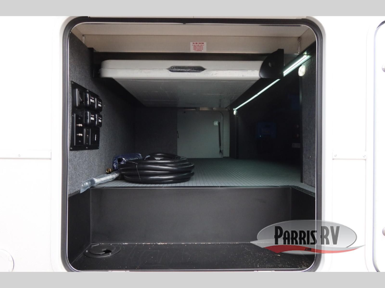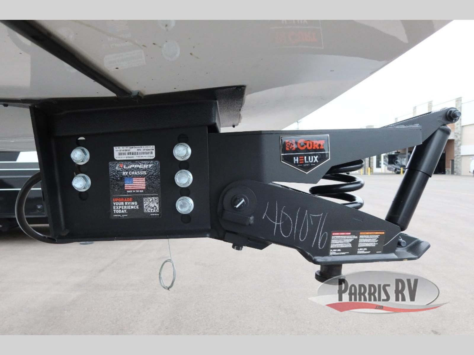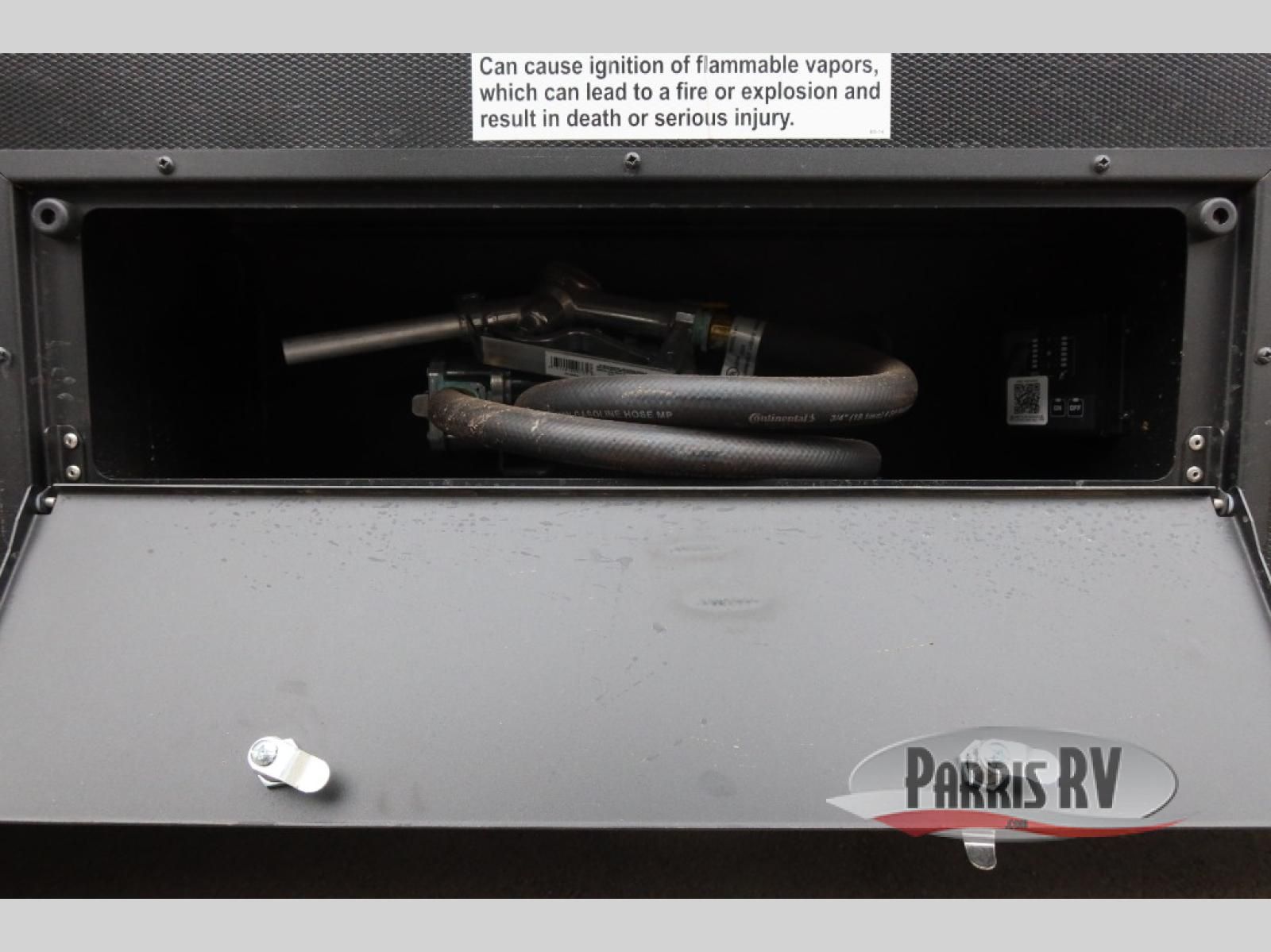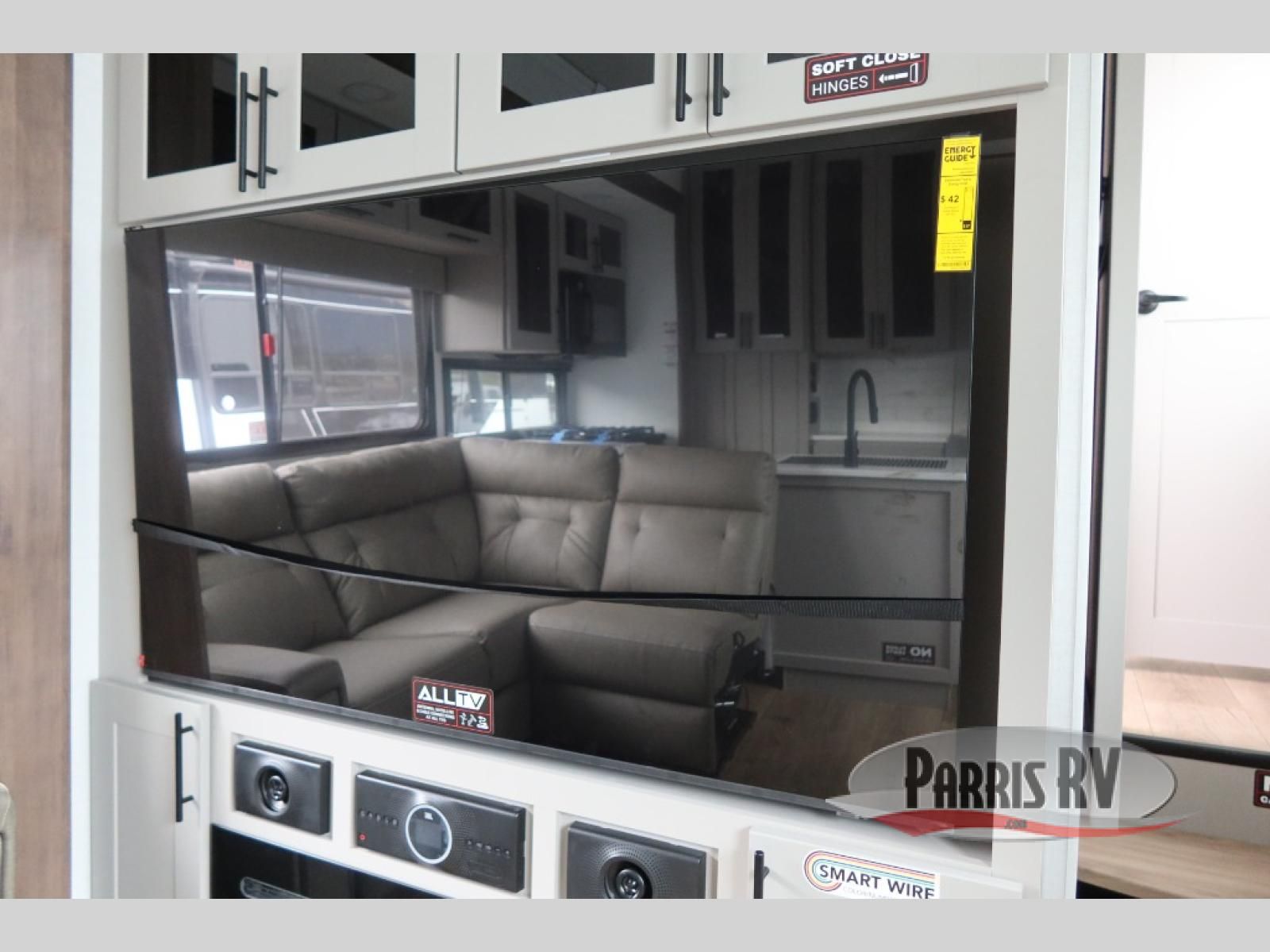 This spacious toy hauler will be perfect for weekend trips to the lake or woods! Once you've unloaded your toys from the 11' separate garage, you can relax on the 60" dual opposing sofas or set up the HappiJac bed for guests if it's getting late. There is also a 30" x 72" bunk/loft bed above the garage, a 40" garage TV, and a half bath for added convenience. As you head into the kitchen area, you'll find ample counter space to prep meals, along with a buffet, a spacious pantry and a 12V refrigerator for perishables. You can dine together at the dinette with chairs, then head to the L-shaped sofa across from the fireplace and 65" TV for movie night. The full bath includes an entrance from the hallway and into the front master bedroom. Here, you'll enjoy a king bed slide out, a flip-up dresser with a 32" TV, plus a front wardrobe with washer and dryer prep if you plan to go full-time!