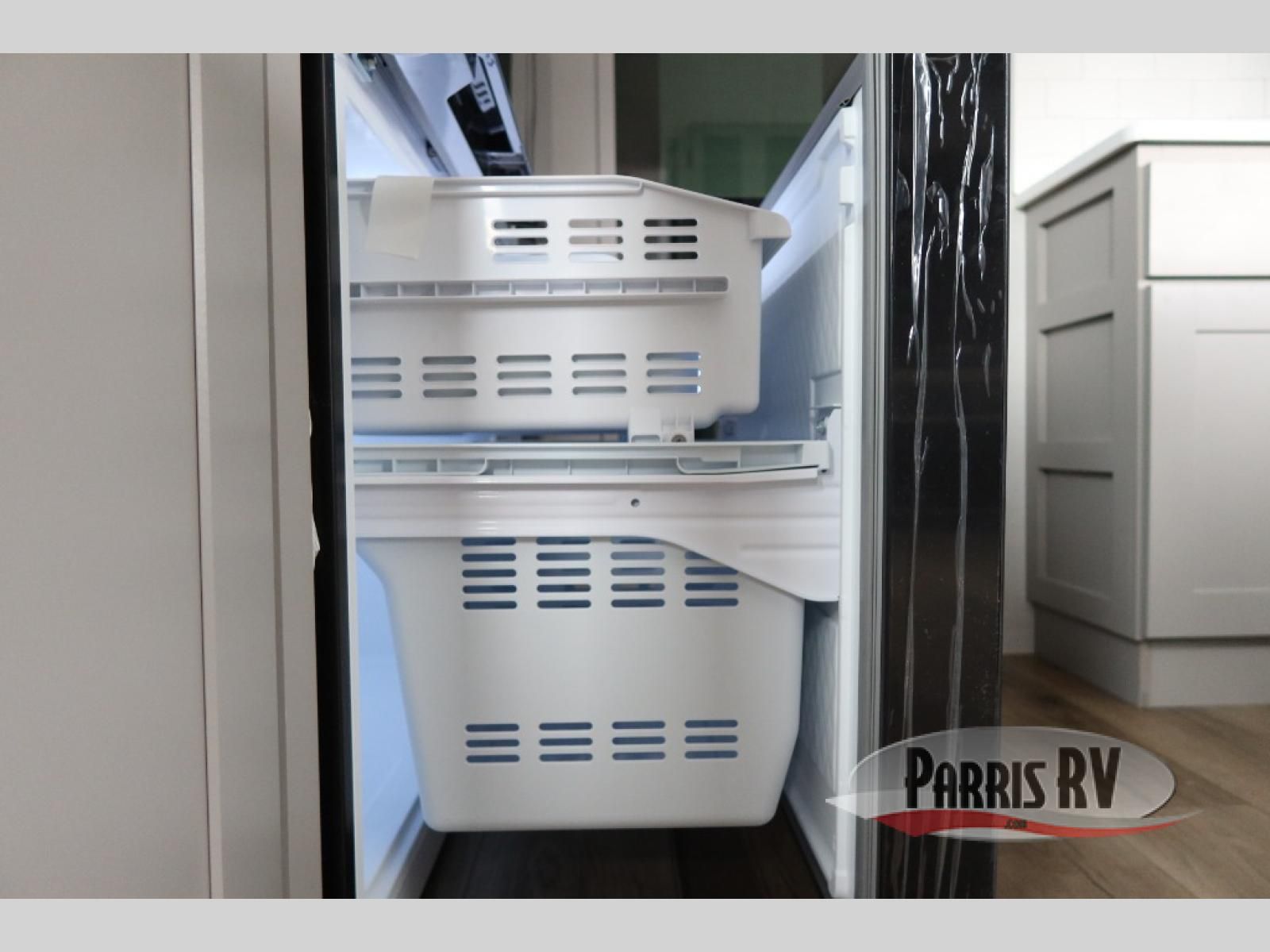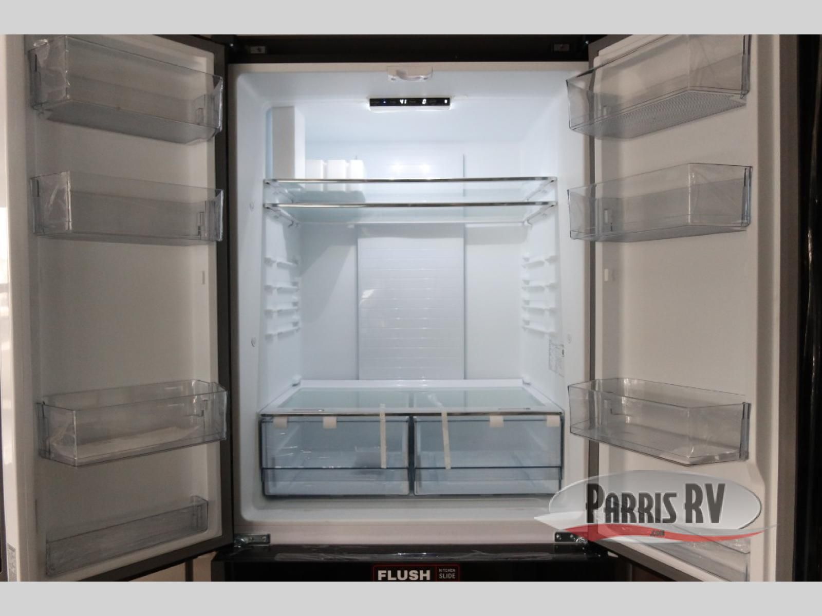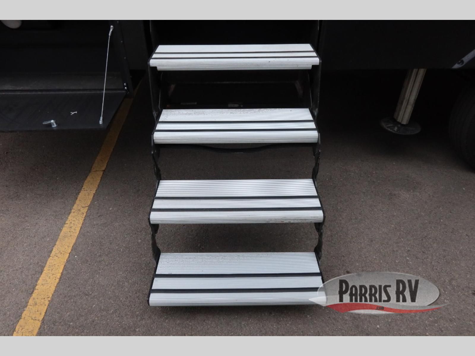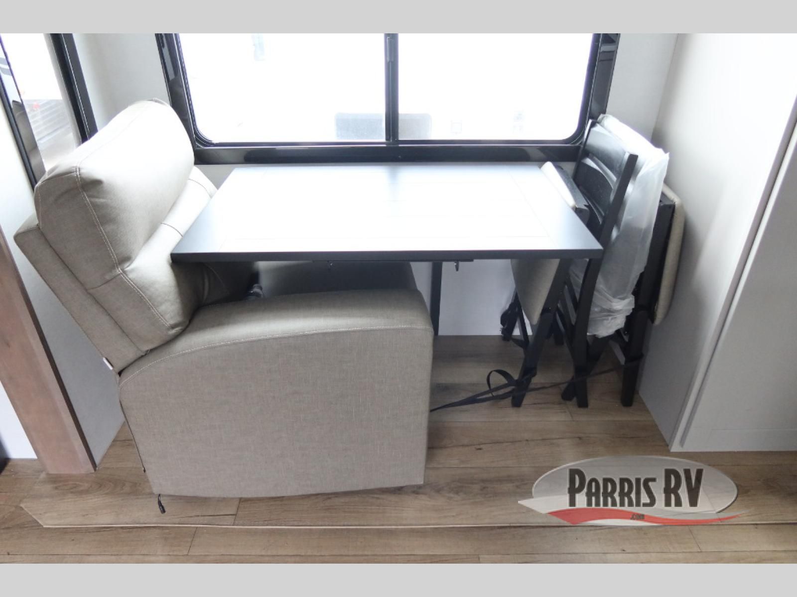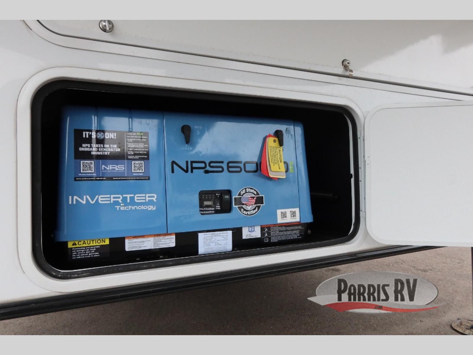 This spacious toy hauler will be perfect for weekend trips to the lake or woods! Once you've unloaded your toys from the 11' separate garage, you can relax on the 60" dual opposing sofas or set up the HappiJac bed for guests if it's getting late. There is also a 30" x 72" bunk/loft bed above the garage, a 40" garage TV, and a half bath for added convenience. As you head into the kitchen area, you'll find ample counter space to prep meals, along with a buffet, a spacious pantry and a 12V refrigerator for perishables. You can dine together at the dinette with chairs, then head to the L-shaped sofa across from the fireplace and 65" TV for movie night. The full bath includes an entrance from the hallway and into the front master bedroom. Here, you'll enjoy a king bed slide out, a flip-up dresser with a 32" TV, plus a front wardrobe with washer and dryer prep if you plan to go full-time!