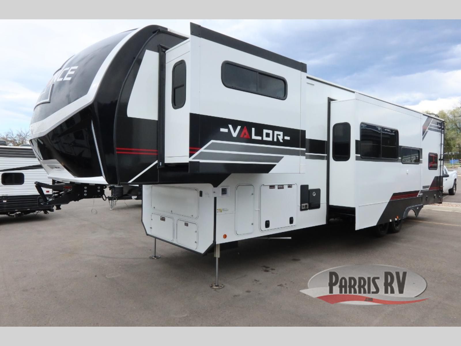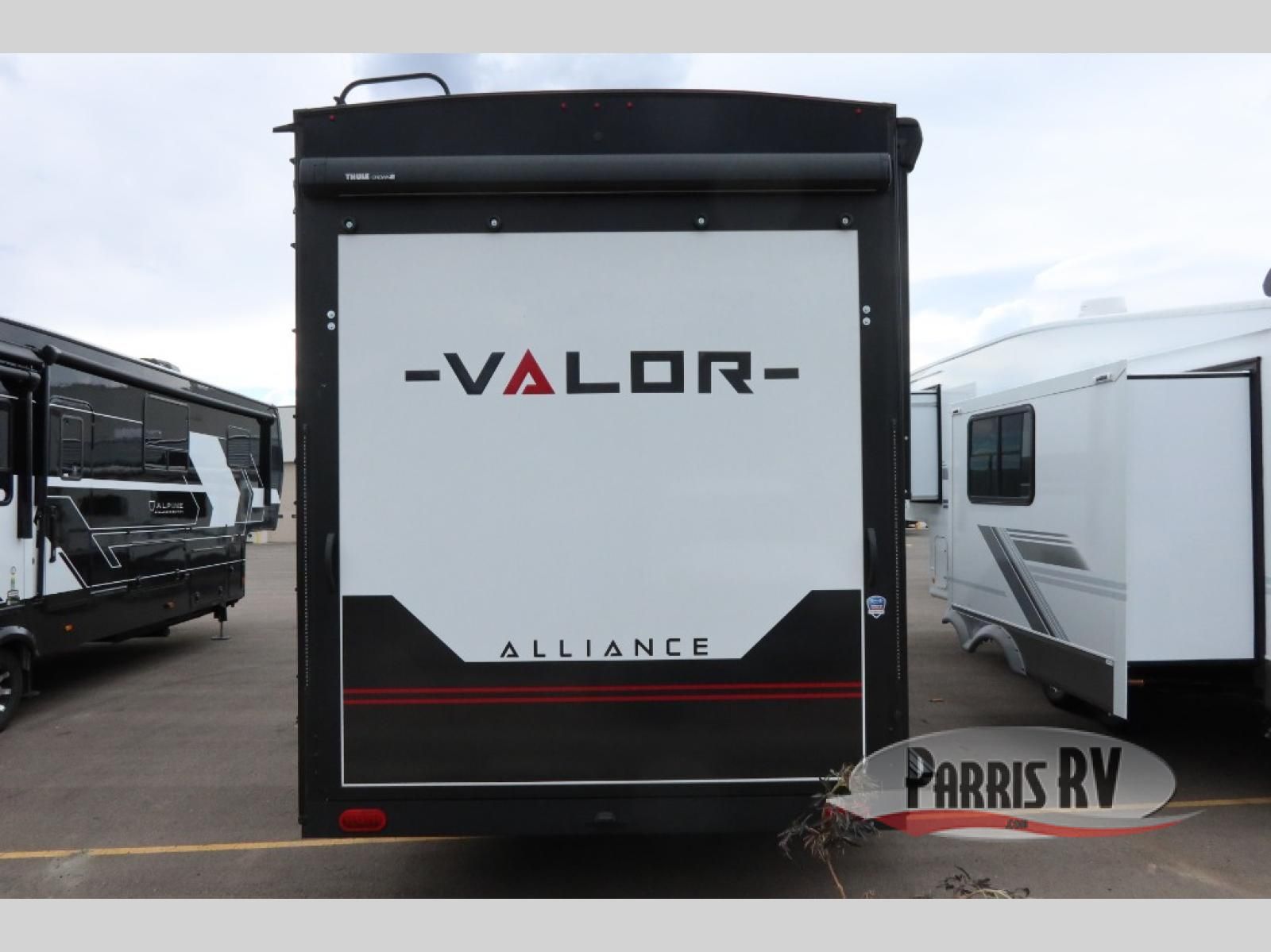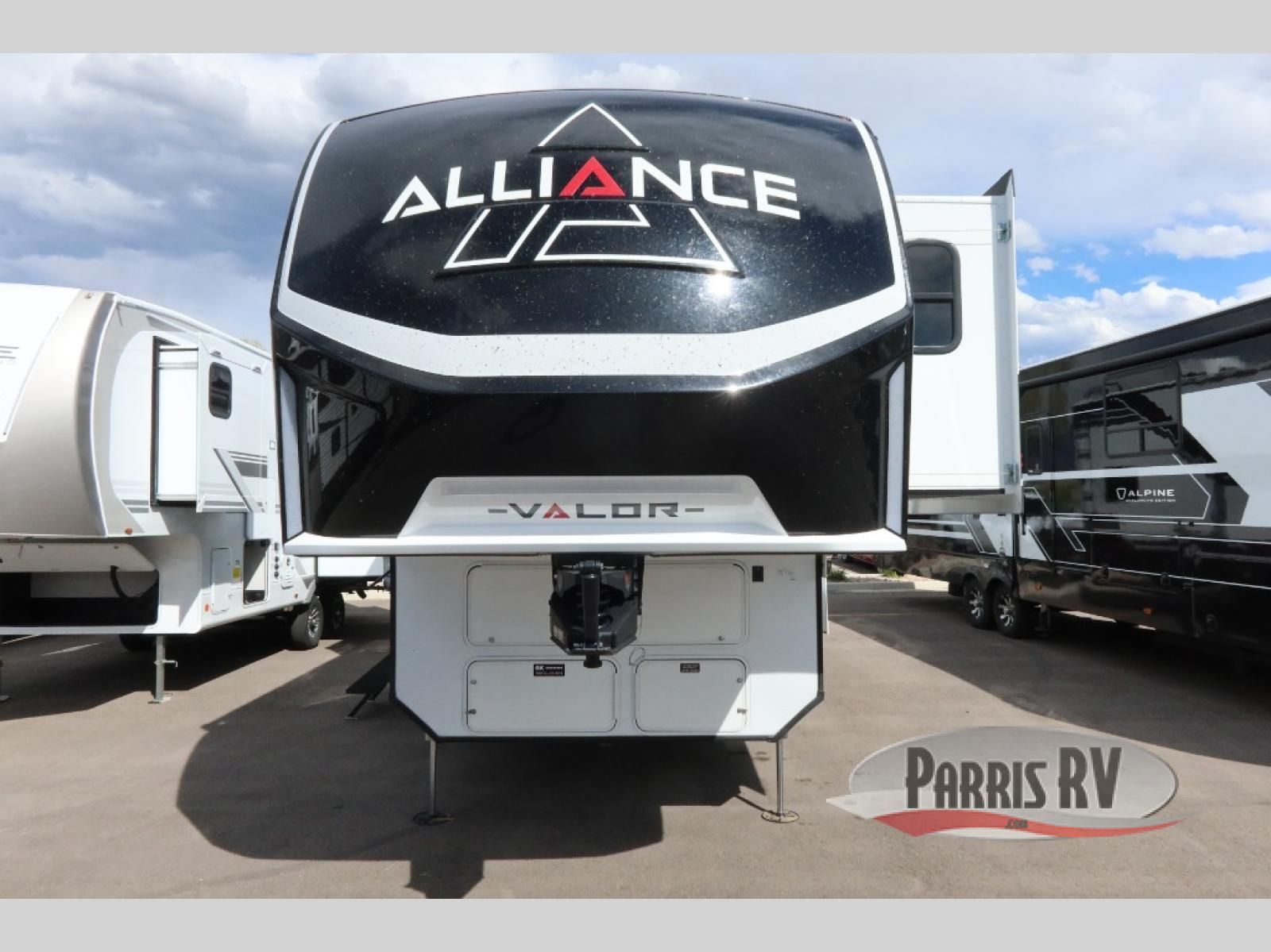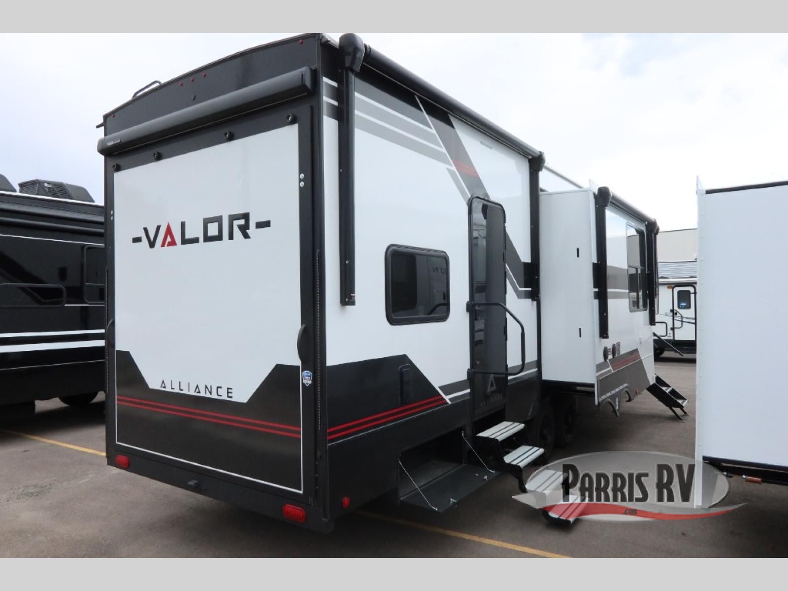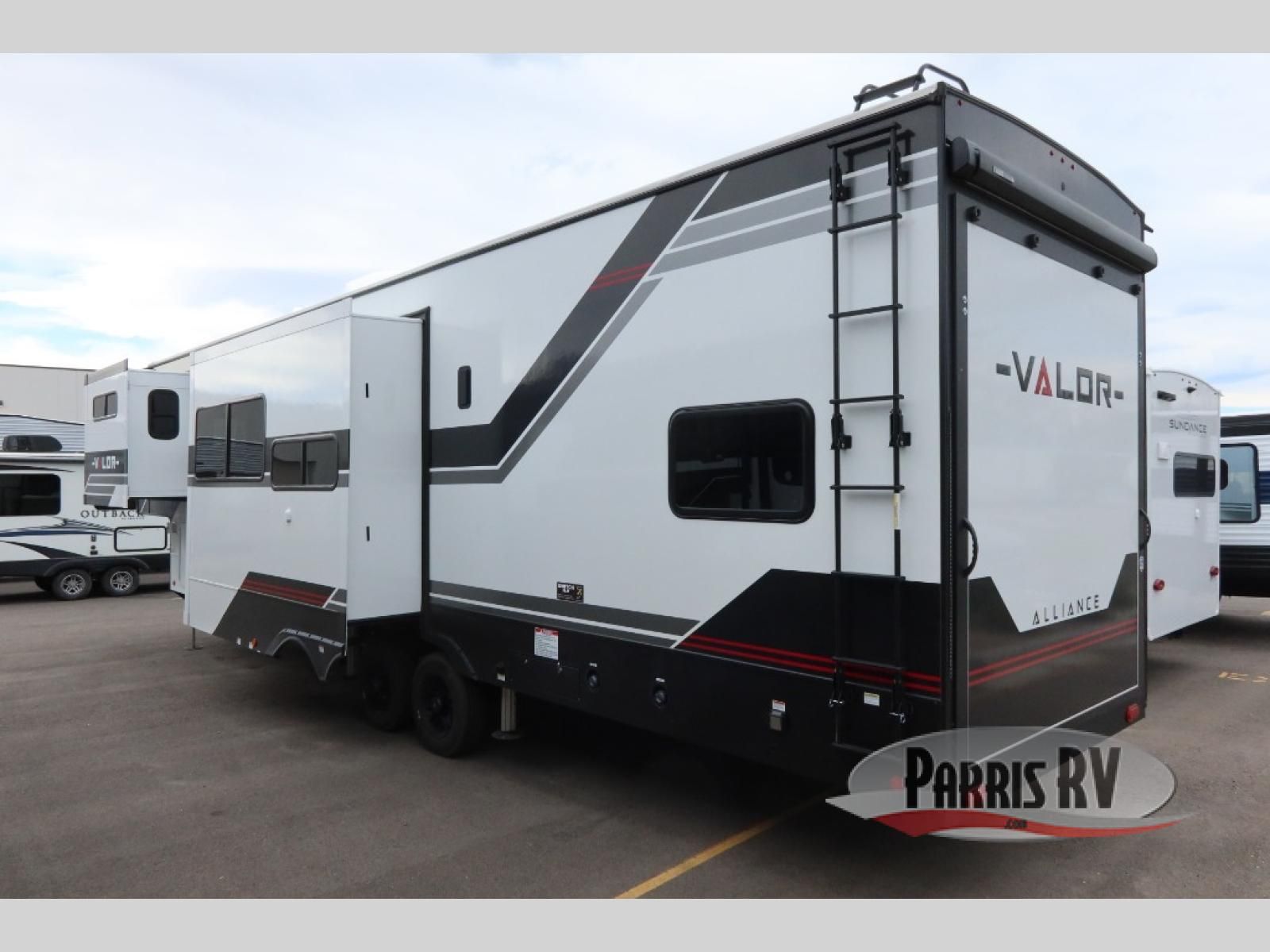 You can bring your toys with you wherever you go with any one of these Alliance RV Valor toy hauler fifth wheels! They are adventure-ready with a quality build from the walk on roof with seamless PVC roof covering to the commercial grade vinyl flooring and MorRyde CRE3000 suspension system. The Performance Running Gear package comes with a 101" wide-body benchmark chassis platform, Dexter axles, and a space enhancing drop frame storage compartment to pack in all your riding gear. You can even go off-gridding thanks to the Off the Grid Pack that has two 400-watt solar panels, generator prep, a 60-amp charge controller, and a 100-amp hour lithium iron phosphate battery. Some of the interior comforts you will enjoy are the hardwood cabinet doors and drawers, solid surface kitchen countertops, and commercial grade vinyl flooring with no carpet to make clean up a breeze. The Valor toy haulers are also the Masters of 12 Volt with USB charging station throughout, a 12V refrigerator, and more 12-volt features to make camping hassle-free!