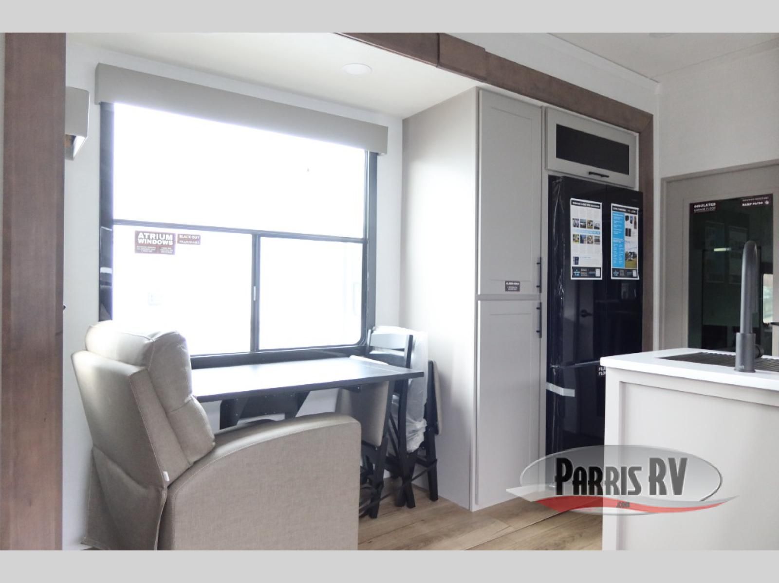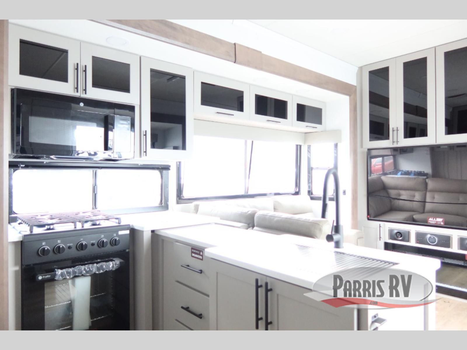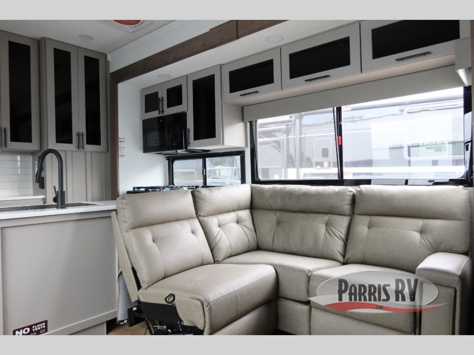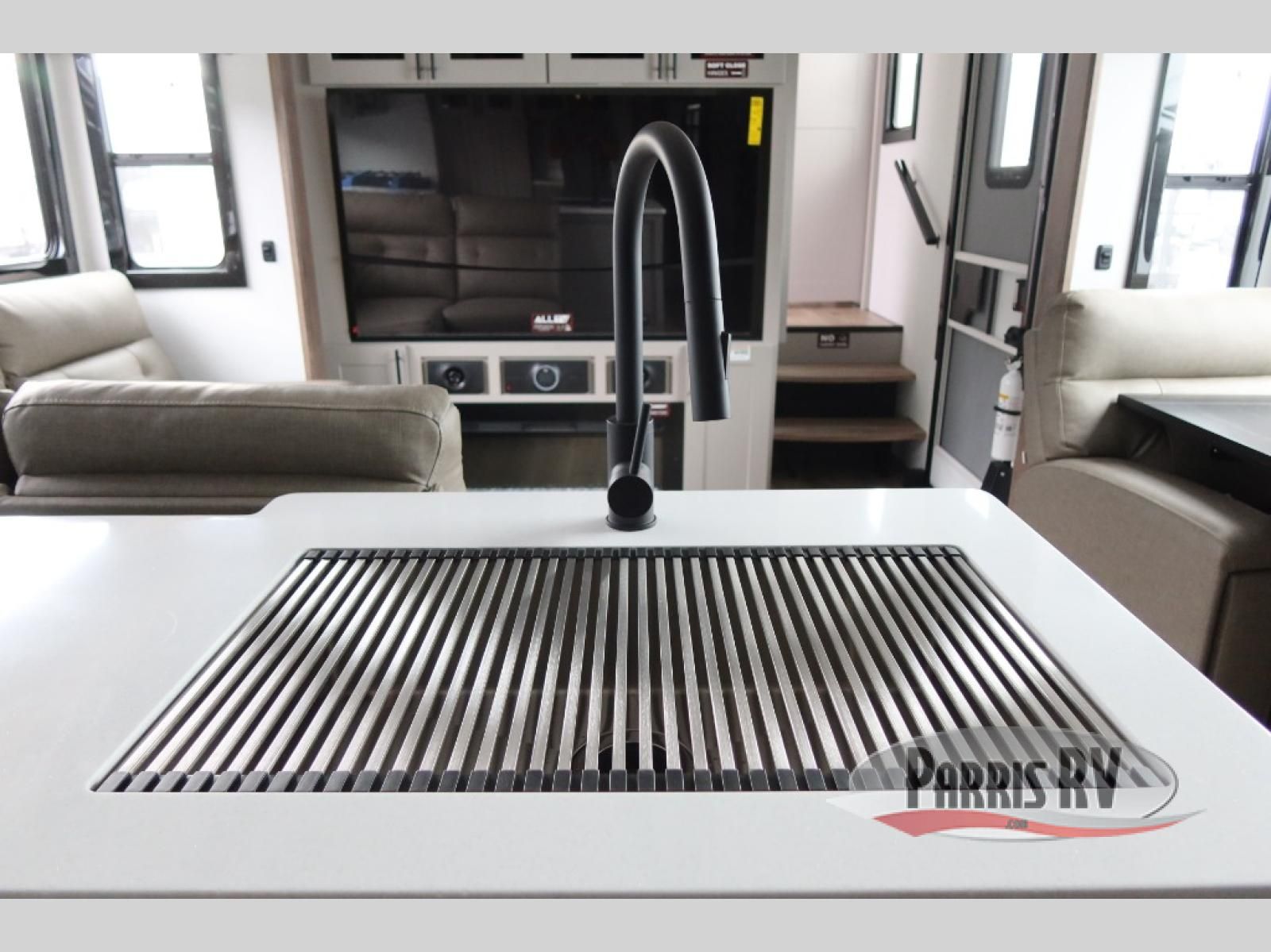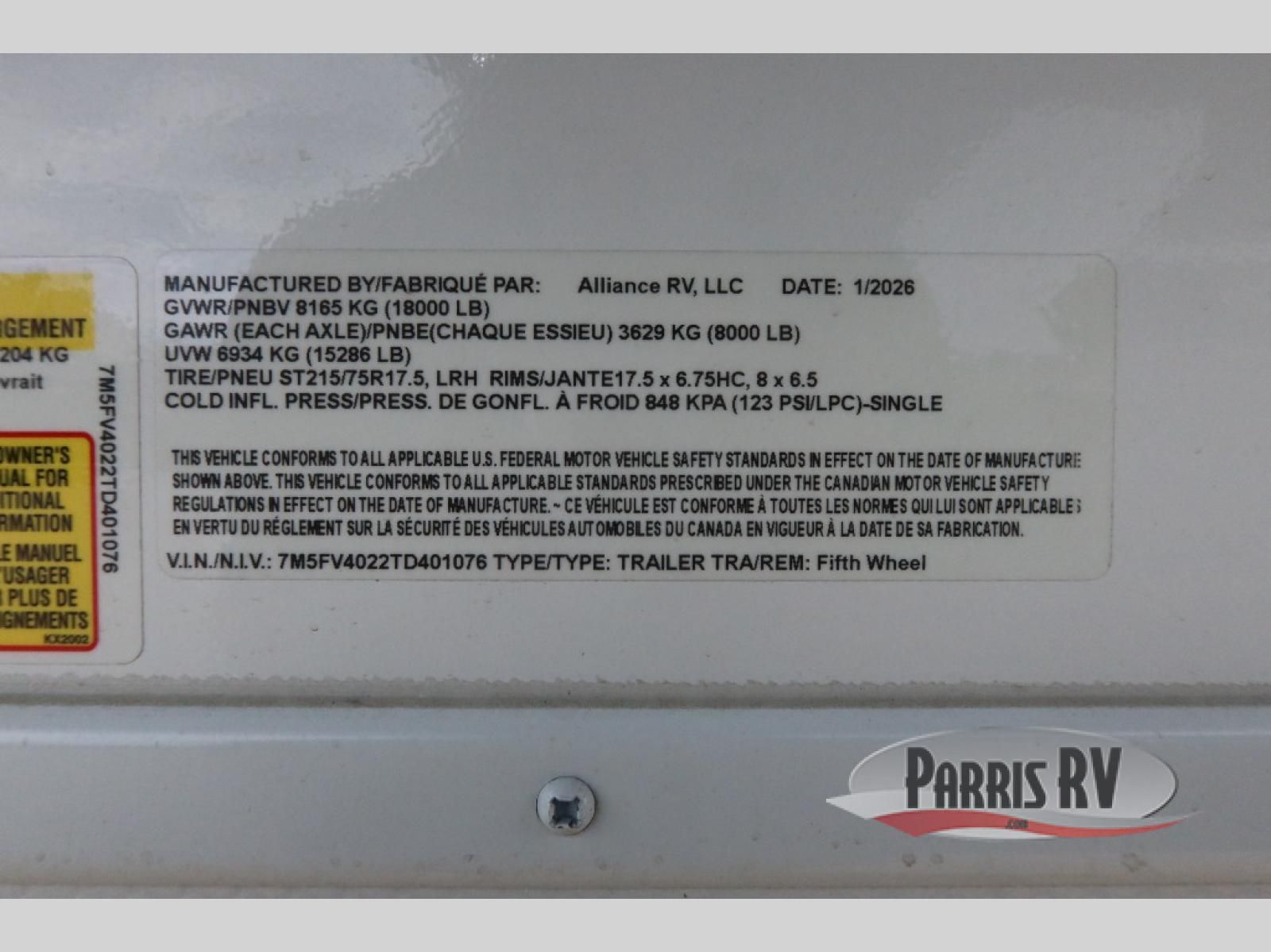 You can bring your toys with you wherever you go with any one of these Alliance RV Valor toy hauler fifth wheels! They are adventure-ready with a quality build from the walk on roof with seamless PVC roof covering to the commercial grade vinyl flooring and MorRyde CRE3000 suspension system. The Performance Running Gear package comes with a 101" wide-body benchmark chassis platform, Dexter axles, and a space enhancing drop frame storage compartment to pack in all your riding gear. You can even go off-gridding thanks to the Off the Grid Pack that has two 400-watt solar panels, generator prep, a 60-amp charge controller, and a 100-amp hour lithium iron phosphate battery. Some of the interior comforts you will enjoy are the hardwood cabinet doors and drawers, solid surface kitchen countertops, and commercial grade vinyl flooring with no carpet to make clean up a breeze. The Valor toy haulers are also the Masters of 12 Volt with USB charging station throughout, a 12V refrigerator, and more 12-volt features to make camping hassle-free!