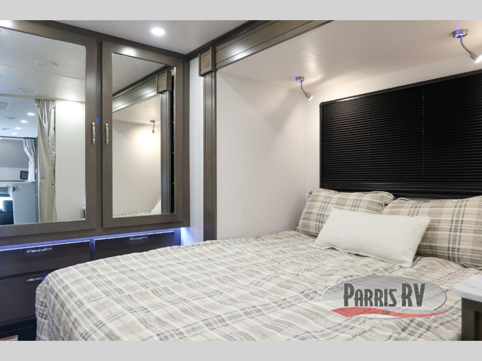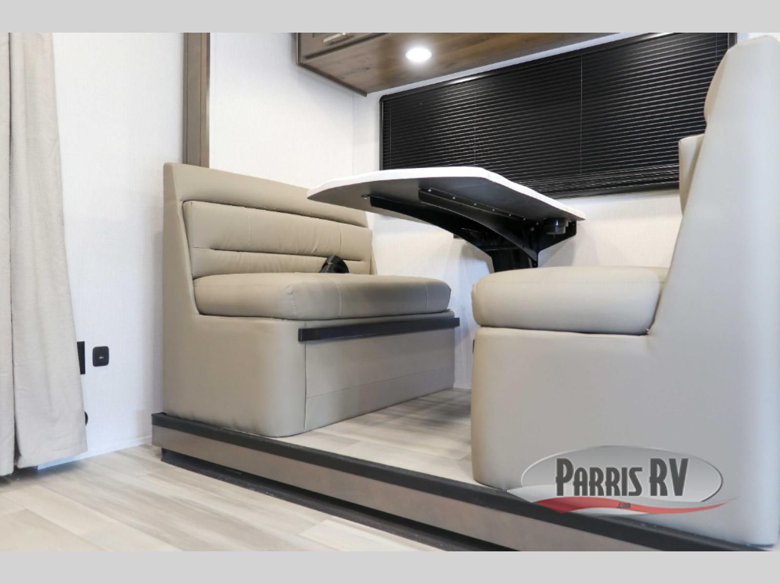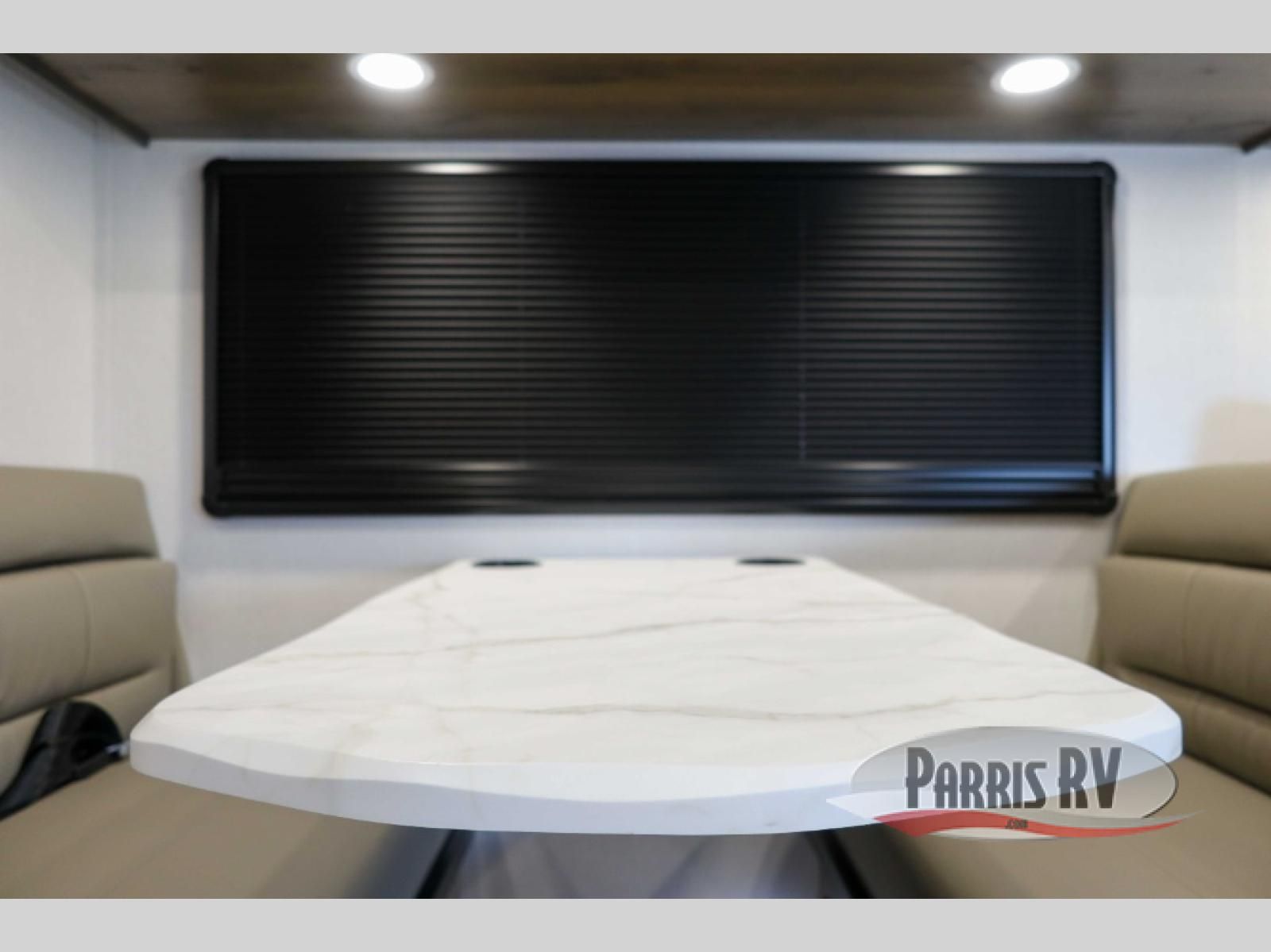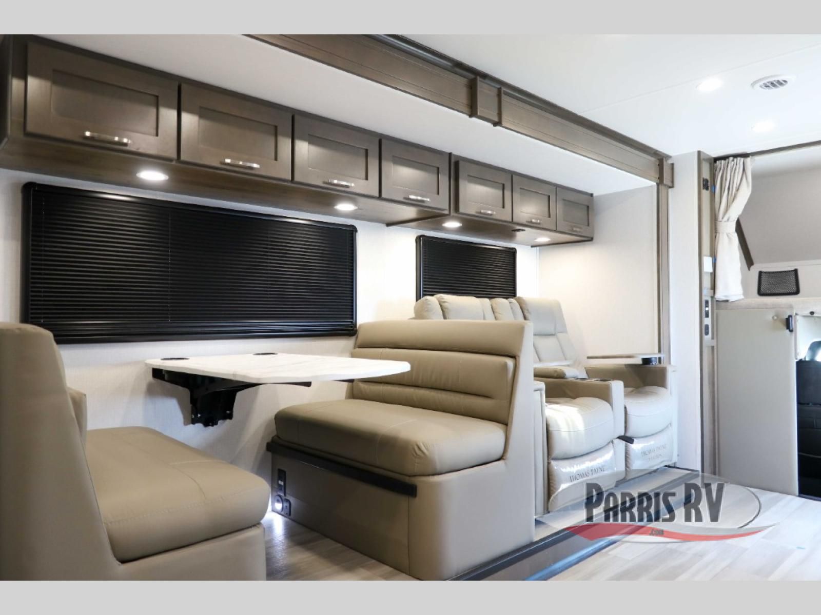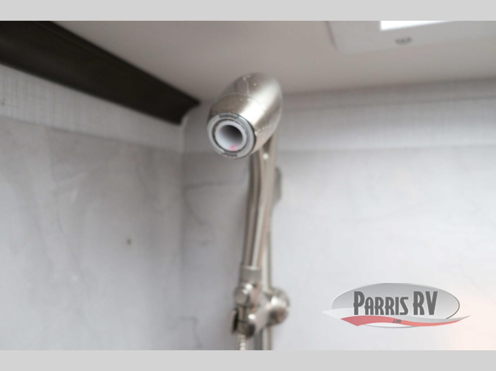 You will have plenty of space to walk about this motorhome with the dual slides! The booth dinette and sofa slide create an open concept living area and the sofa can be replaced for the optional theater seating if you prefer that instead. Freshen up after a long day of traveling in the rear corner bathroom with the designer shower that has a skylight above for more natural lighting and an Oxygenics body spa RV shower head for a more relaxing shower. Put on your comfy clothes stored in the wardrobe in the rear corner private bedroom then either lay on the 60" x 75" gel-infused memory foam mattress while you watch a movie on the 32" LED smart TV or head to the kitchen and whip up a meal with the three burner gas range and countertop extension. You could even head outside and watch a movie on the exterior 32" TV underneath the 16' dual-pitch armless awning!