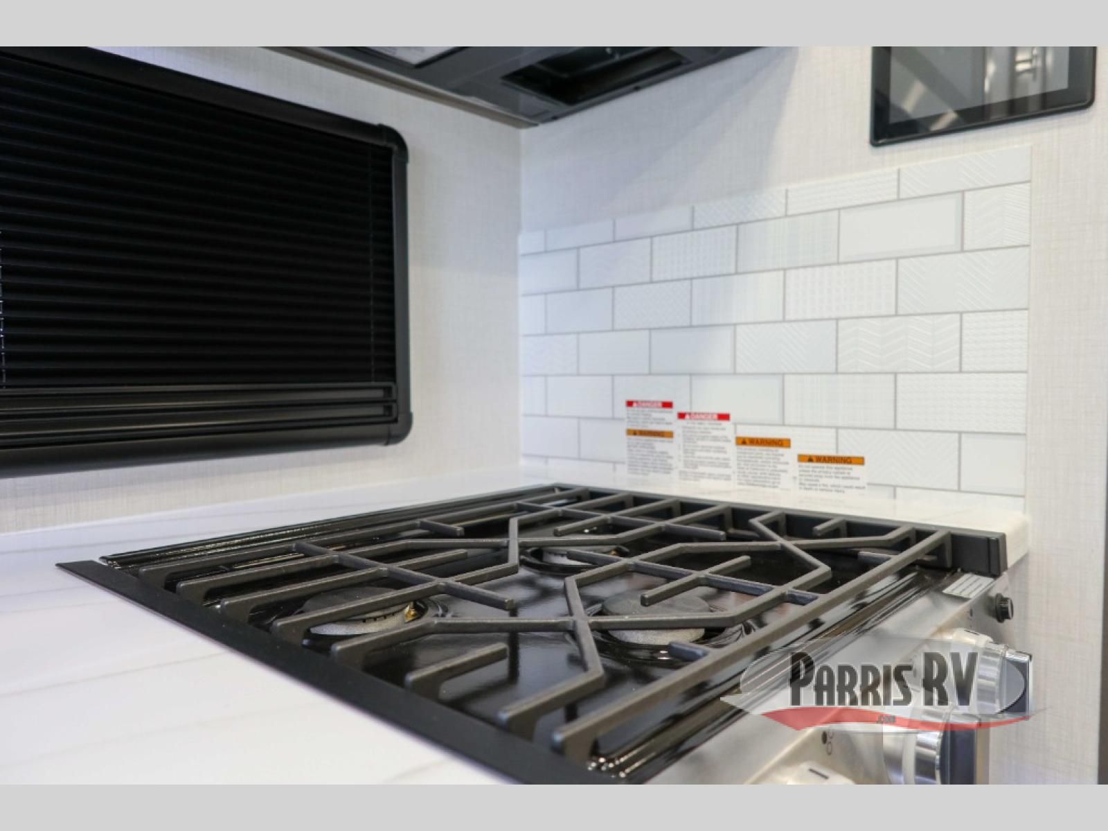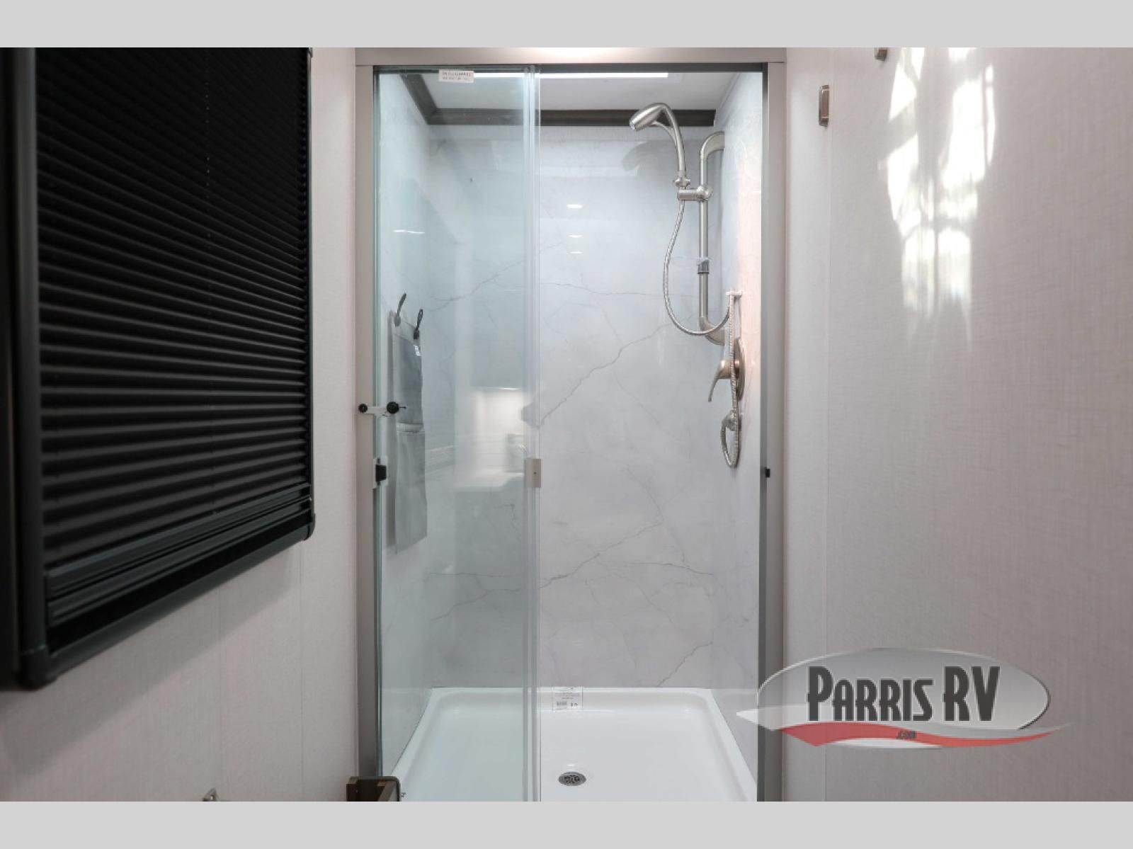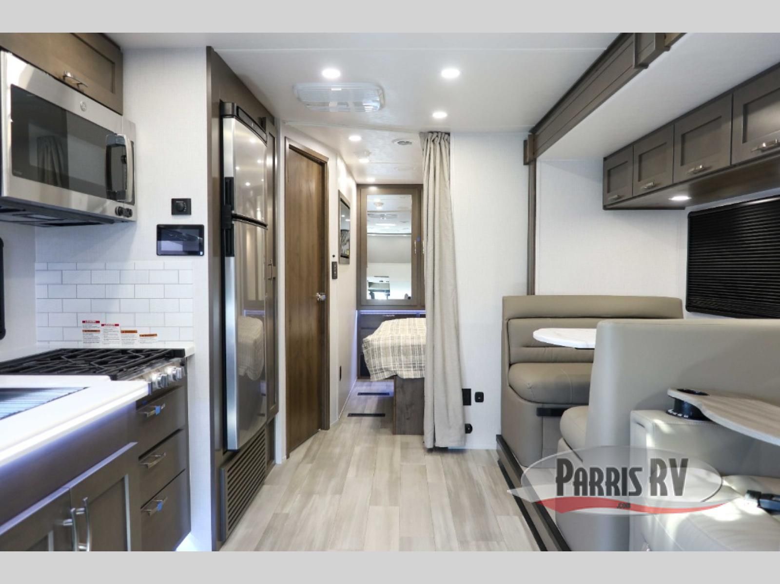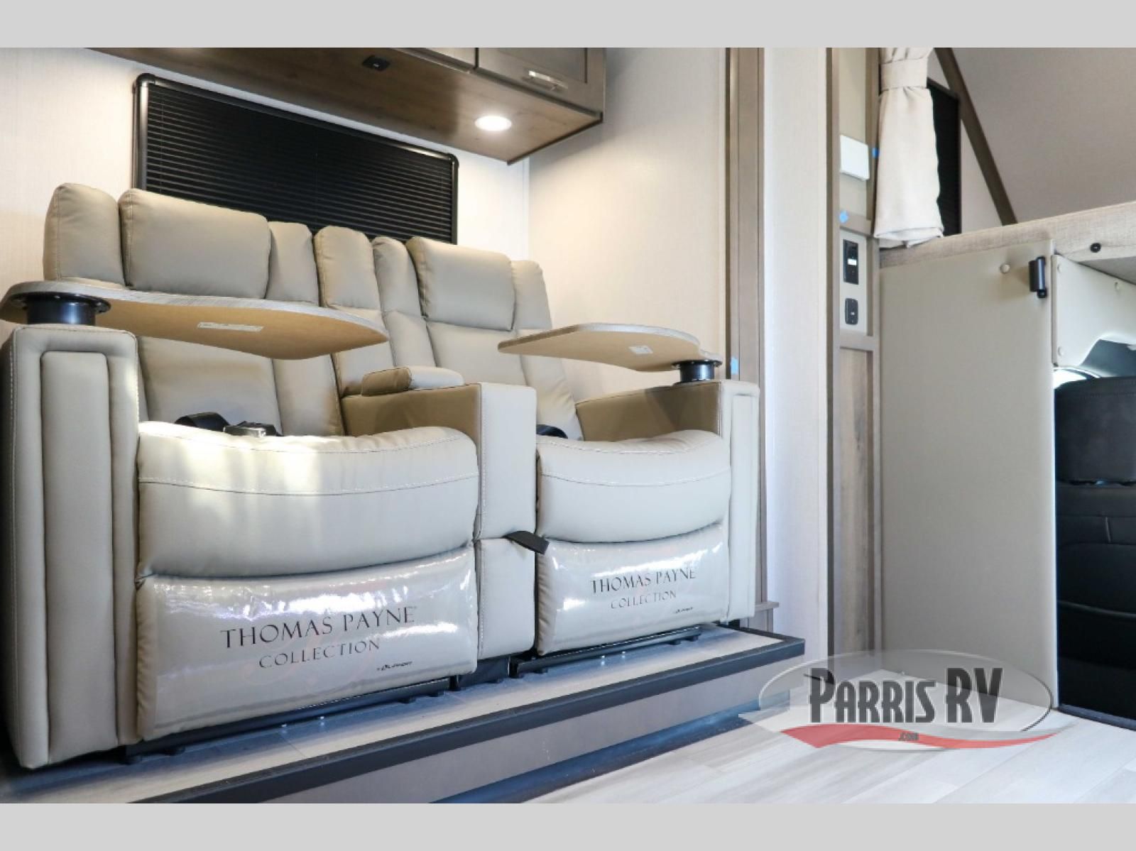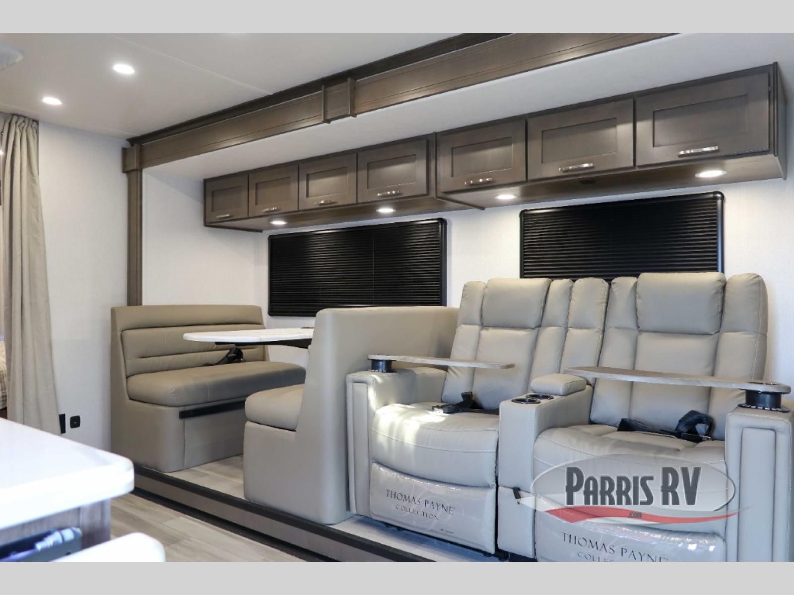 You will have plenty of space to walk about this motorhome with the dual slides! The booth dinette and sofa slide create an open concept living area and the sofa can be replaced for the optional theater seating if you prefer that instead. Freshen up after a long day of traveling in the rear corner bathroom with the designer shower that has a skylight above for more natural lighting and an Oxygenics body spa RV shower head for a more relaxing shower. Put on your comfy clothes stored in the wardrobe in the rear corner private bedroom then either lay on the 60" x 75" gel-infused memory foam mattress while you watch a movie on the 32" LED smart TV or head to the kitchen and whip up a meal with the three burner gas range and countertop extension. You could even head outside and watch a movie on the exterior 32" TV underneath the 16' dual-pitch armless awning!