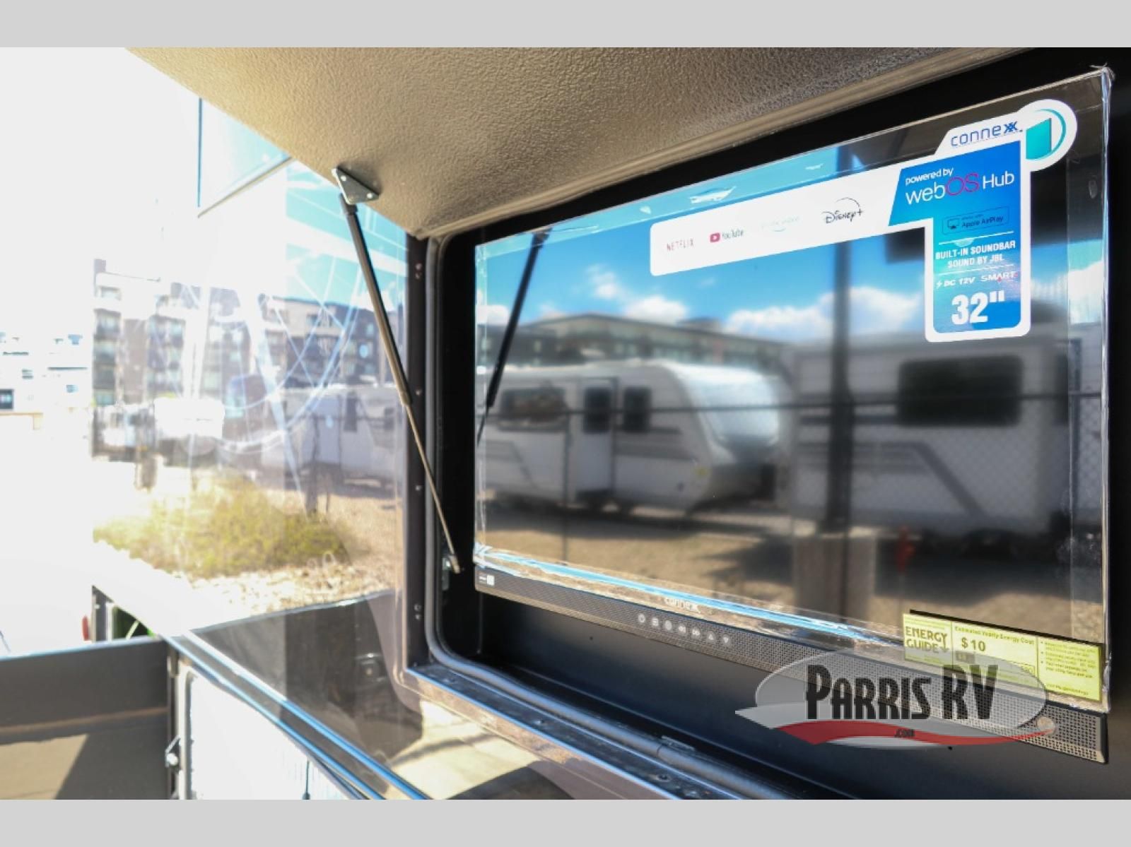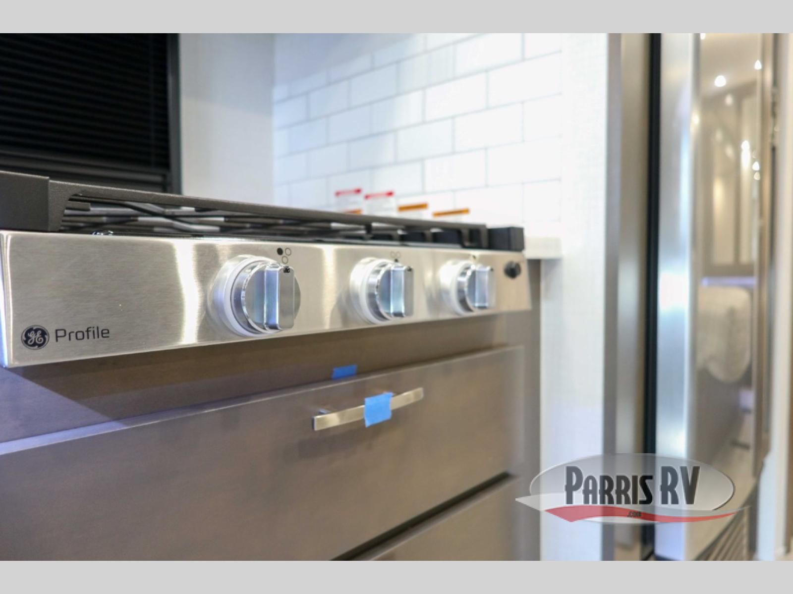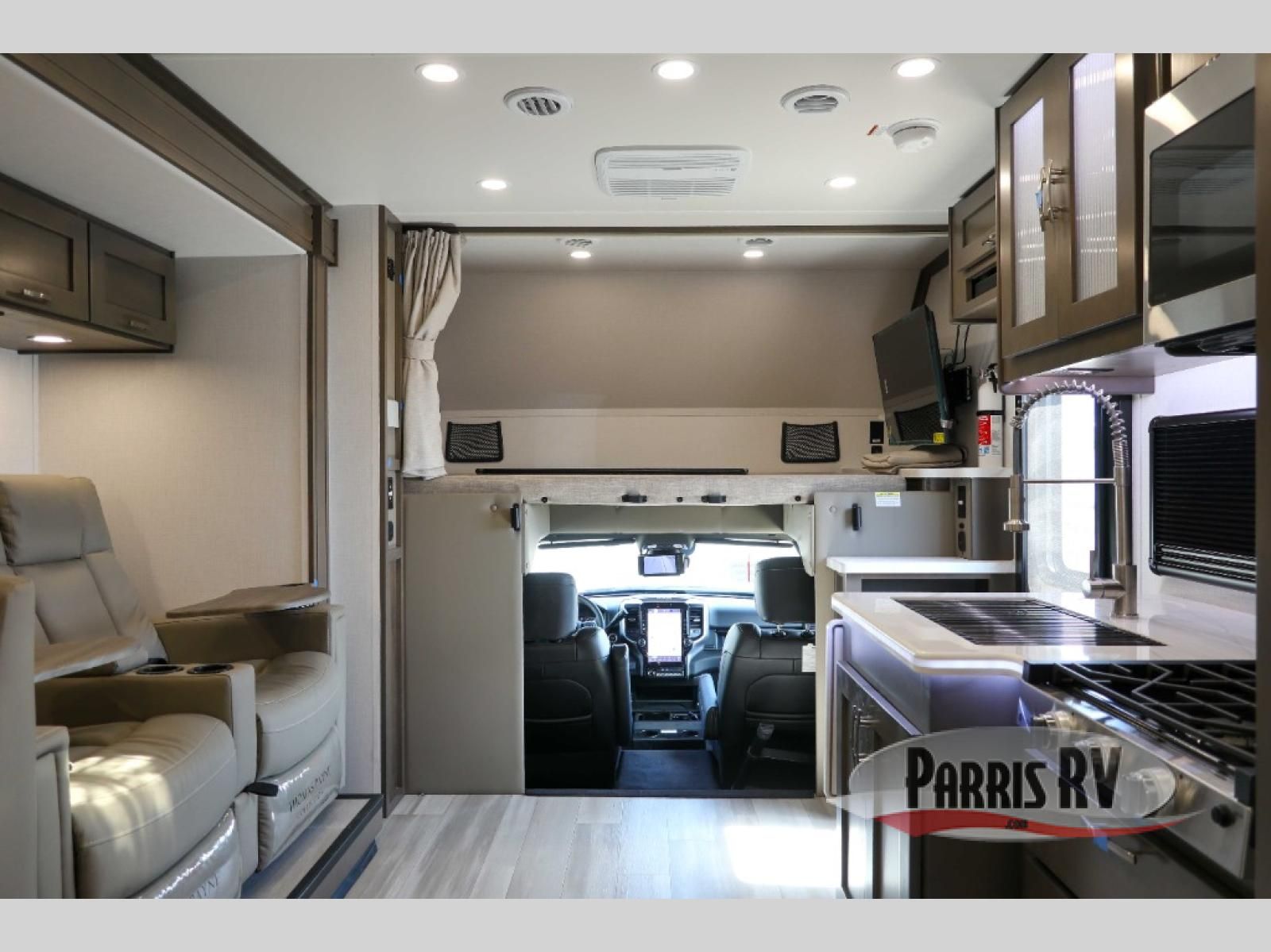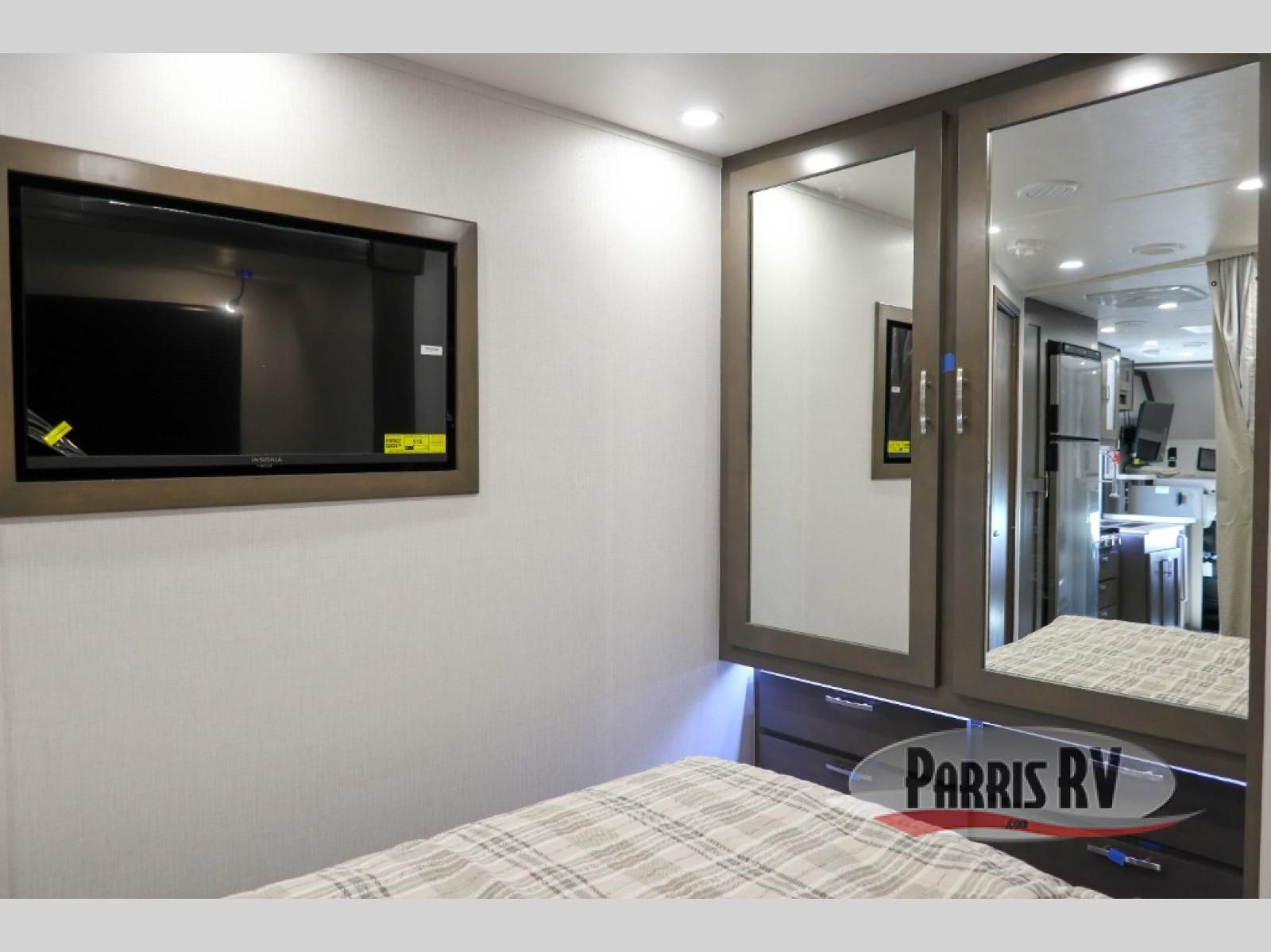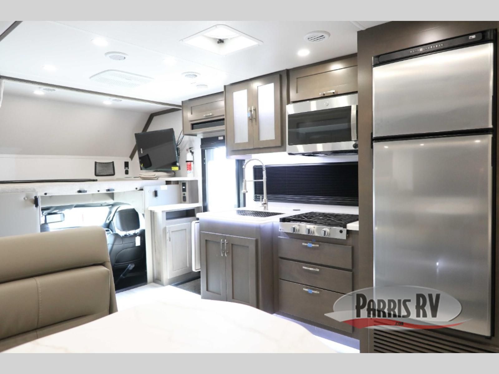 You will have plenty of space to walk about this motorhome with the dual slides! The booth dinette and sofa slide create an open concept living area and the sofa can be replaced for the optional theater seating if you prefer that instead. Freshen up after a long day of traveling in the rear corner bathroom with the designer shower that has a skylight above for more natural lighting and an Oxygenics body spa RV shower head for a more relaxing shower. Put on your comfy clothes stored in the wardrobe in the rear corner private bedroom then either lay on the 60" x 75" gel-infused memory foam mattress while you watch a movie on the 32" LED smart TV or head to the kitchen and whip up a meal with the three burner gas range and countertop extension. You could even head outside and watch a movie on the exterior 32" TV underneath the 16' dual-pitch armless awning!