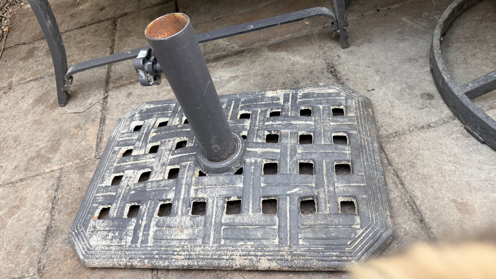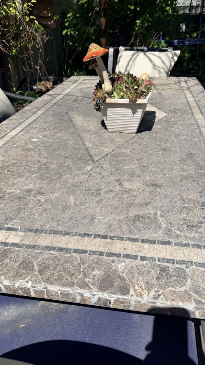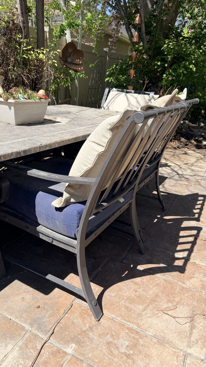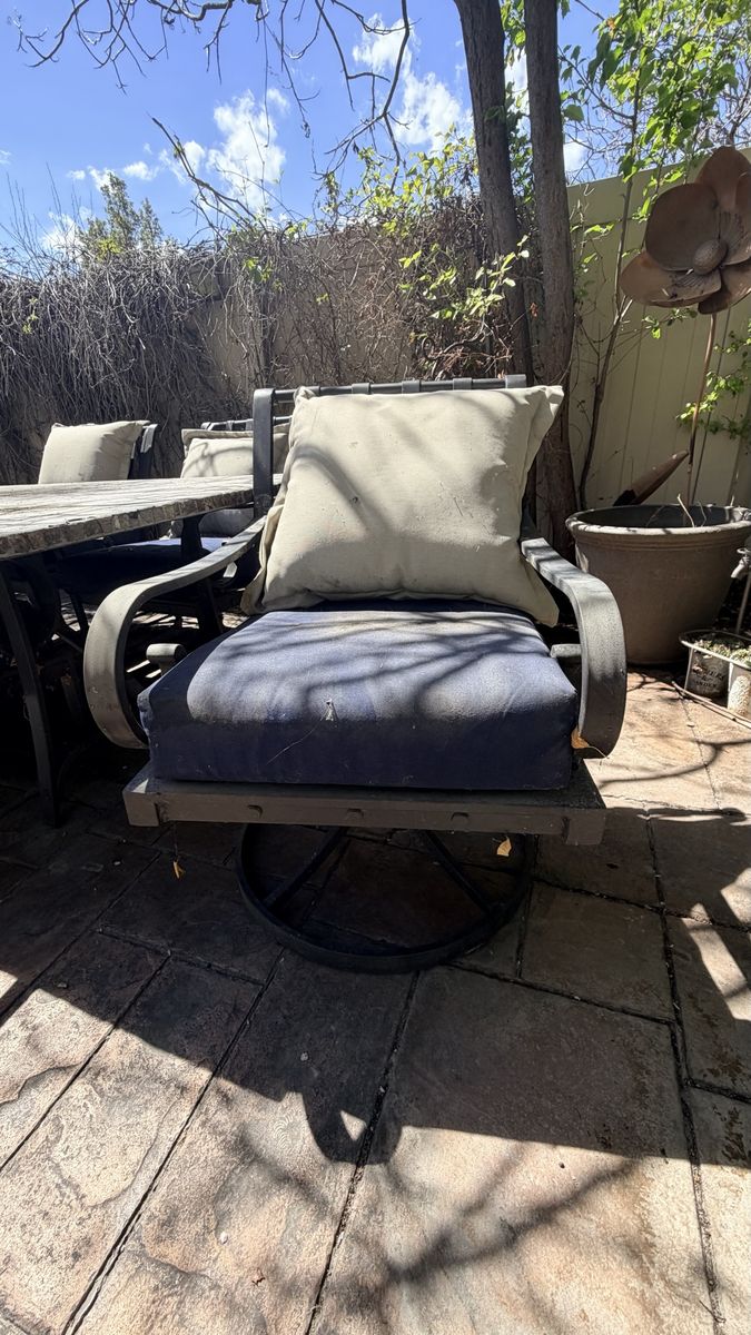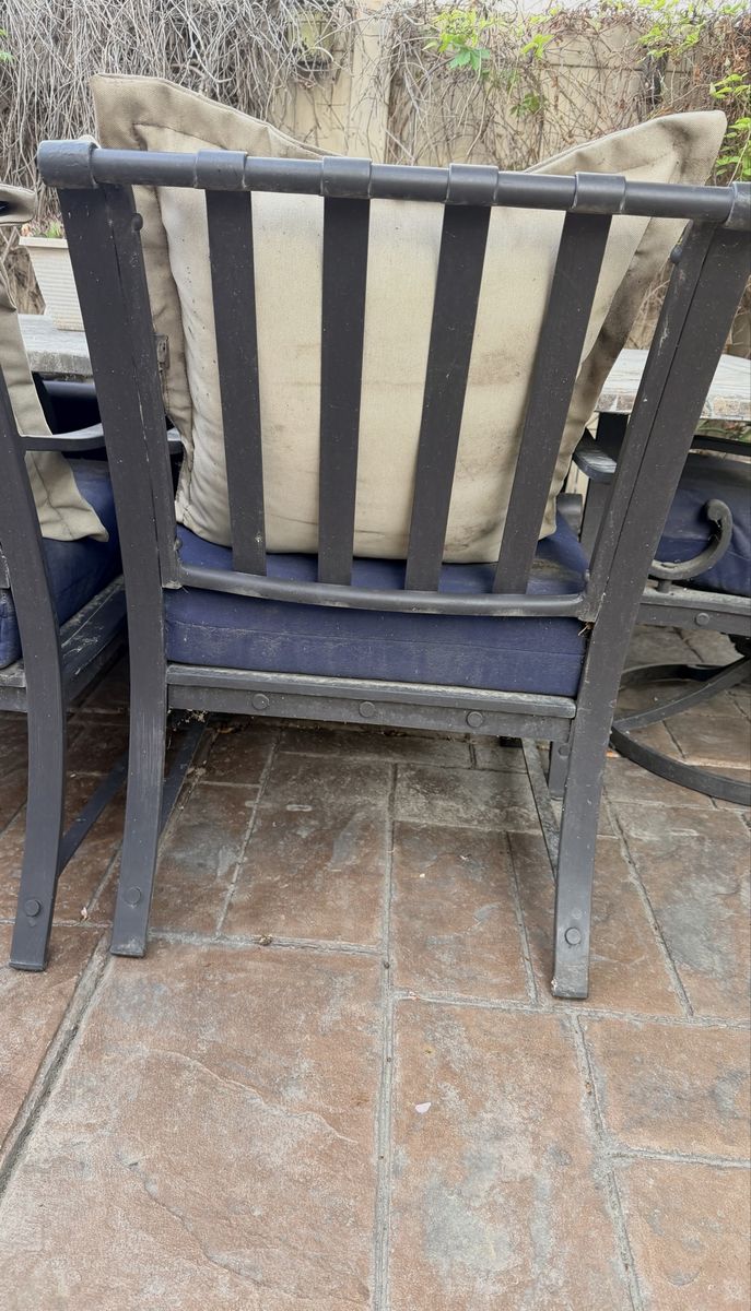 VenmoThis set is extremely well built and durable. Chairs are oversized, 2 with swivel Rockers, 4 without. The frame is solid cast aluminum with a powder finish to withstand rust.The cushions are sunbrella navy blue and beige. The table and cushions need a good hose down. They have some minor fading and a few stains from trees. The top is a beautiful stone marble . bty table is heavy.. The umbrella base is included as well.. If you like this set I am also selling outdoor firepit and 2 lounge chairs that are part of this set.