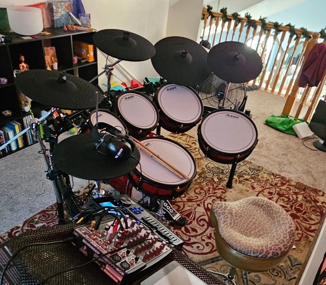 ZelleBearly used Aleses Strike Pro SE. includes DW 5000 double kick pedal and Hihat stand. Also includes a Focusrite 2 channel interface. (pictured throne not included). this kit was only set up once and has had minimal use.