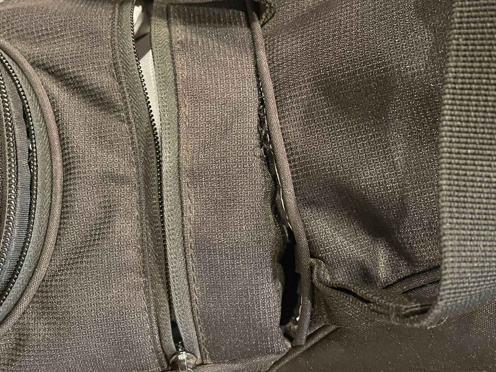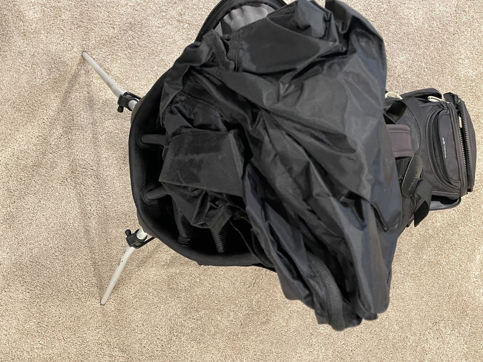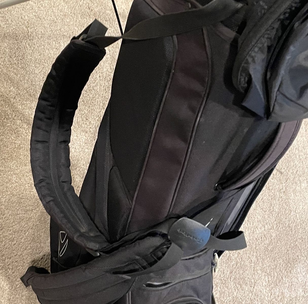 Black TaylorMade bag. Everything works fine and it has the rain cover. It does have a logo on the ball cover. Overall, it is in good shape, however, a seam separated above the storage area (last two pictures). You can reach both sides so it can probably be repaired/stitched fairly easily if you have those skills - I'm just not that handy so probably not an option for me - opting to list it here for a week before looking into repairing it.