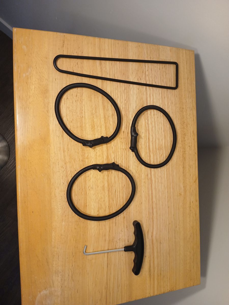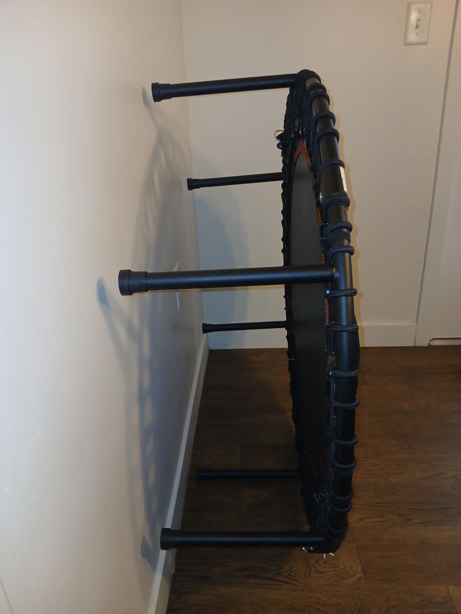 This is a lightly used rebounder that will come with 3 spare bungees AND the tools that make popping them on/off the frame easy. It does NOT come with a handle/bar.