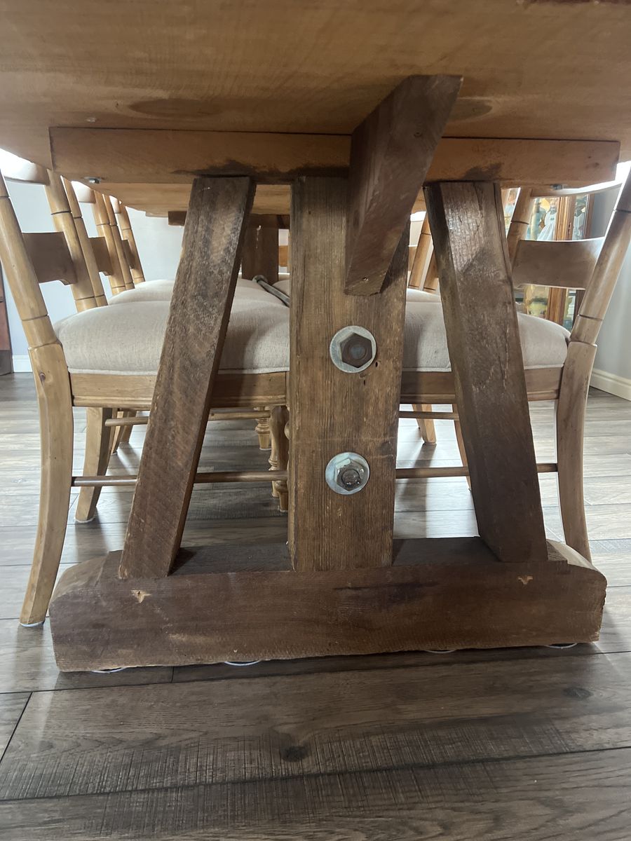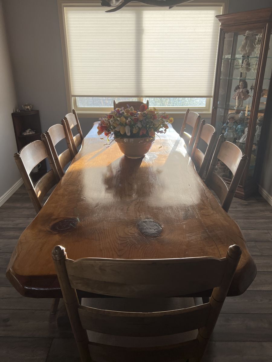 VenmoBeautiful hand crafted wood table,white pine, 9' by 38 inch, 3 inches deep, seats 8 people comfortably, chairs included, railroad trestle legs