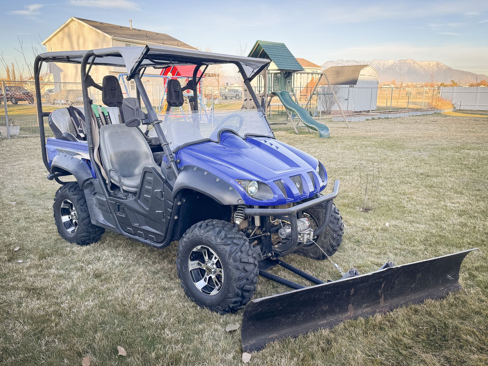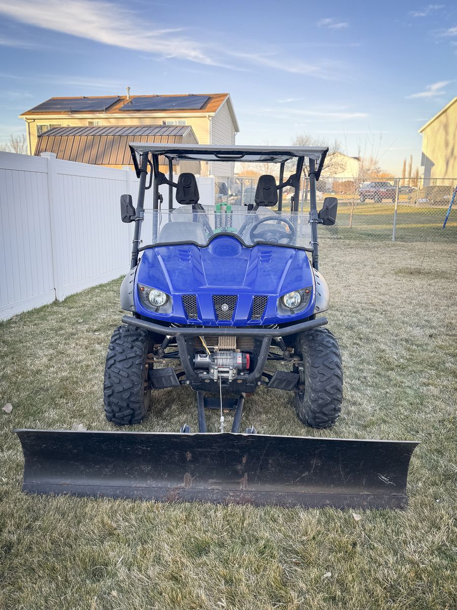 It comes with a 72” x 16” snow plow that is manually adjustable to different angles and raises and lowers using the wench. Also comes with a spare tire/wheel.